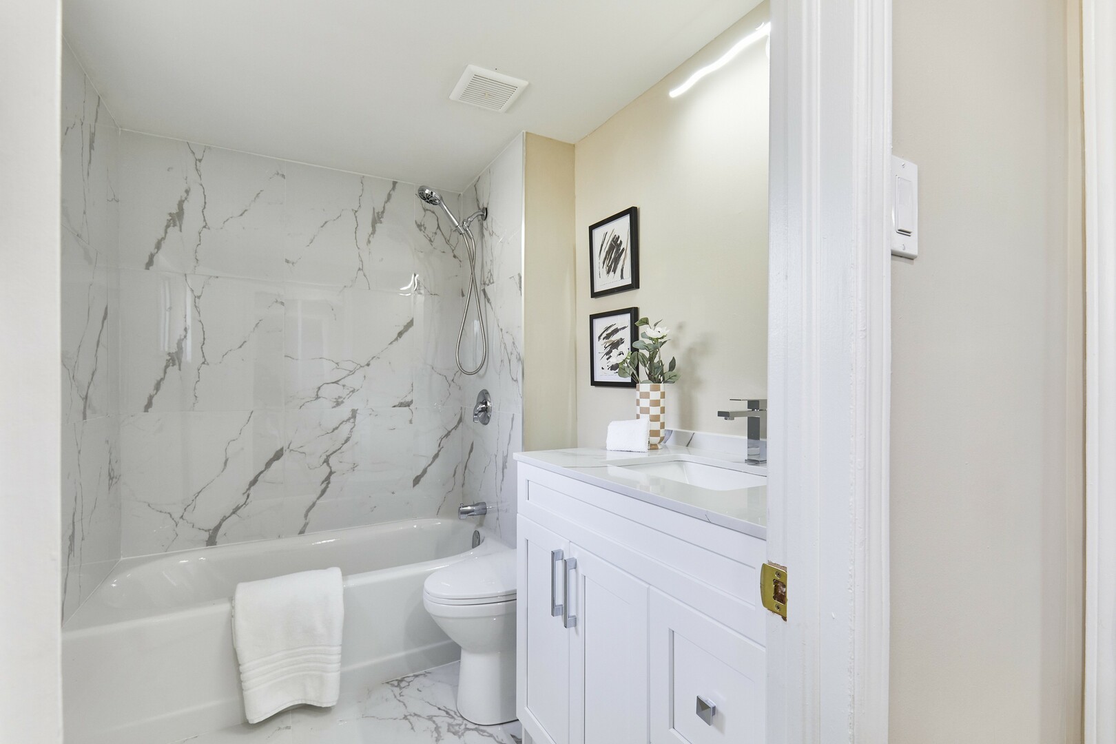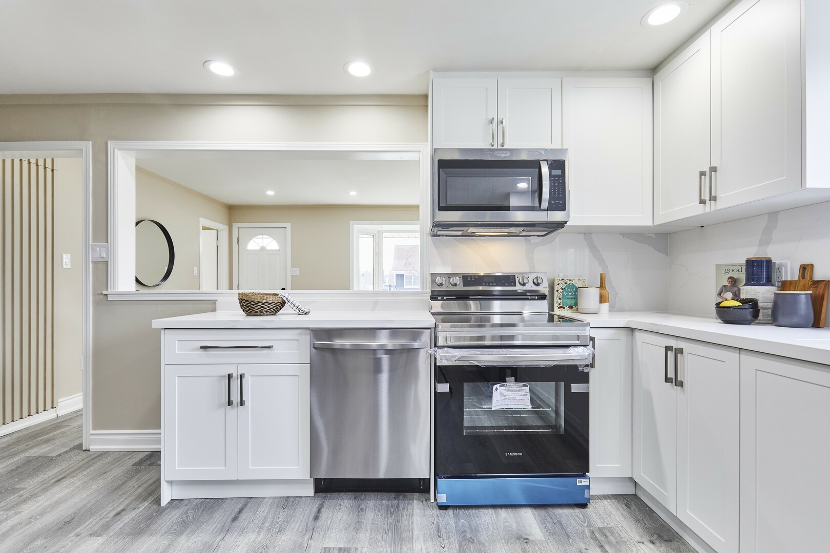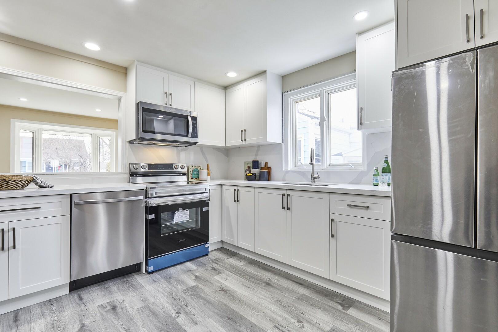 The brand-new kitchen features quartz countertops, stylish new cabinets, and brand-new stainless steel appliances, perfect for preparing meals and entertaining guests. The fully renovated bathroom boasts modern finishes, while new flooring throughout the home, provides both style and durability.