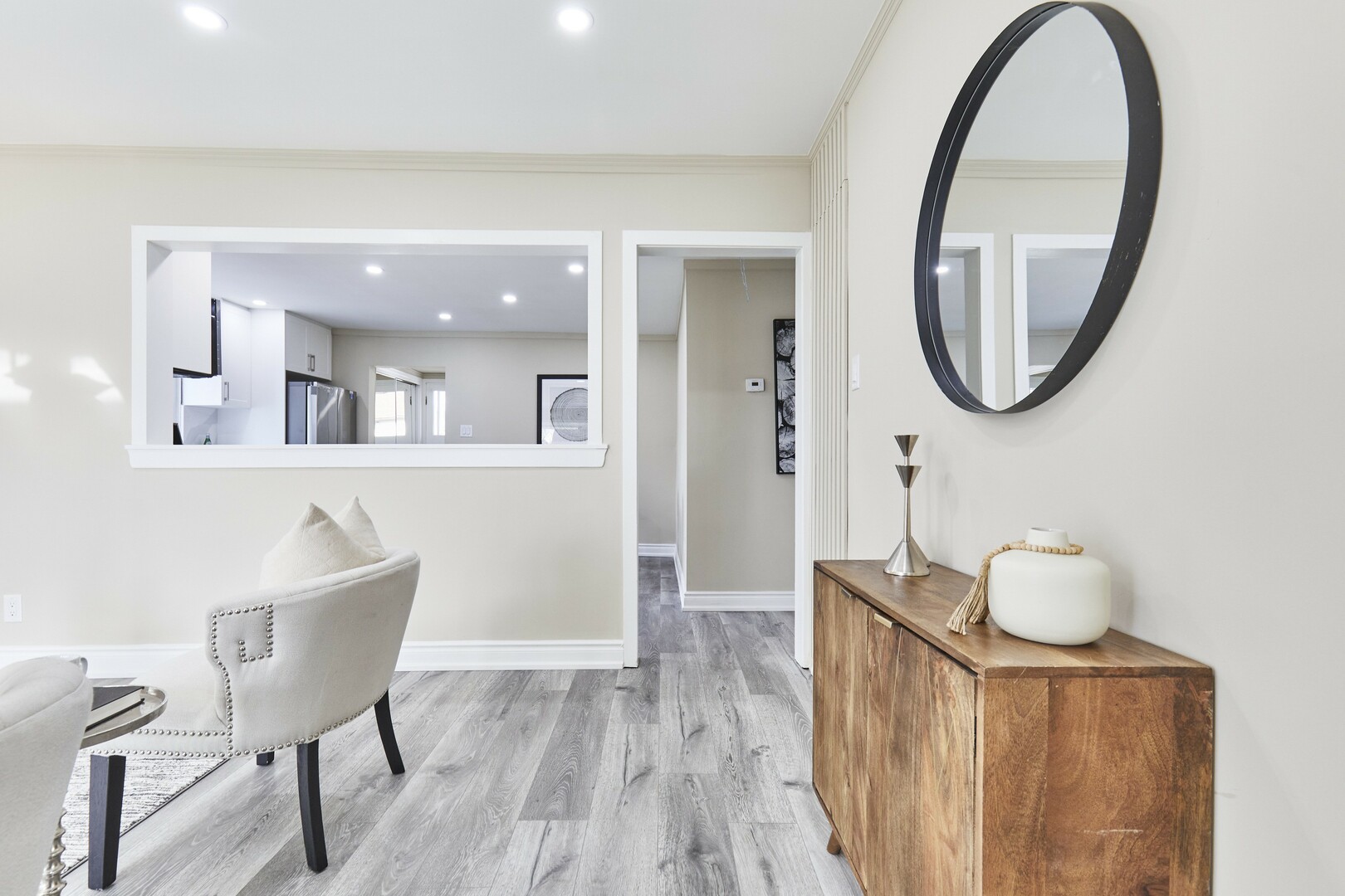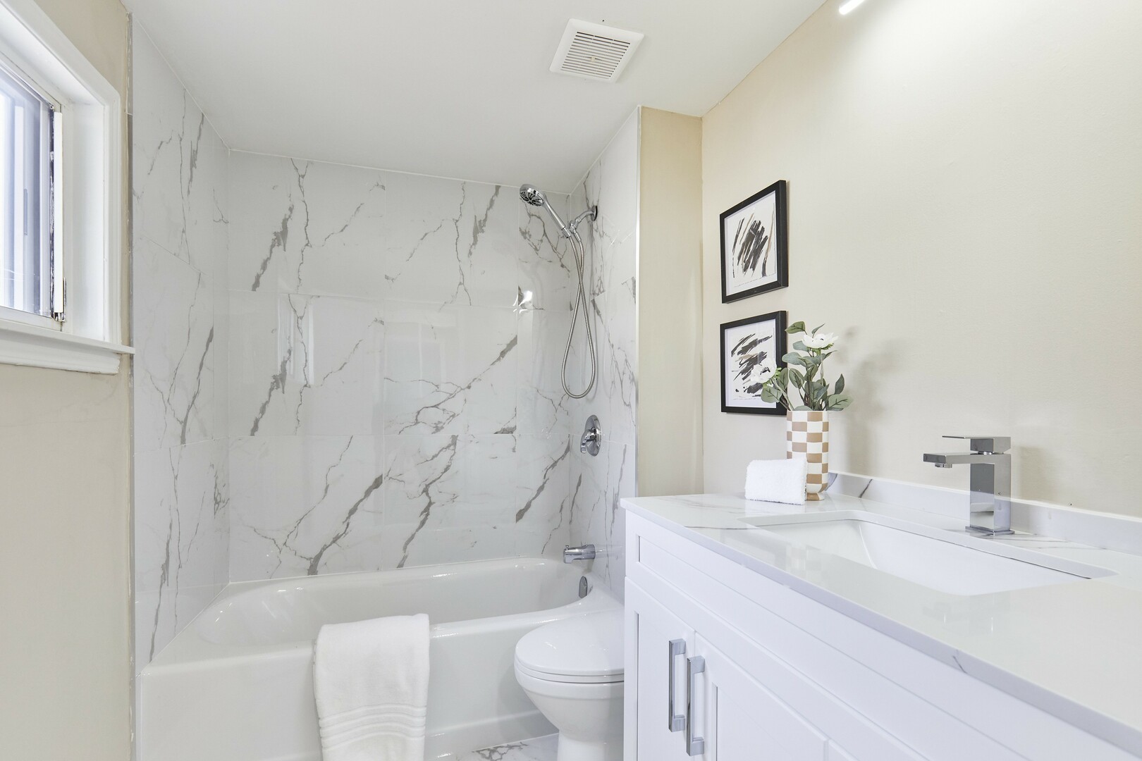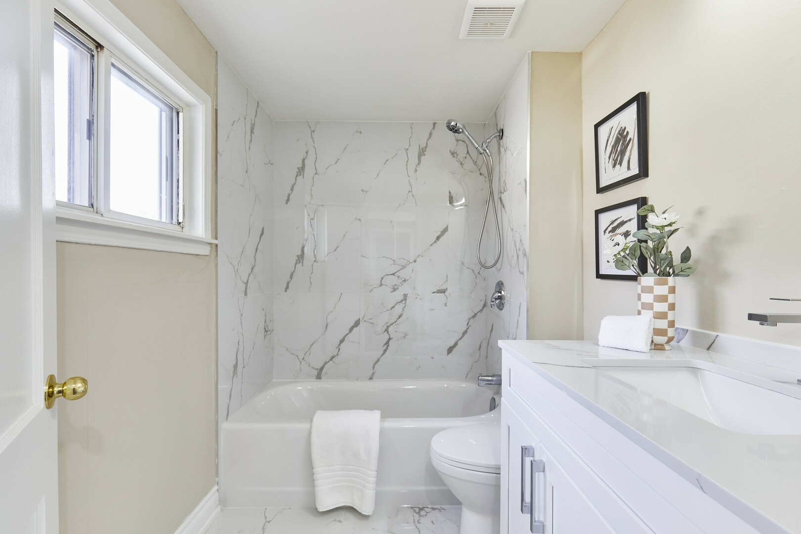 The brand-new kitchen features quartz countertops, stylish new cabinets, and brand-new stainless steel appliances, perfect for preparing meals and entertaining guests. The fully renovated bathroom boasts modern finishes, while new flooring throughout the home, provides both style and durability.