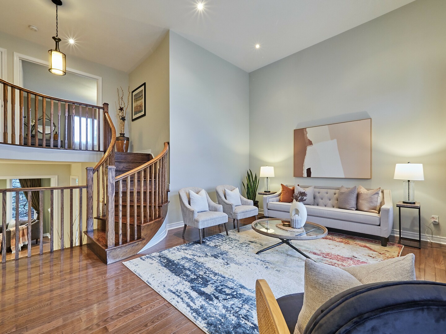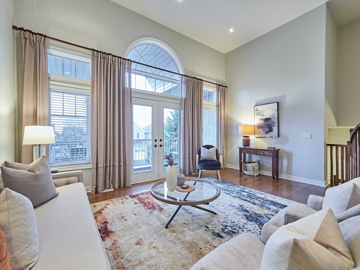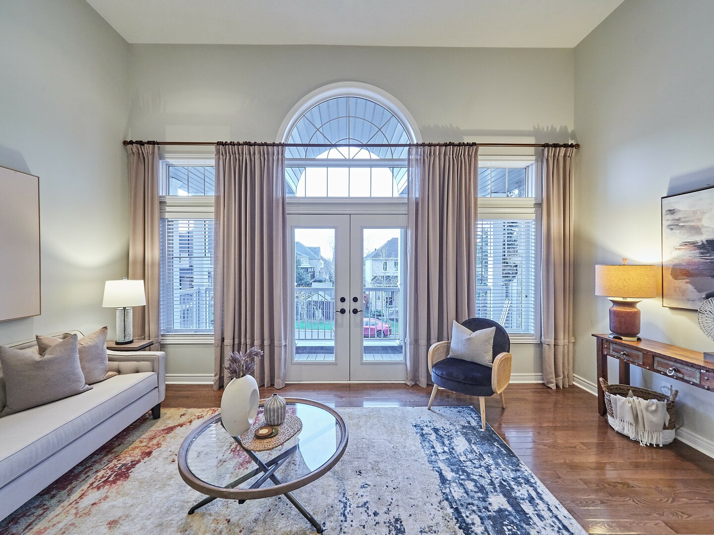 A finishing touch in many of the rooms throughout the home are elegant fabric window treatments; a double coat closet is located off the reception area; and at mid-level is a gorgeous formal living room with hardwood flooring; a Cathedral ceiling with pot lighting; and a grand wall-to-wall Palladian-style window with a French door walk-out onto a spacious south-facing covered balcony overlooking the street - the centre portion of its ceiling arched to mimic the window’s transom.