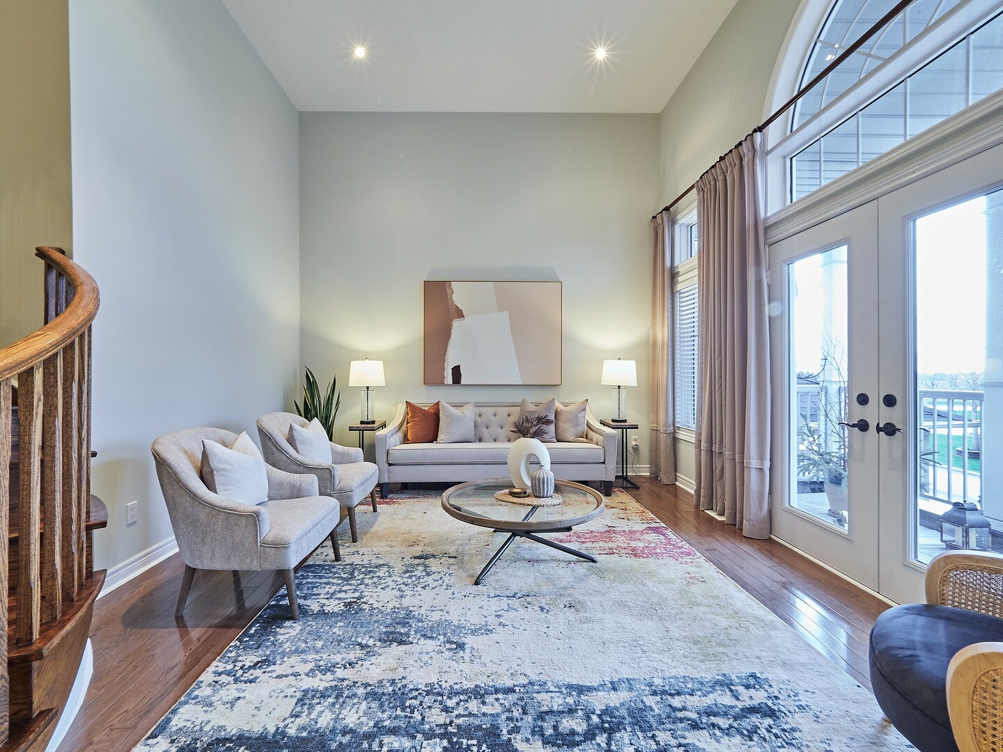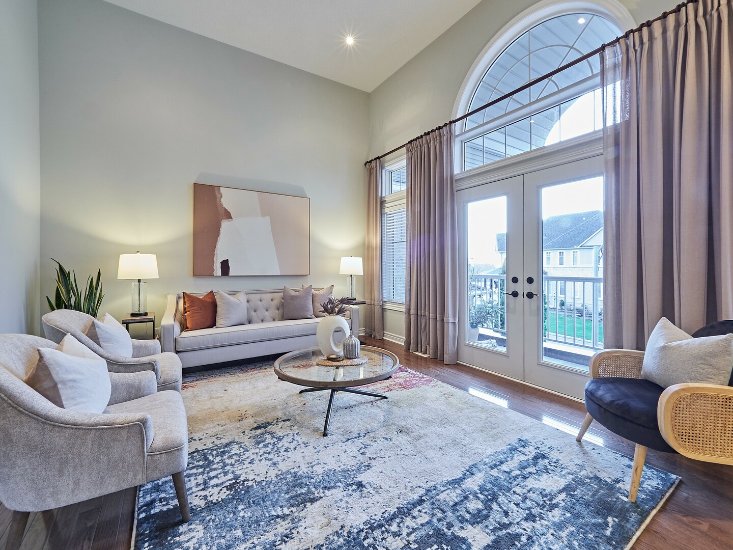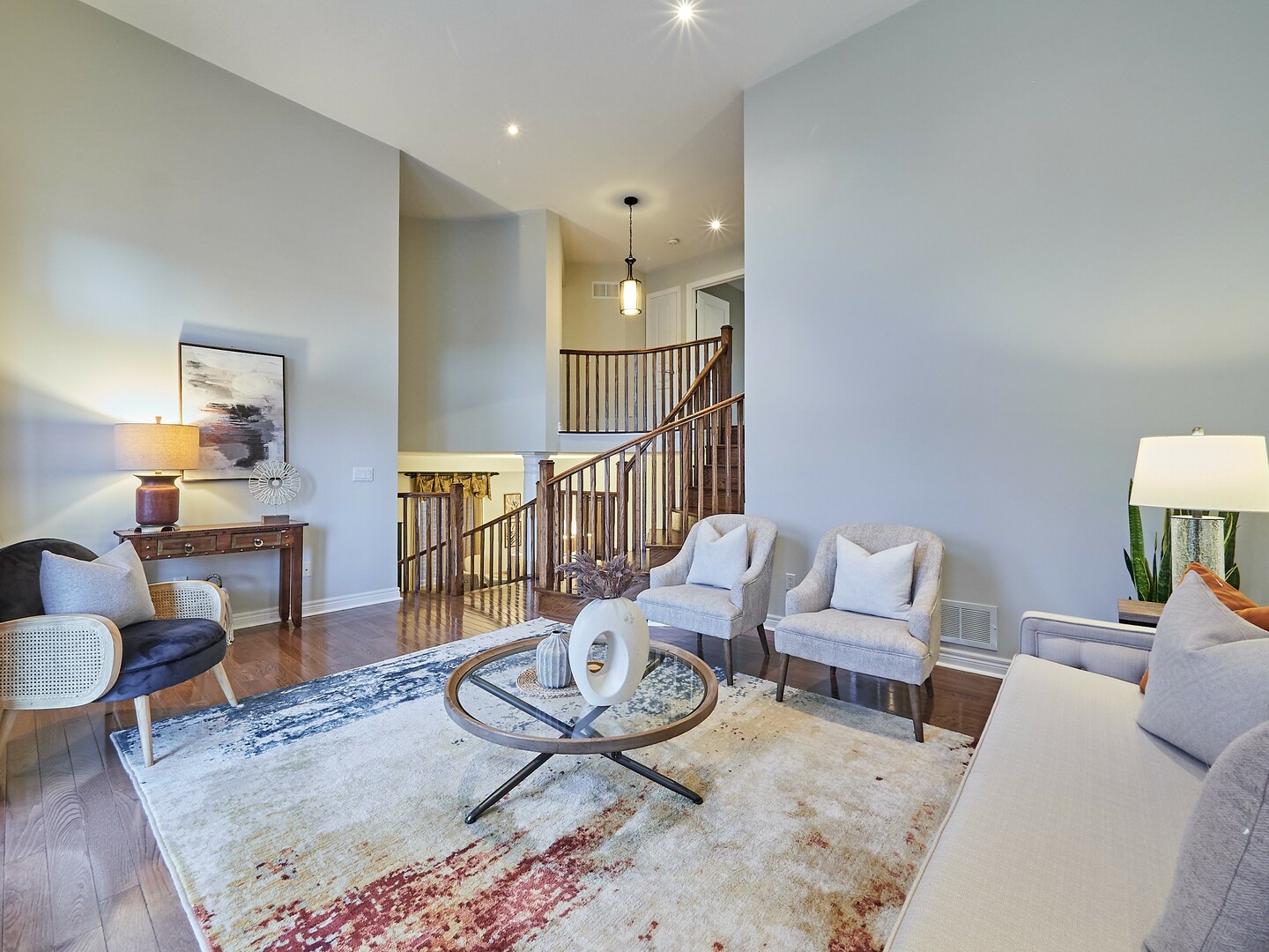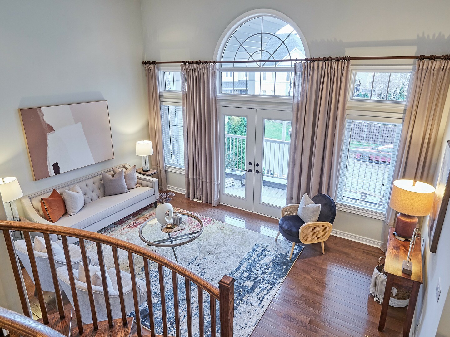 A finishing touch in many of the rooms throughout the home are elegant fabric window treatments; a double coat closet is located off the reception area; and at mid-level is a gorgeous formal living room with hardwood flooring; a Cathedral ceiling with pot lighting; and a grand wall-to-wall Palladian-style window with a French door walk-out onto a spacious south-facing covered balcony overlooking the street - the centre portion of its ceiling arched to mimic the window’s transom.