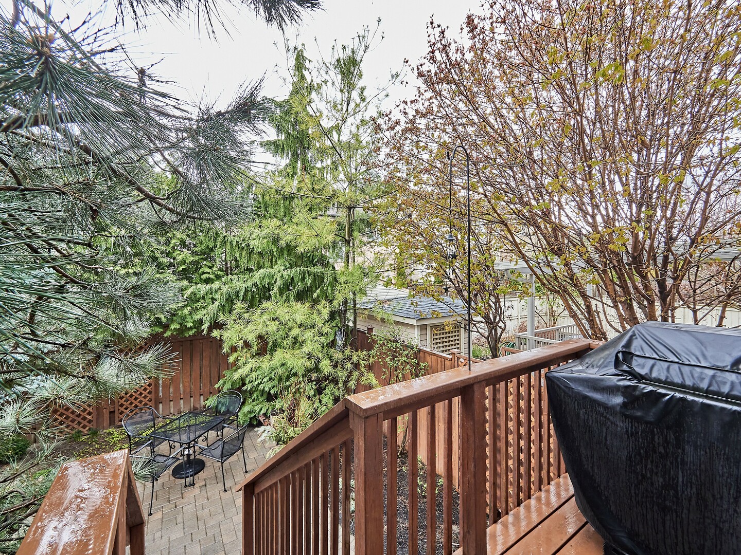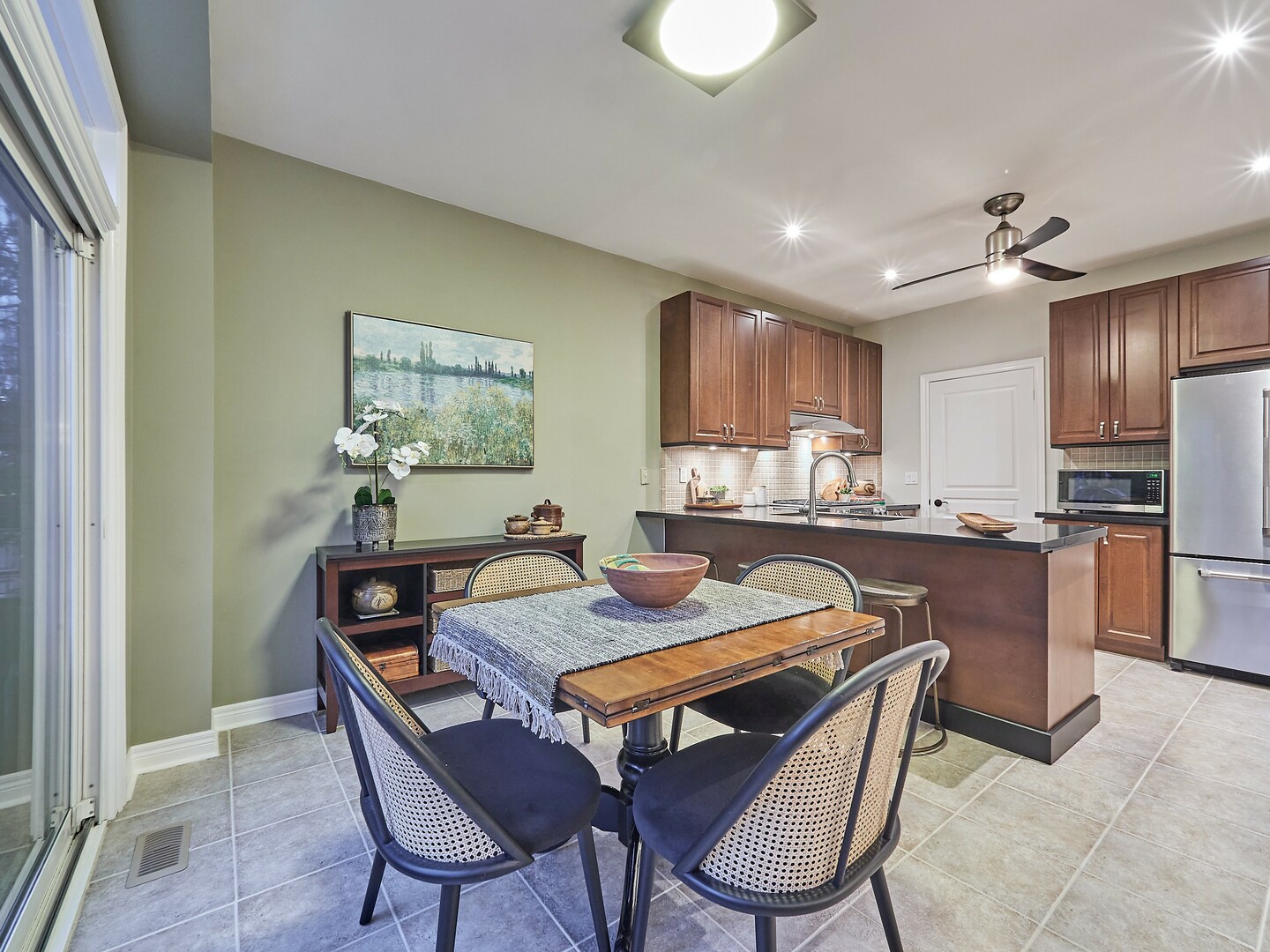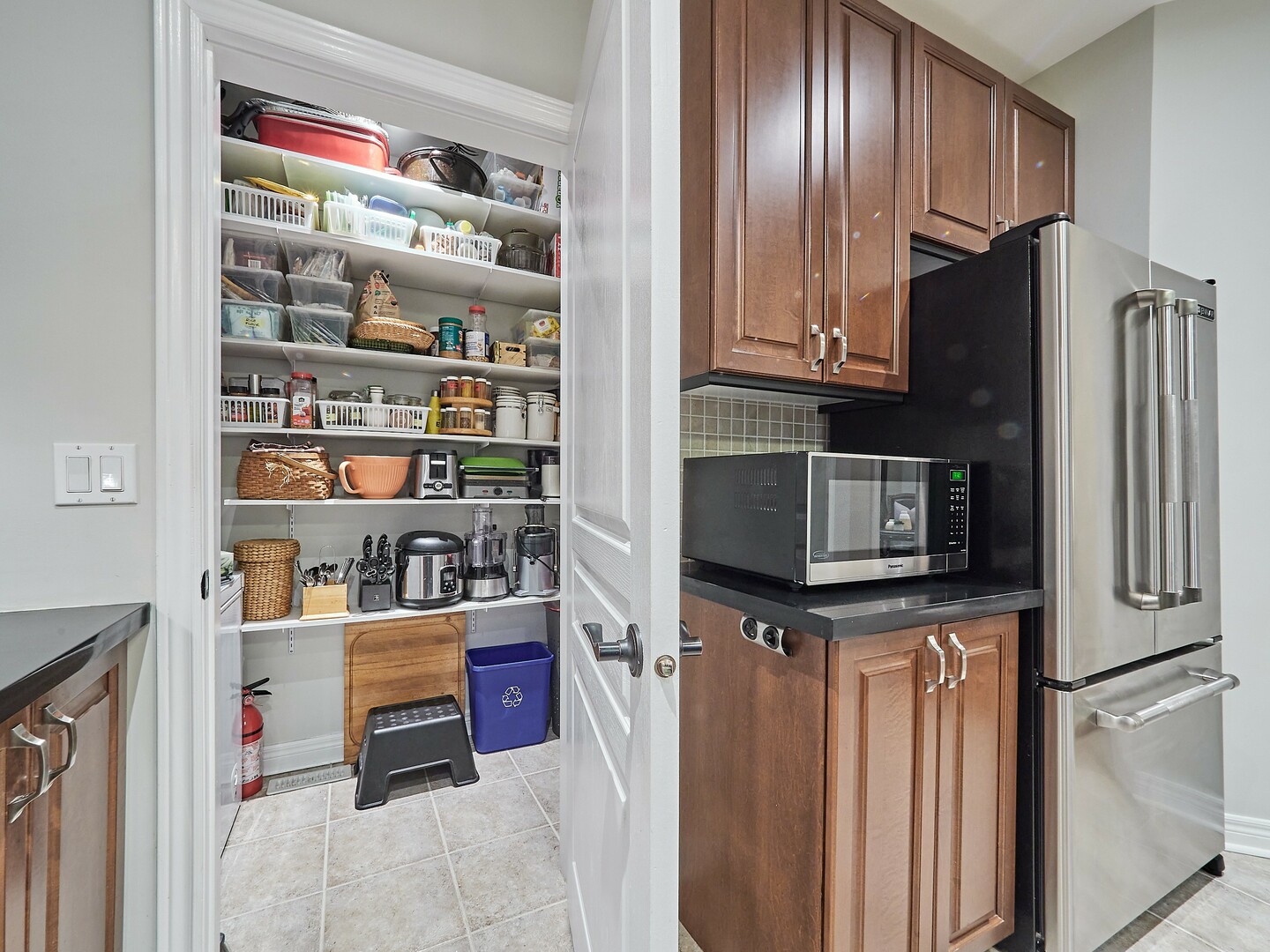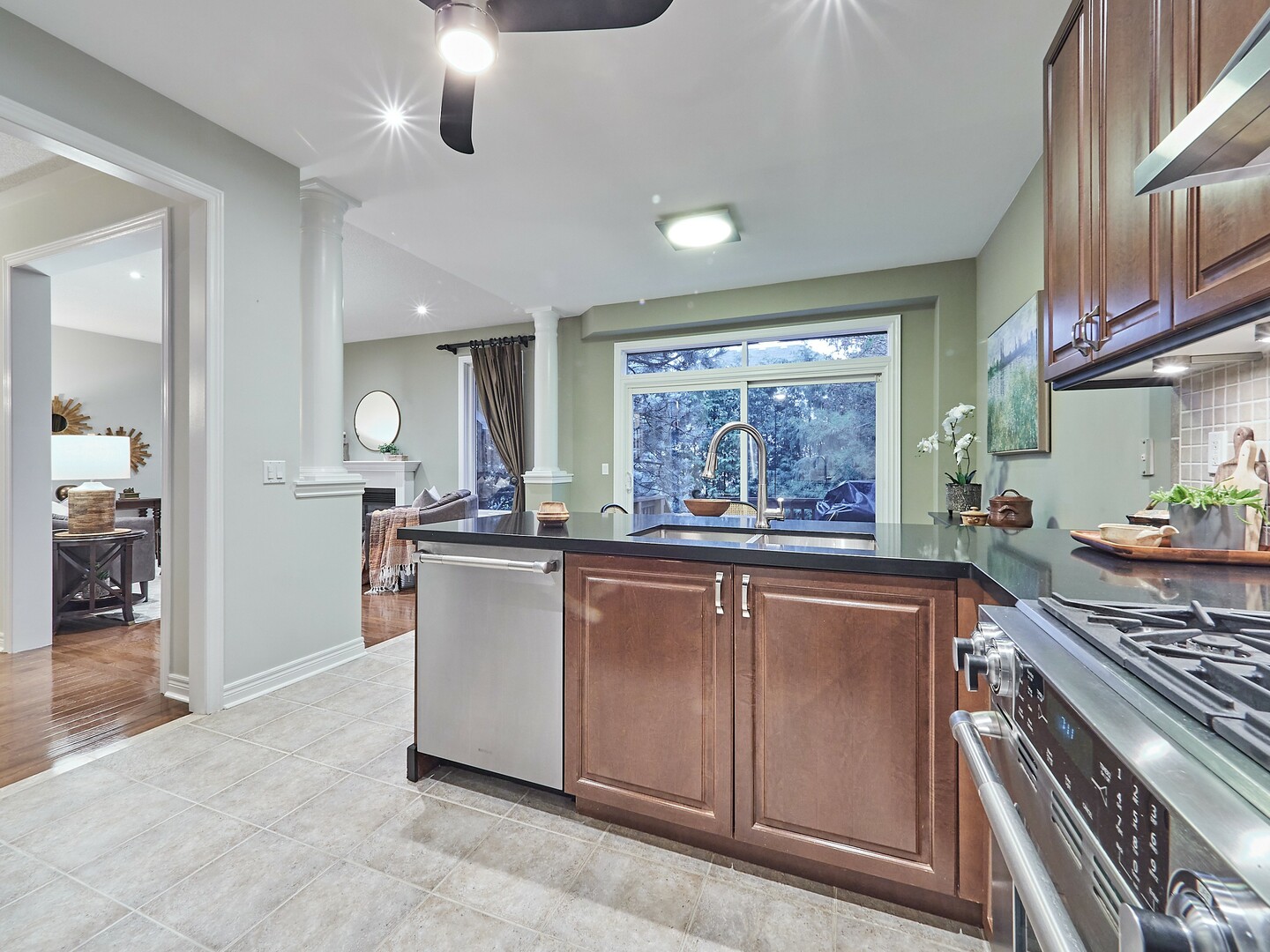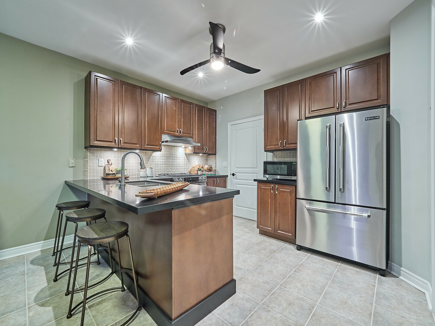 The kitchen also has a warm and welcoming aura - this functional work area showcasing pot lighting and a ceiling fan light; stone counters, with seating at the peninsula; tiled back splashes; richly hued wooden cabinetry with extended height uppers; a large walk-in pantry, which also has an existing rough-in for a washer and dryer; as well as a stainless steel French door fridge, gas range, dishwasher, and a double under mount sink. Earthen toned tiled flooring finishes this space and its breakfast area - which has an upgraded light fixture, and an oversized sliding door walk-out with a transom opening onto a raised deck ideal for year-round barbecuing, and which steps down to a circular stone patio in the backyard.