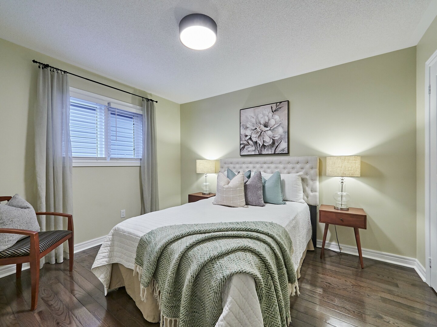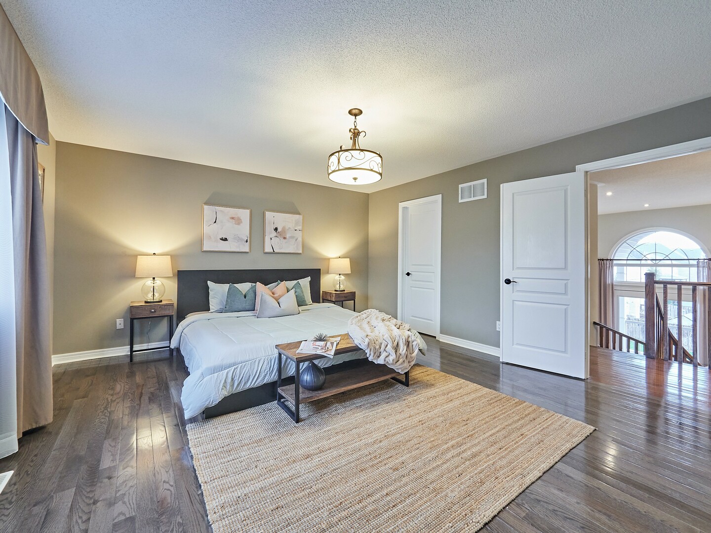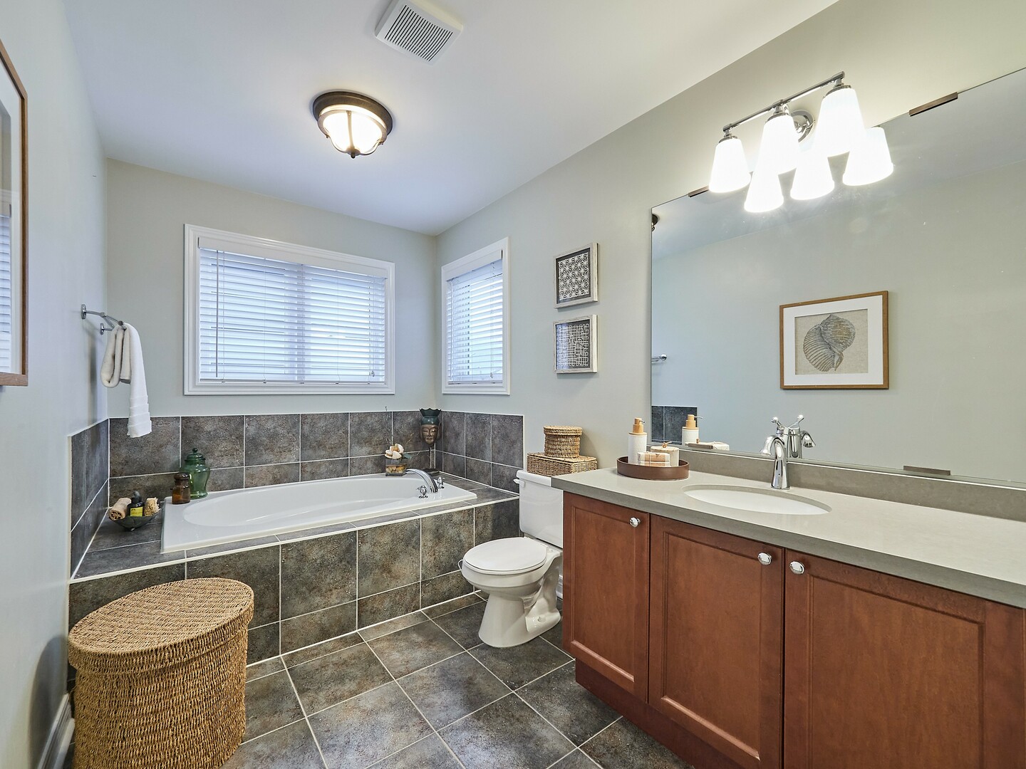 Through a double door entry is the serenity of the master suite - this beautiful personal retreat showcasing ample space for a sitting area, a large window with backyard views, an upgraded light fixture, and a walk-in closet with organizers. Its ensuite washroom has a relaxing aura, as well - and showcases tiled finishes throughout; a walk-in shower area; a soaker tub with two corner windows; and a vanity updated with a quartz counter.