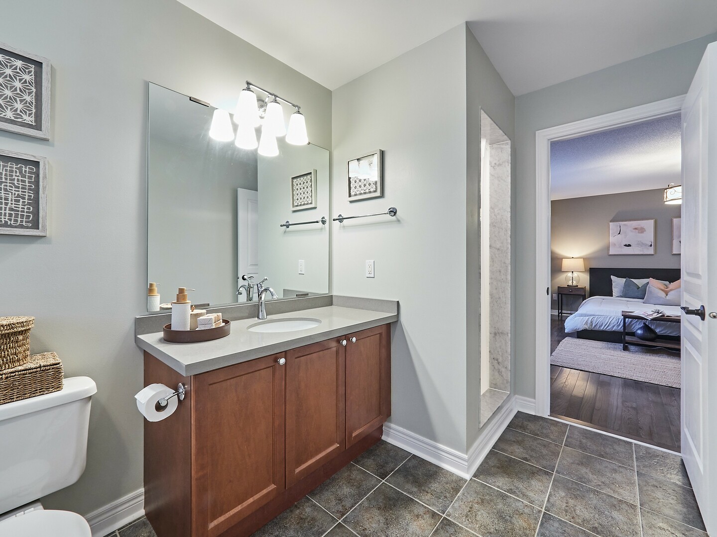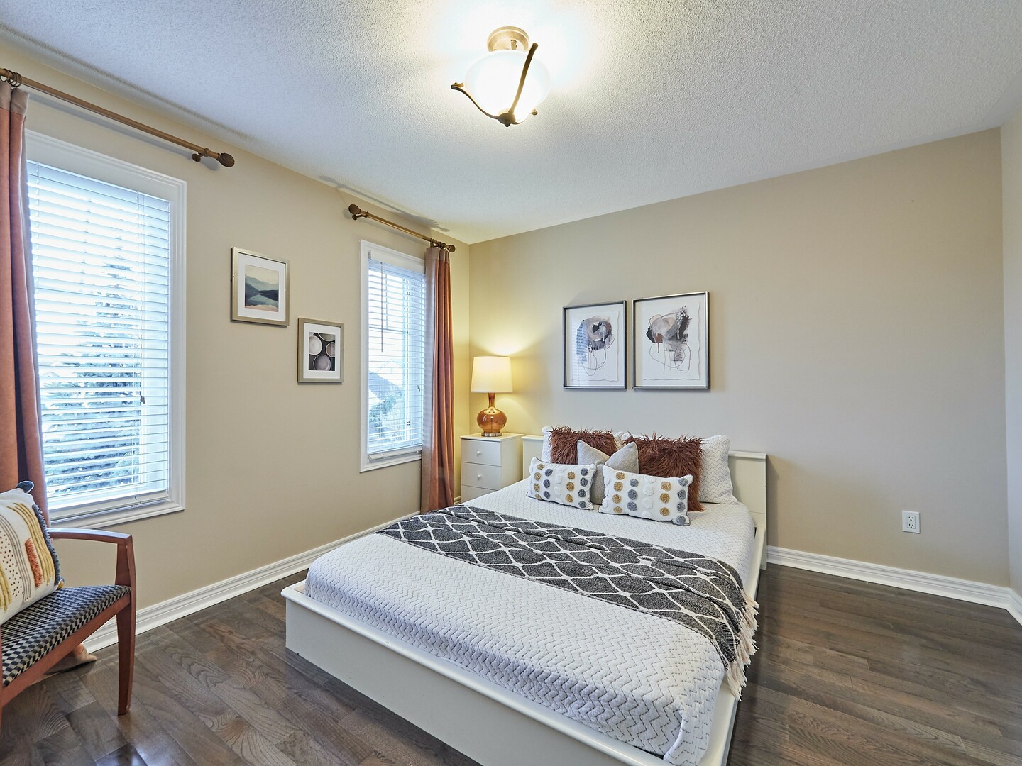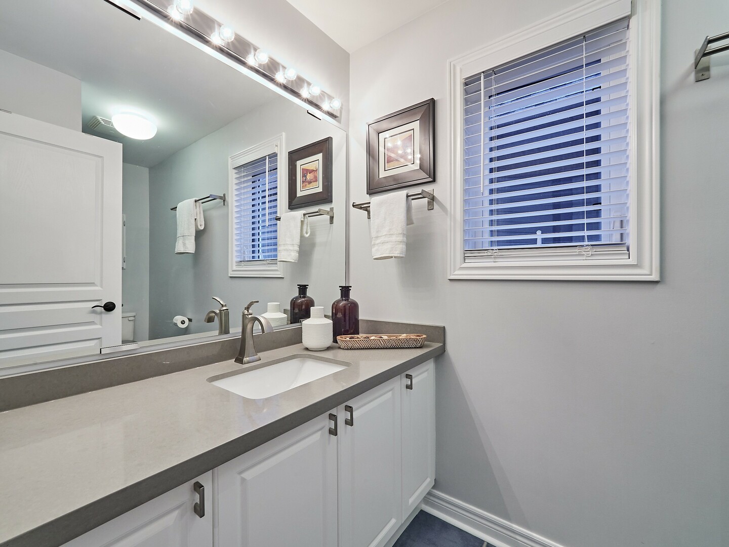 Both the second and third bedrooms have good-sized windows, closets with organizers, and space for sitting areas - and between these rooms is the main 4-pc washroom, which features a vanity updated with a quartz counter, as well as a tiled floor and bath area.
