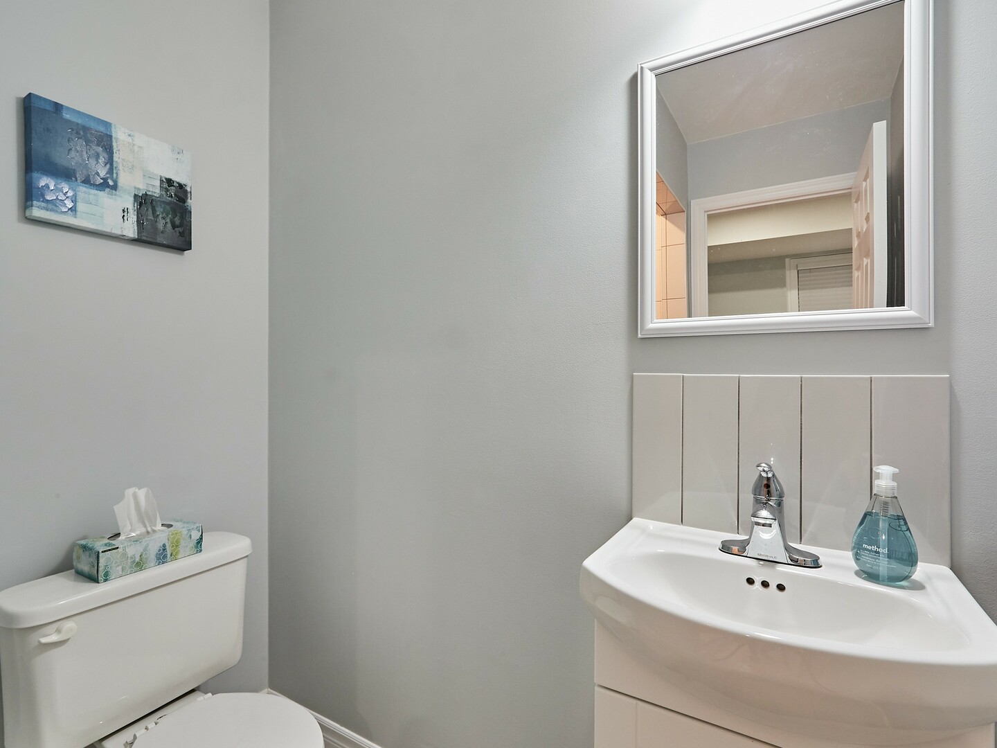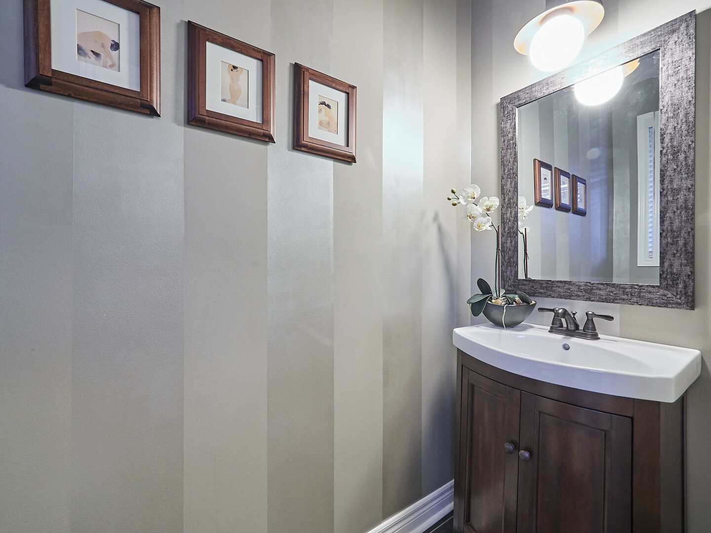 Directly off the foyer is a powder room - as well as the staircase to the lower level.
