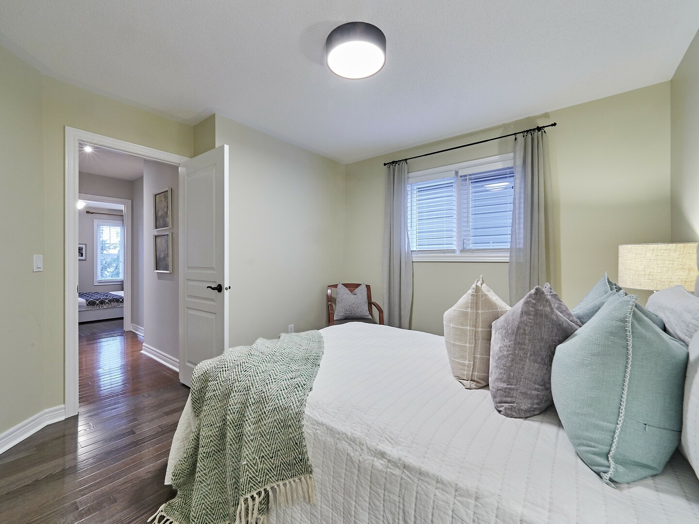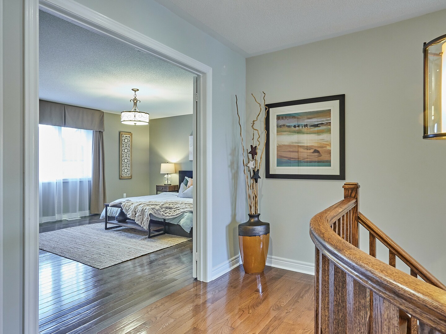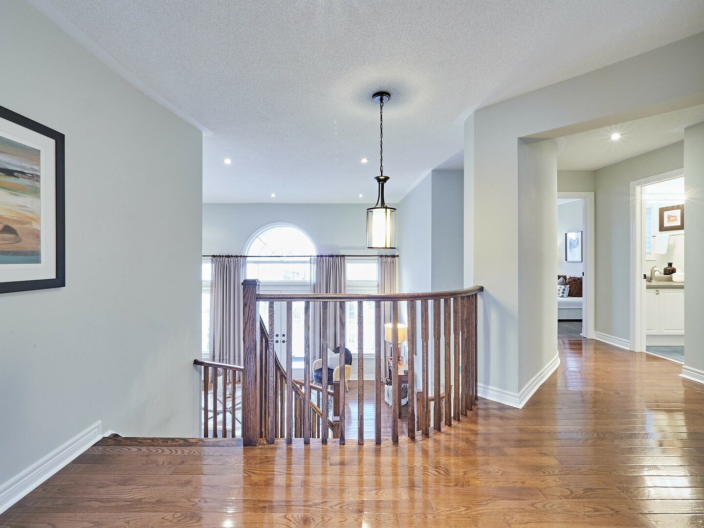 A contemporary light fixture illuminates the upper staircase and hallway - the hallway also featuring pot lighting and hardwood flooring; with this level showcasing two washrooms and three spacious bedrooms - the bedrooms all finished with new hardwood flooring.