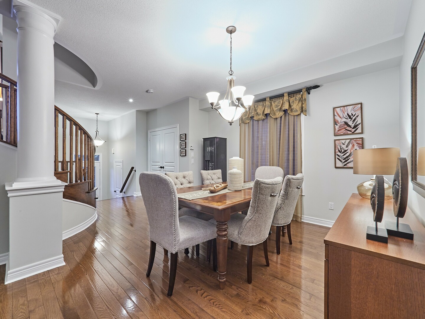 Interior columns lend an aura of grandeur to the entertaining spaces of the family and formal dining rooms - both which showcase gleaming hardwood flooring; while elegant light fixtures cast ambient lighting throughout the dining room and the reception area - enhancing the inviting feeling of warmth that envelops you upon entry into the home.