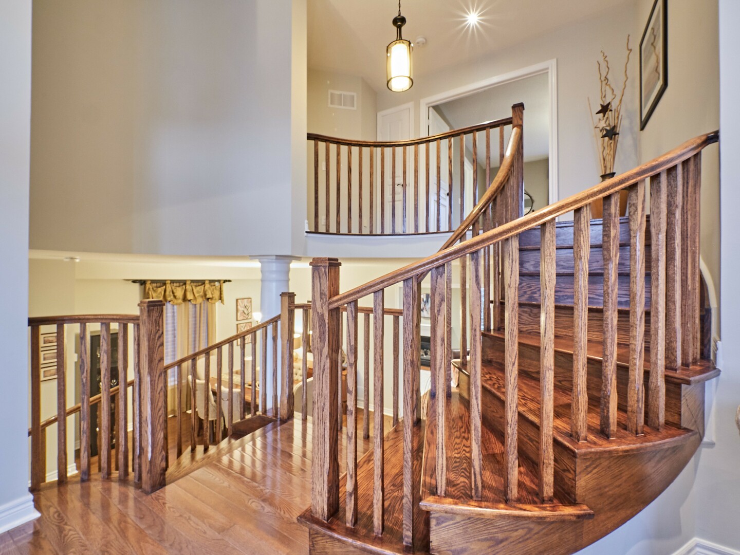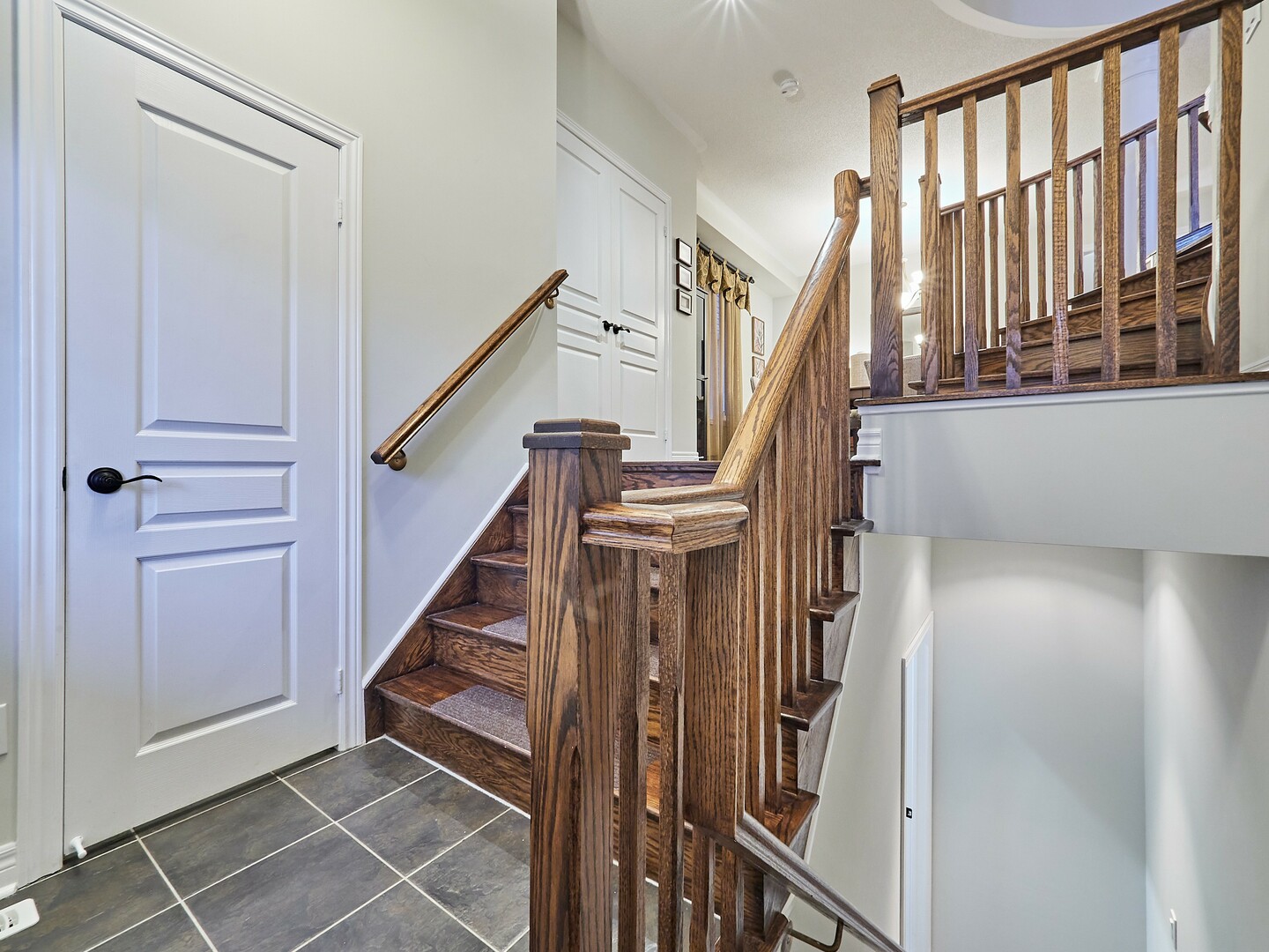 Opening into a sunken tiled foyer with hardwood stairs to the main level - curved hardwood staircases carry to the mid- and upper levels, with another hardwood staircase leading to the finished lower level - all stained in a rich deep shade, as are the accompanying railings and handrails.