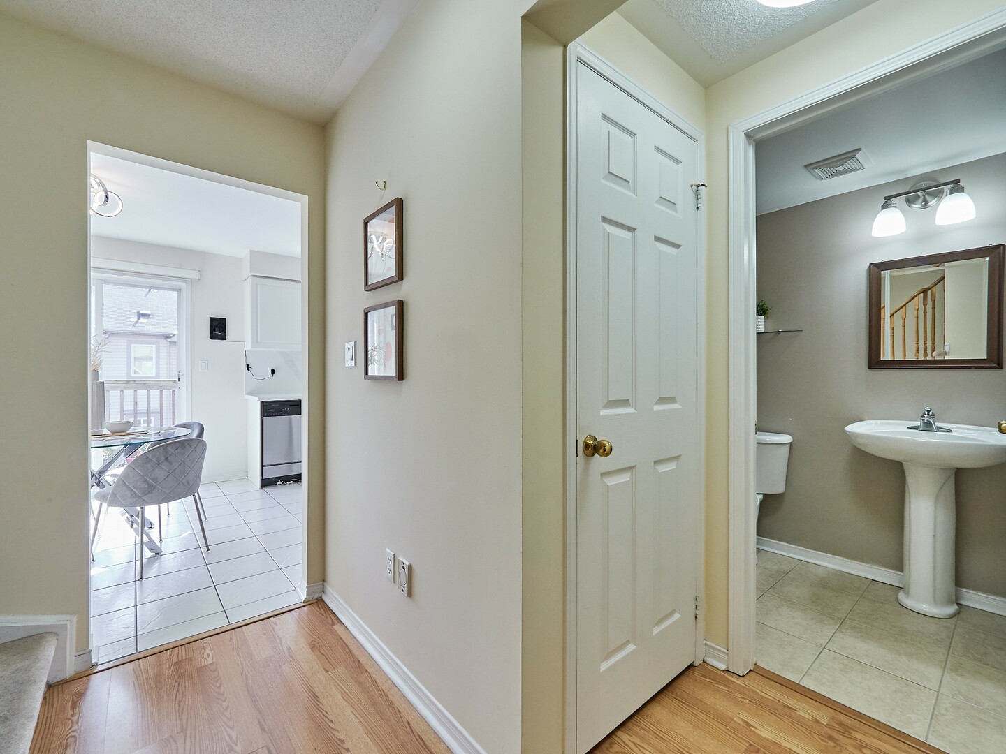 The hallway between the dining and kitchen areas features newly updated light fixtures, a coat closet, and a powder room with ceramic flooring and a pedestal sink - while a modern chandelier casts beautiful ambient light above the entrance staircase.
