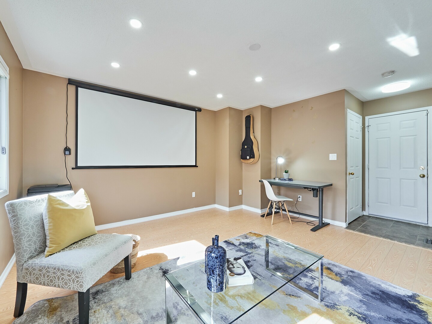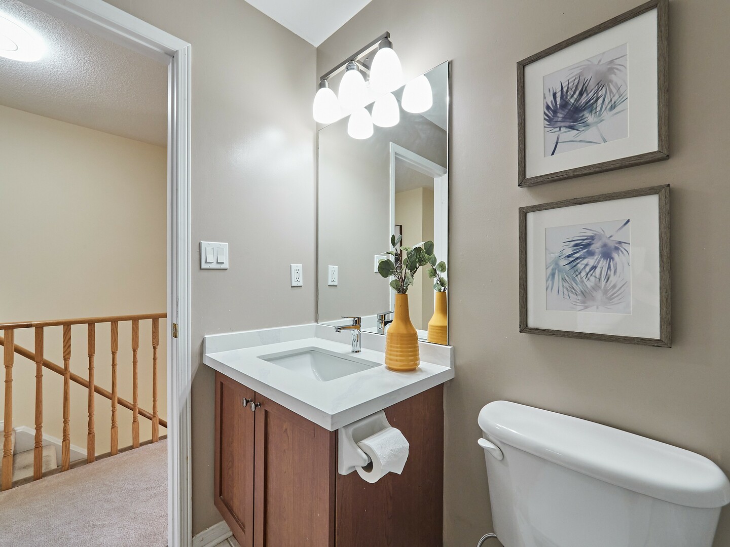 Carpeted staircases with hardwood railings lead to both the upper and the first of two lower levels - this level featuring a spacious family recreation room with laminate flooring, updated LED pot lights, and lots of natural light streaming through a large west-facing window and a second accent window. A newly upgraded ceiling light brightens the ceramic-tiled landing beside the staircase, and off this space is access to the single car garage, and a set of stairs to the unfinished lower ground level. Ideal for household storage, this level also has potential to add finished recreational space to the home - and has a laundry area with washer and dryer, as well as a sliding door walk-out to a private fenced-in backyard with a stone patio.