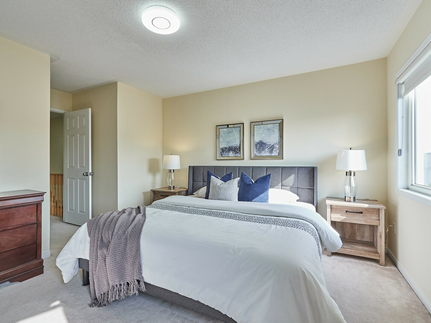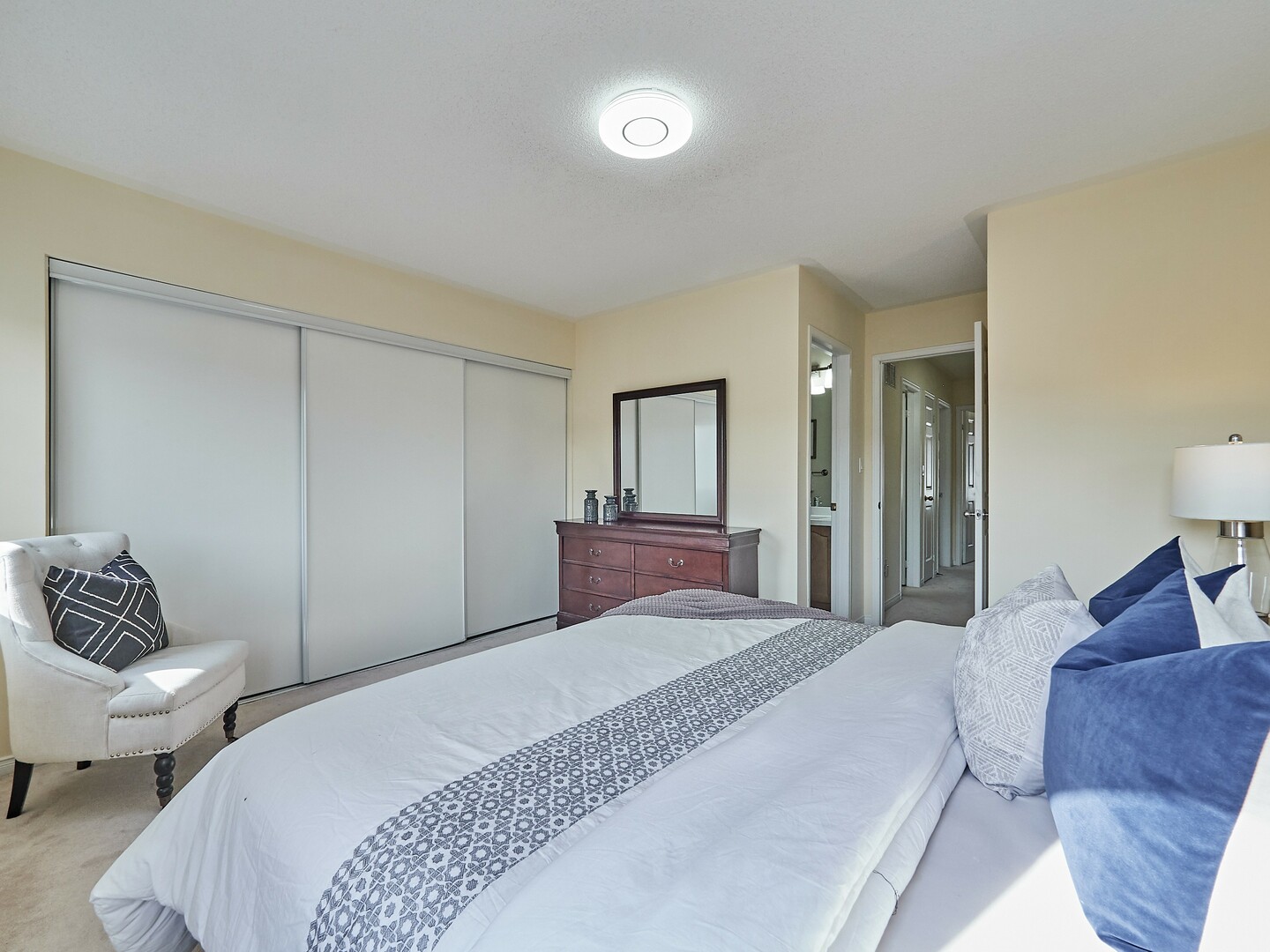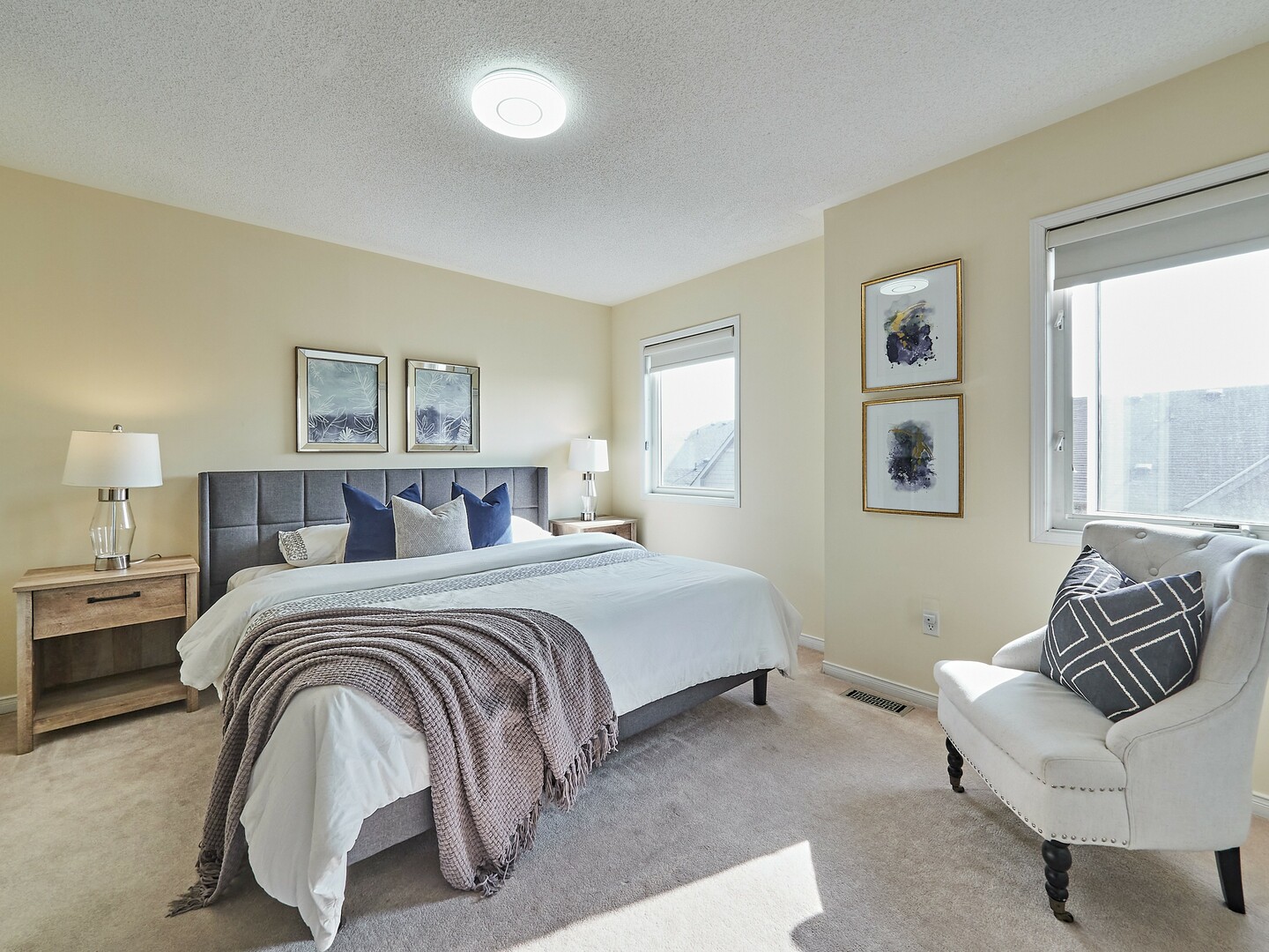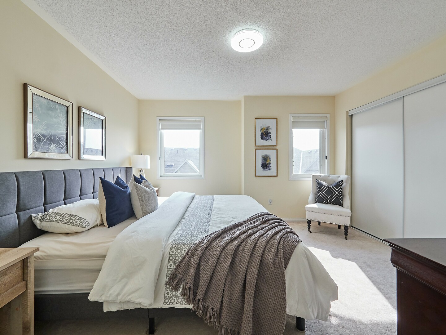 The master bedroom’s ensuite washroom also has ceramic-tiled finishes and a vanity newly updated with a quartz counter - with this bright, yet restful, retreat additionally showcasing wall-to-wall closet storage, space for a sitting area, and windows along its west wall filling the room with abundant natural light.