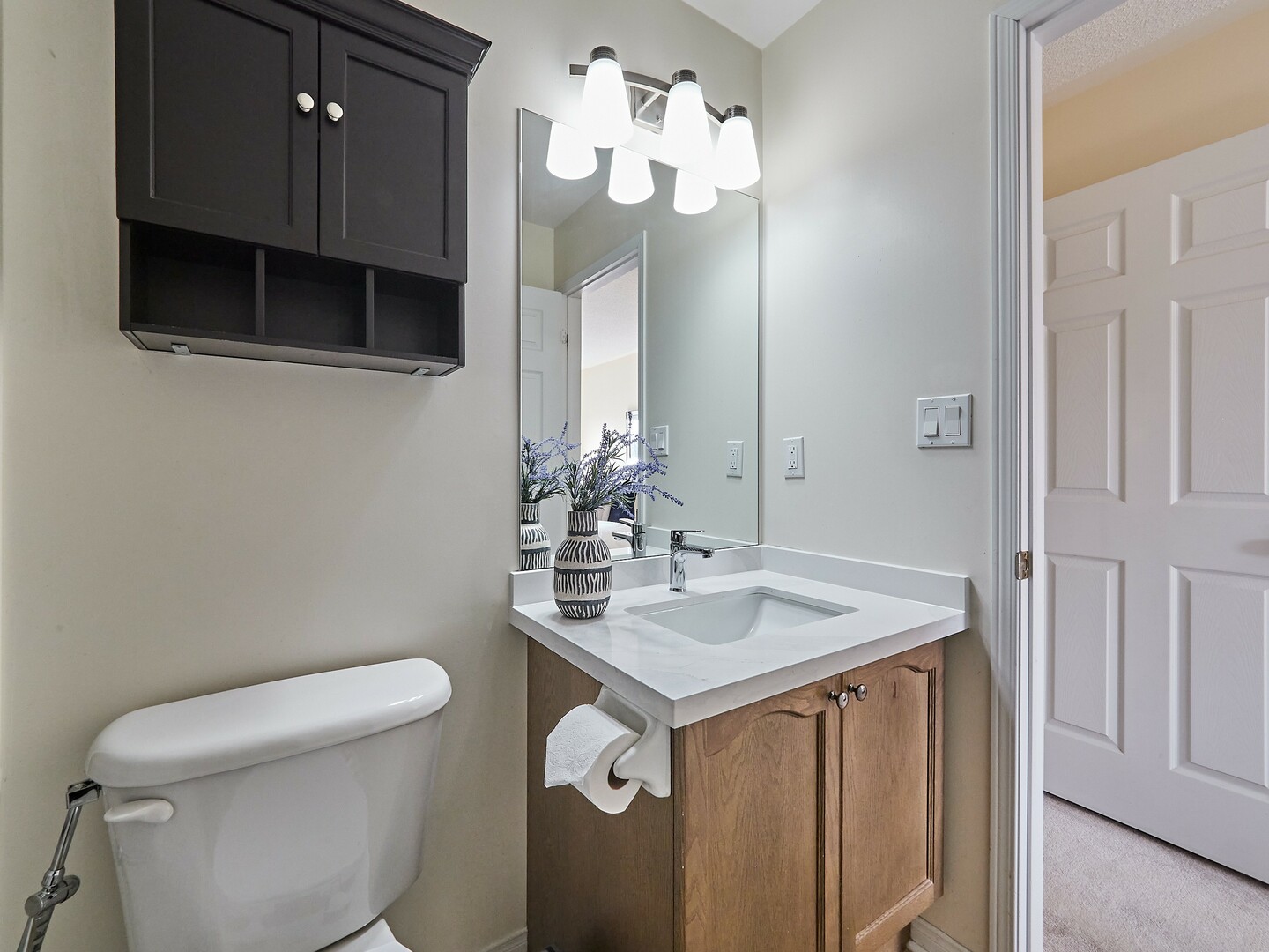 The upper level is carpeted throughout, and features newly upgraded ceiling light fixtures in all three bedrooms and in the hallway.
