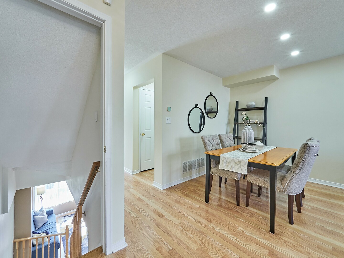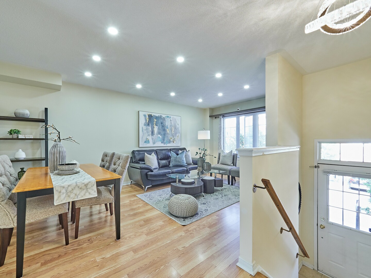 Off the landing is the open concept entertaining spaces of the living and dining rooms. Brightened with updated LED pot lighting, the east-facing picture window in the living room allows natural light to spill into these spaces, while a soft colour palette and the blonde shade of the laminate flooring enhances their open, airy feel - the flooring continued through the hallway that leads to the kitchen area.