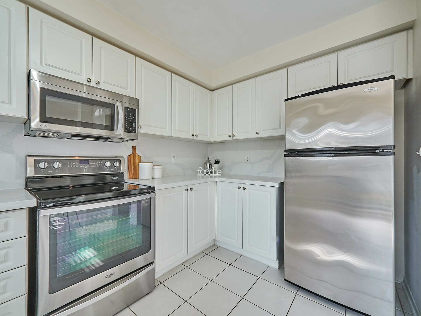 Finished with ceramic flooring, and showcasing a modern, functional layout that pairs a bright, light colour palette with stainless steel - the west-facing kitchen showcases exceptional cabinetry storage; newly updated quartz counters and back splashes; a stainless steel fridge, oven with smooth surface cooktop, a built-in microwave and dishwasher, and a double wide under mount sink; as well as track lighting, with a new contemporary light fixture above the breakfast area - and the sliding door walk-out opens onto a wood balcony that is ideal for year-round barbecuing, and for container gardening.