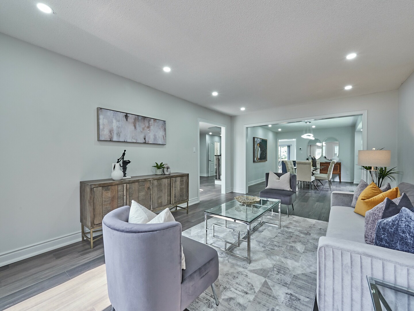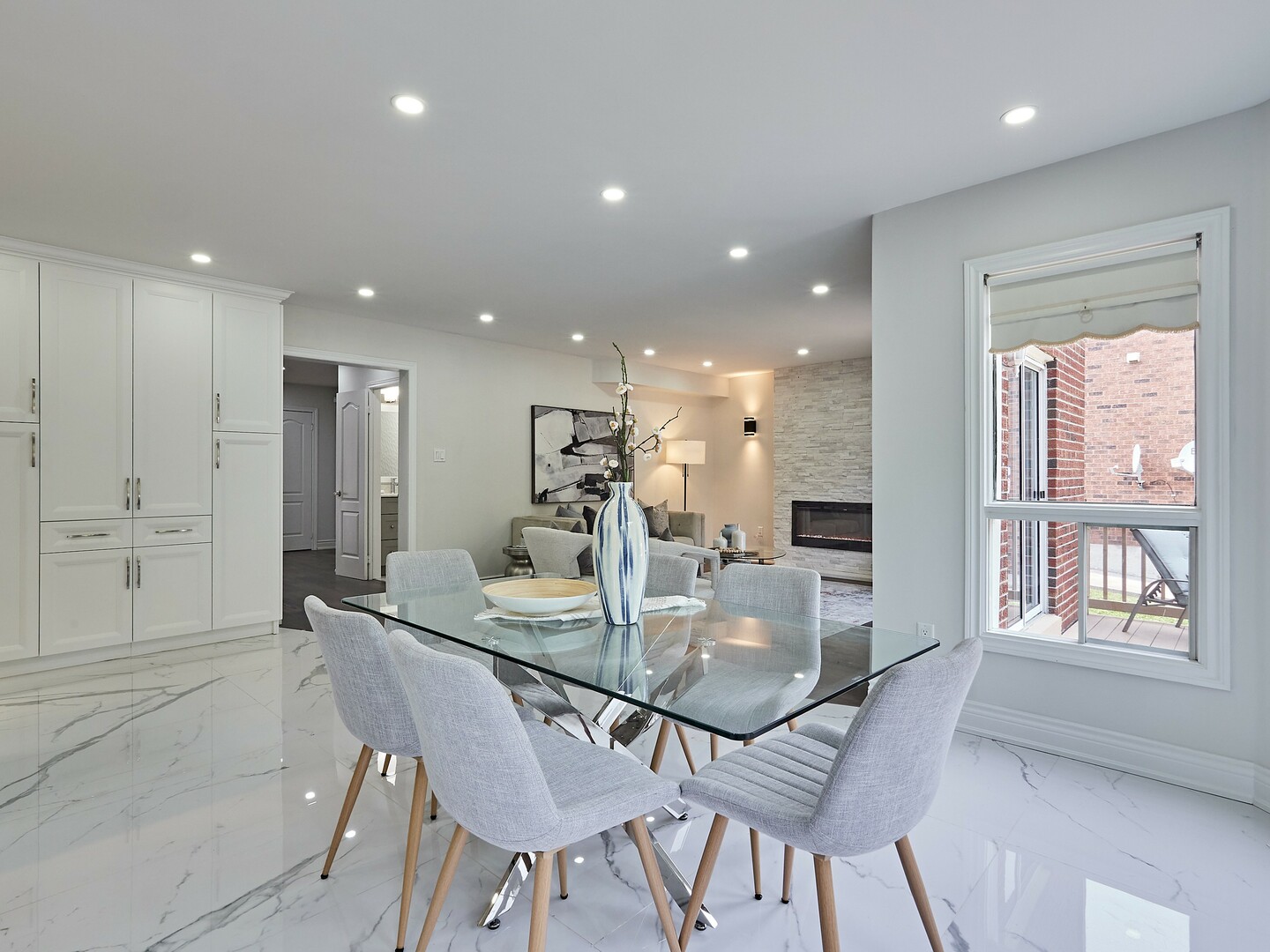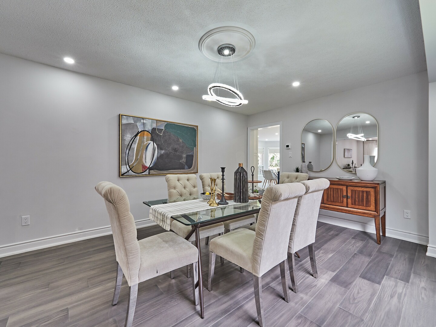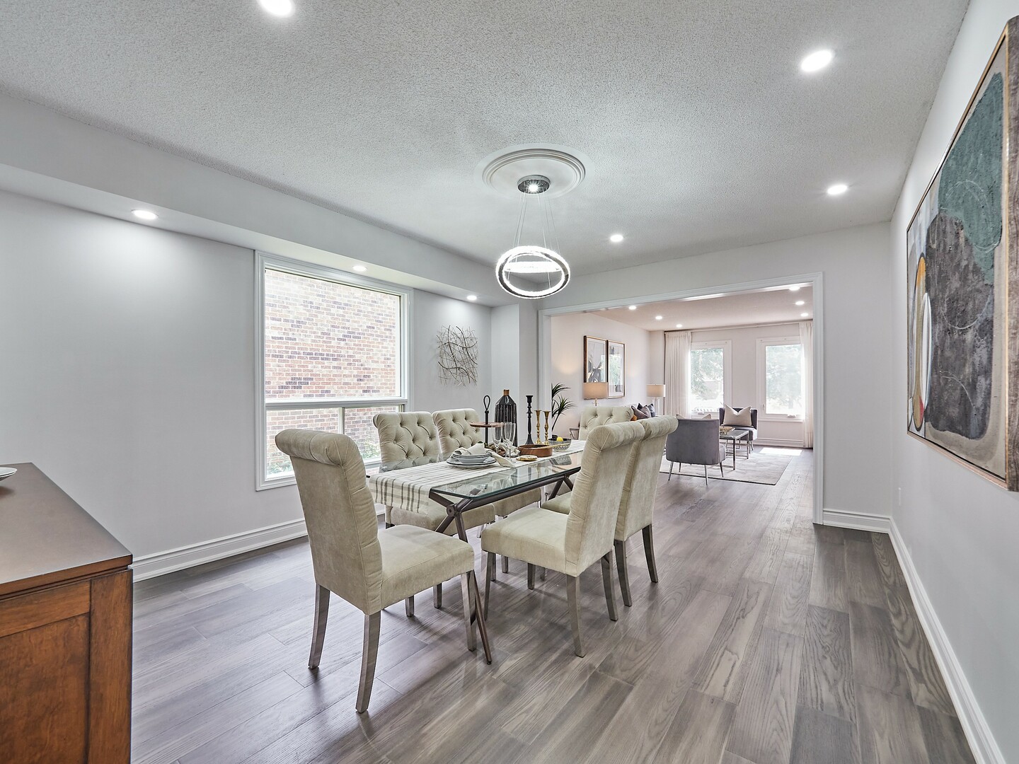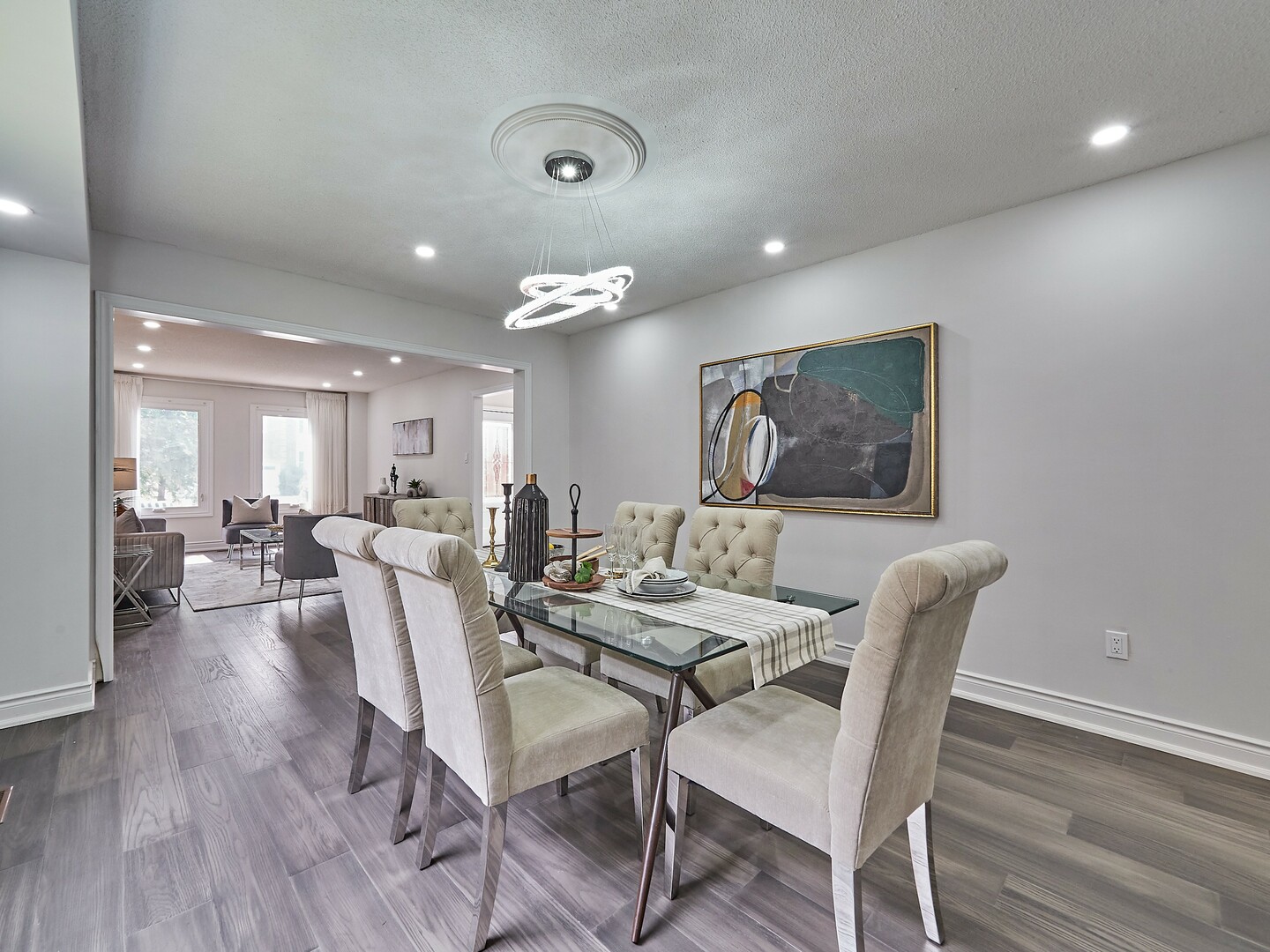 Large windows in the living and dining rooms bring beautiful natural light into these entertaining spaces - their neutral decor, crisp white trims, and pot lighting also featured throughout this level. Bringing modern elegance to these spaces is a pendant chandelier in the dining area, as well as new wide plank hardwood flooring, which also finishes the reception hall, the den, and both the laundry and family rooms.
