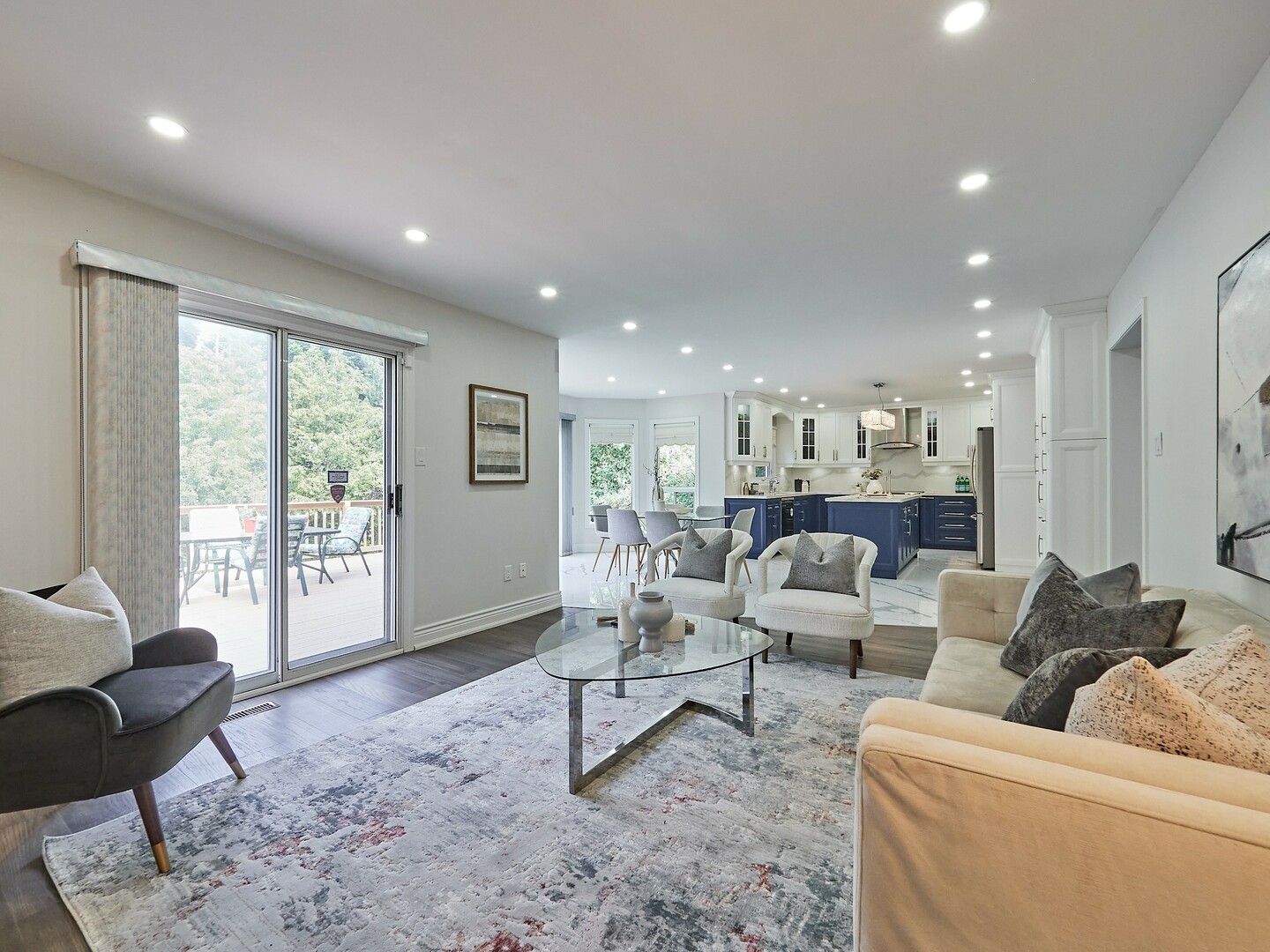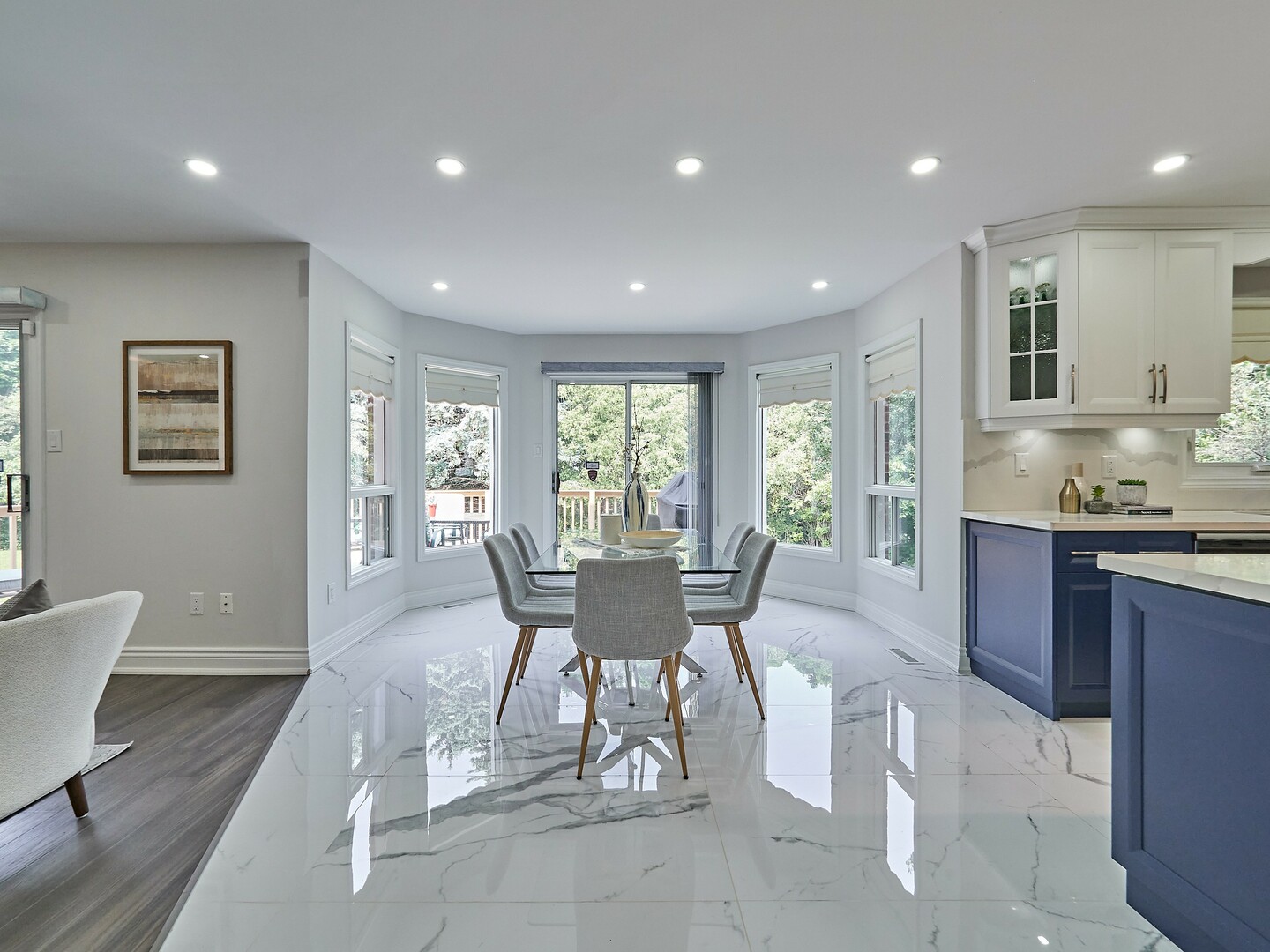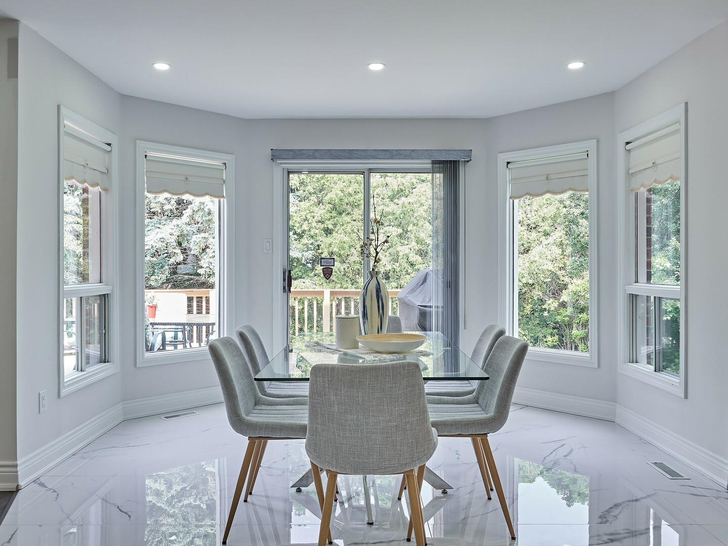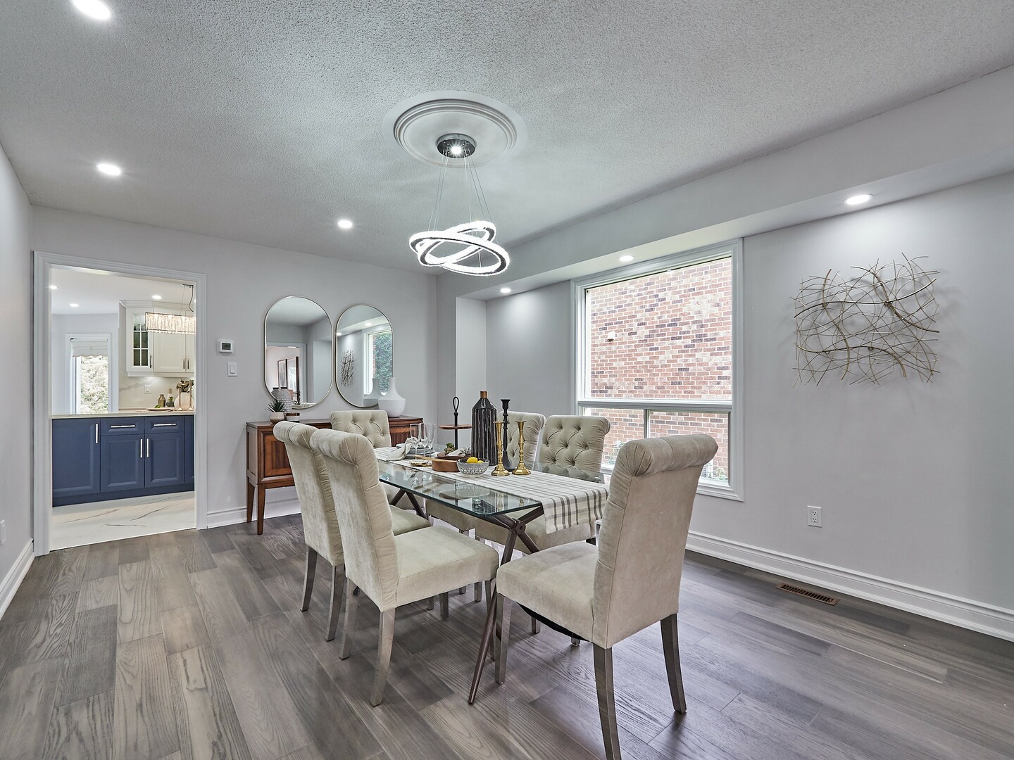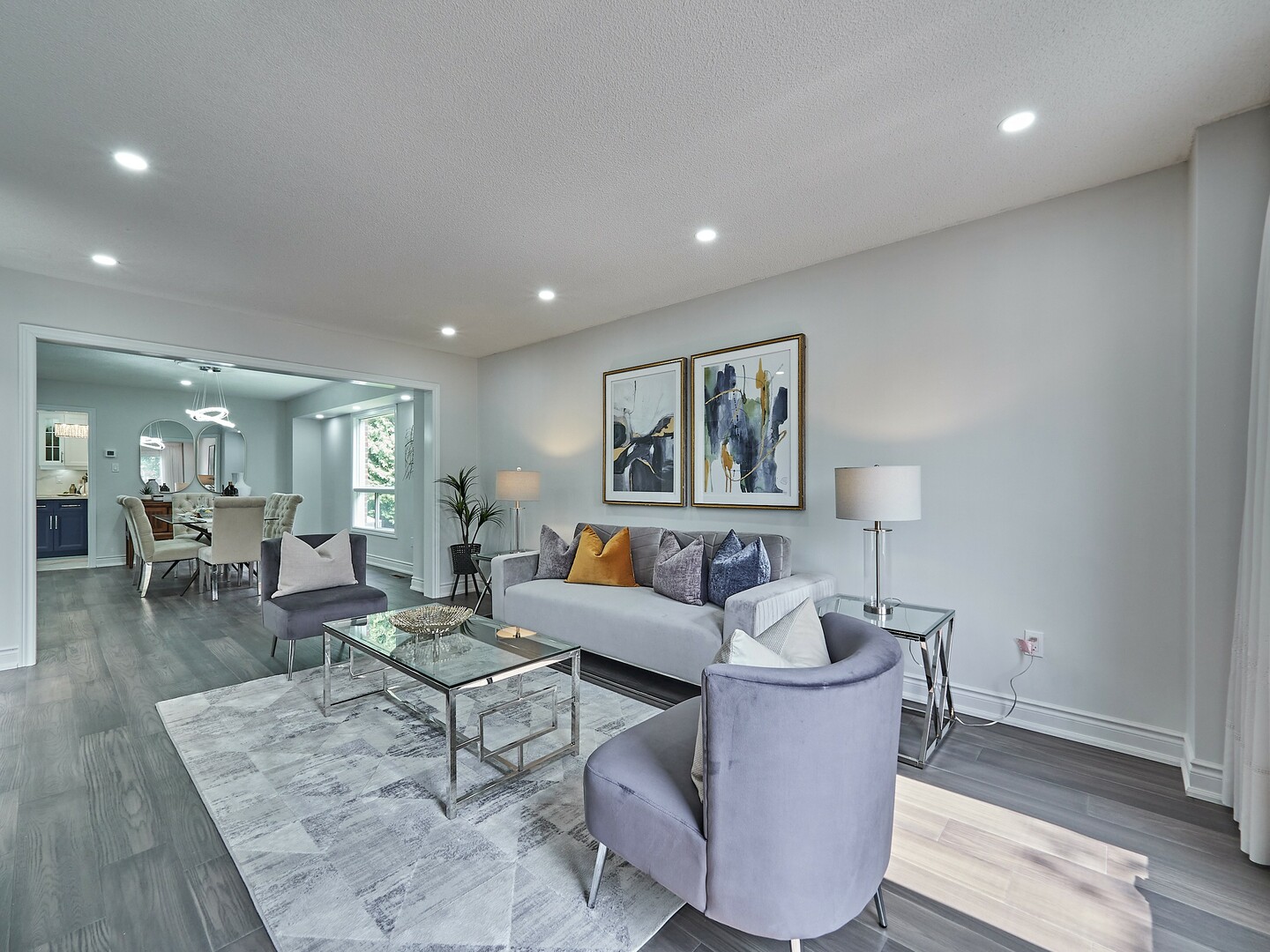 Large windows in the living and dining rooms bring beautiful natural light into these entertaining spaces - their neutral decor, crisp white trims, and pot lighting also featured throughout this level. Bringing modern elegance to these spaces is a pendant chandelier in the dining area, as well as new wide plank hardwood flooring, which also finishes the reception hall, the den, and both the laundry and family rooms.