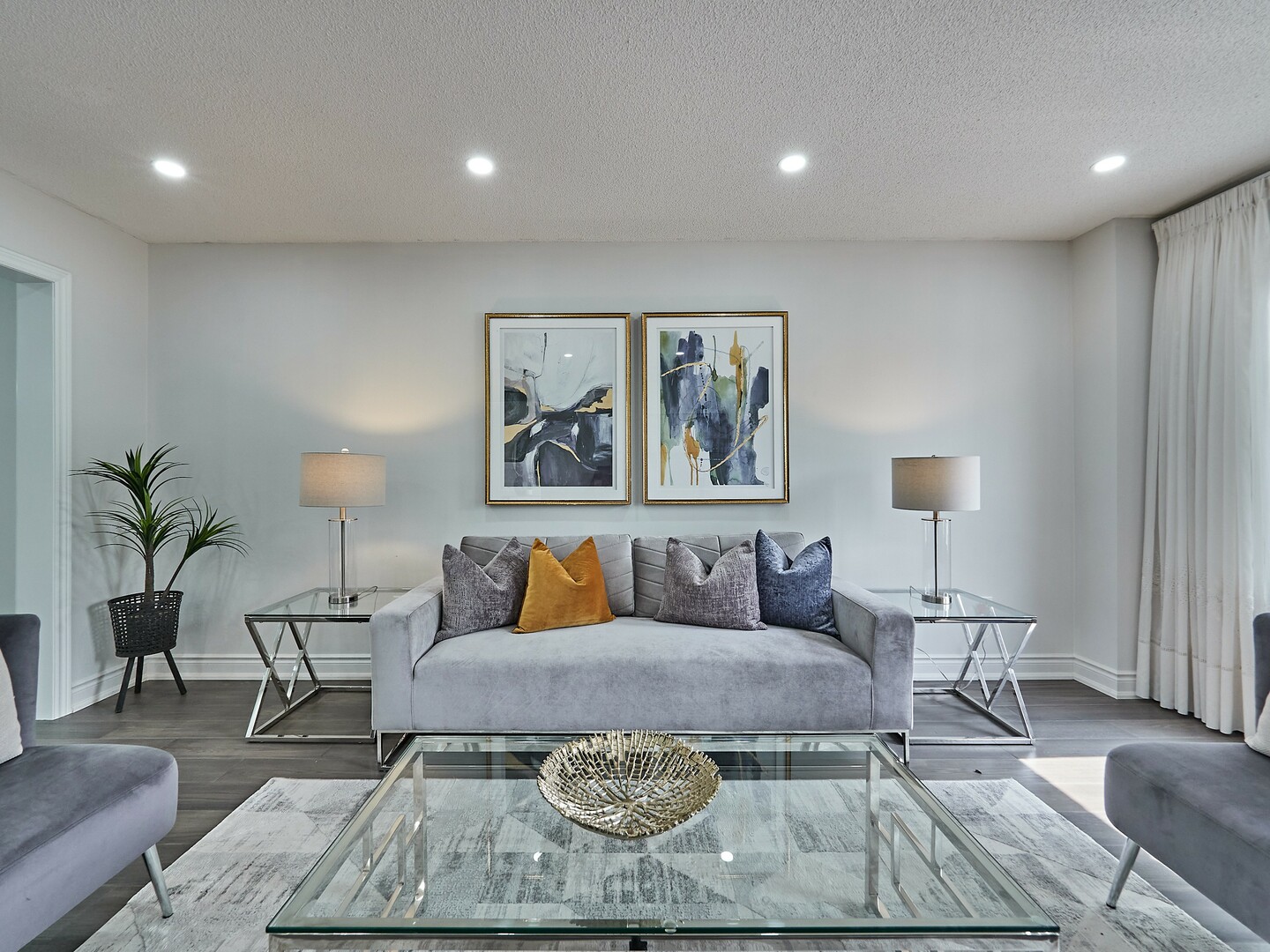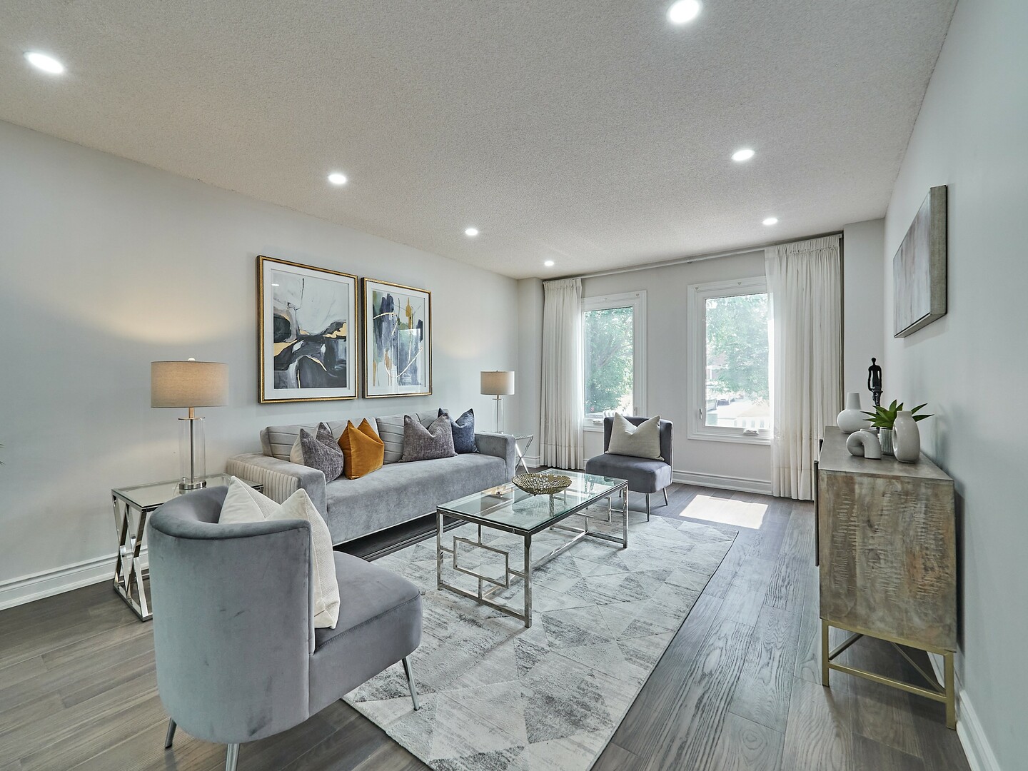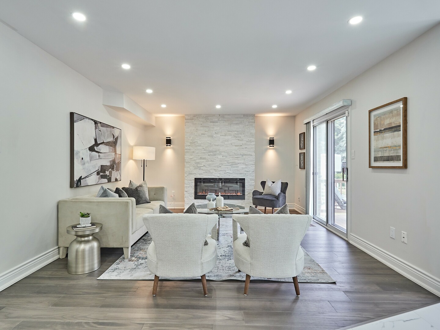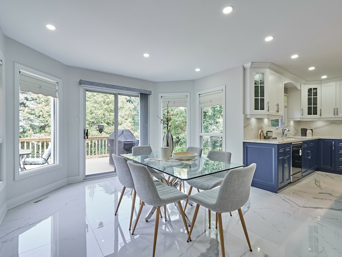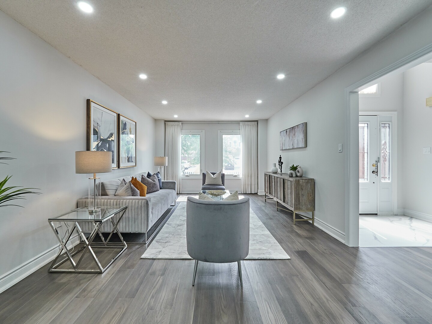 Large windows in the living and dining rooms bring beautiful natural light into these entertaining spaces - their neutral decor, crisp white trims, and pot lighting also featured throughout this level. Bringing modern elegance to these spaces is a pendant chandelier in the dining area, as well as new wide plank hardwood flooring, which also finishes the reception hall, the den, and both the laundry and family rooms.