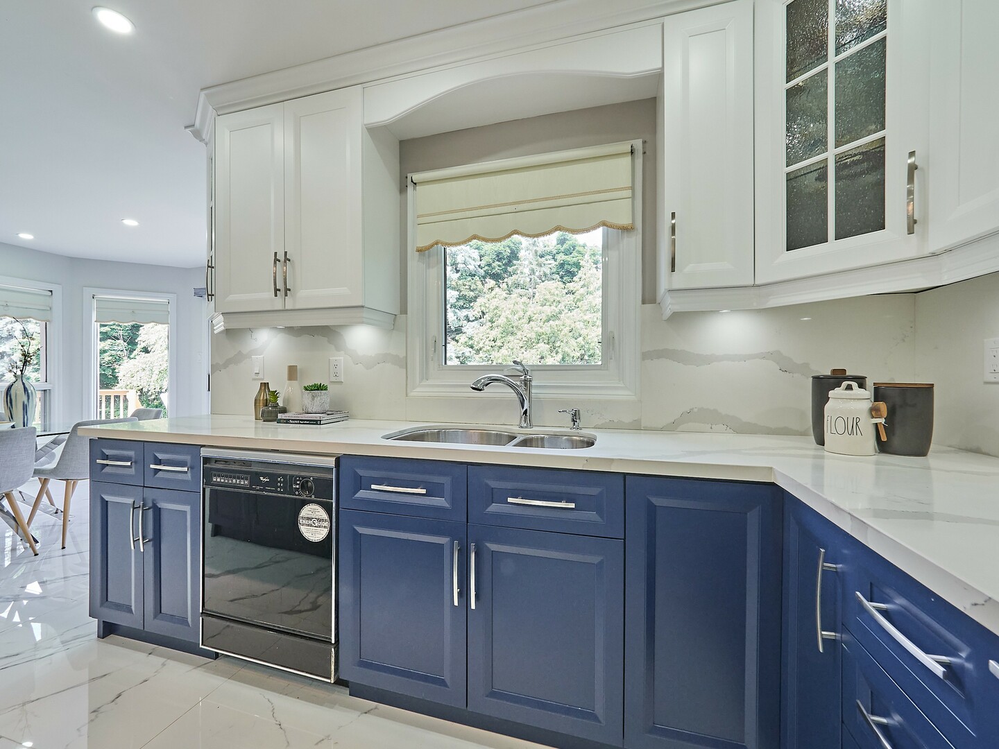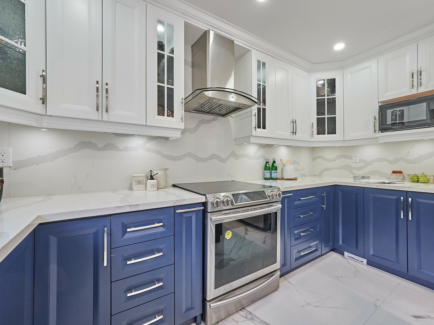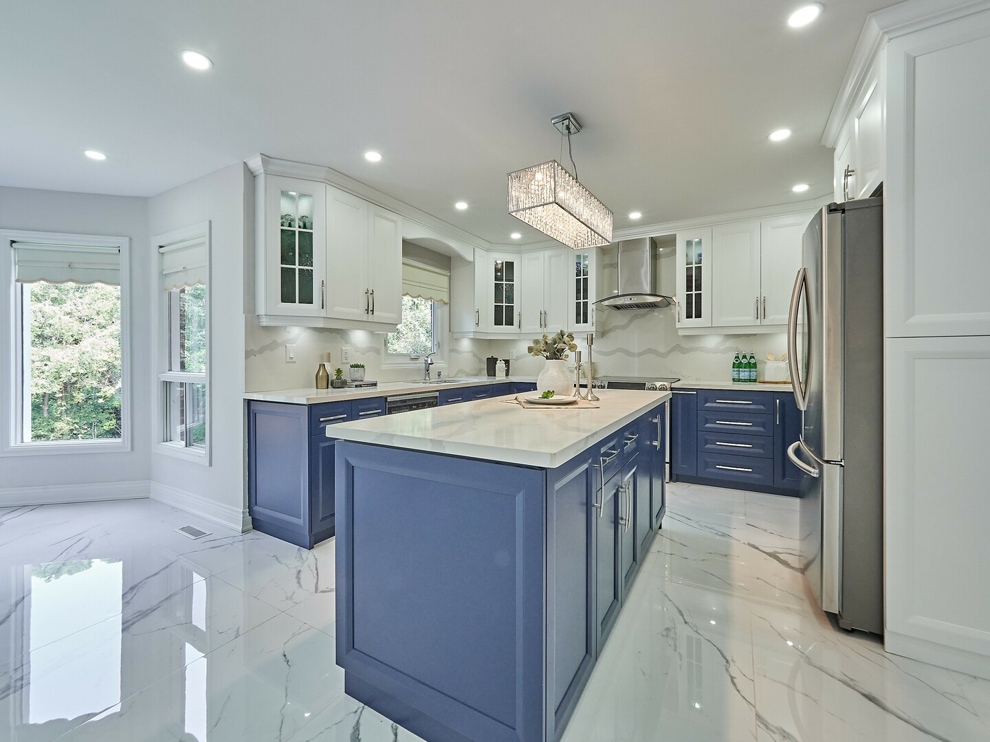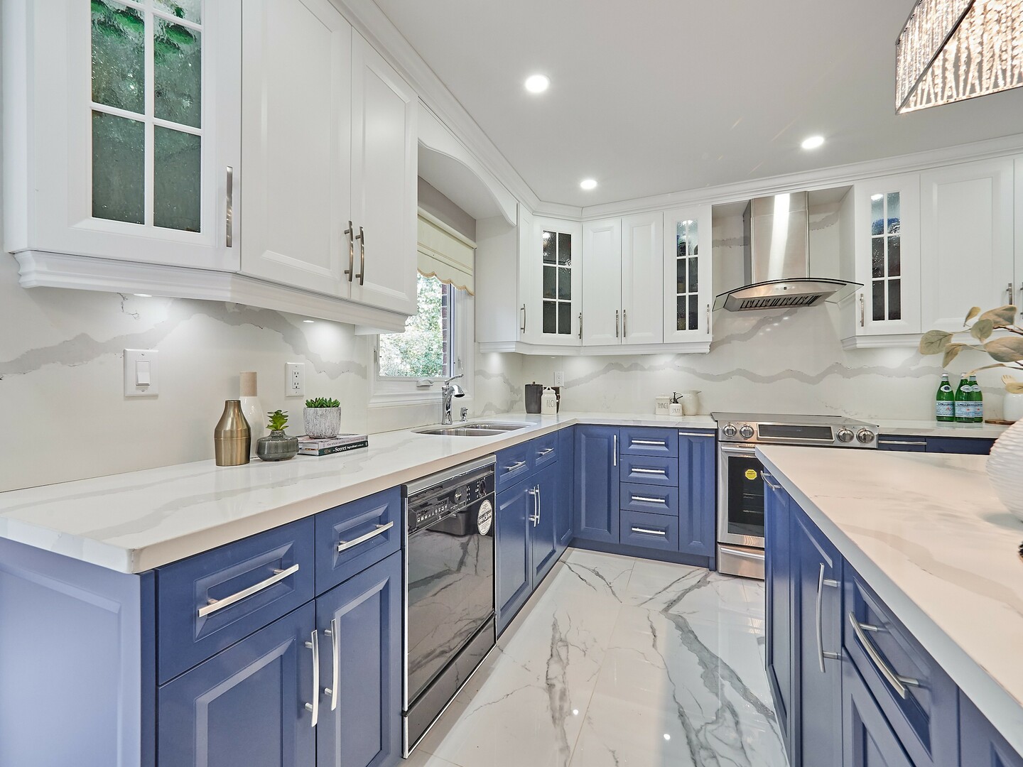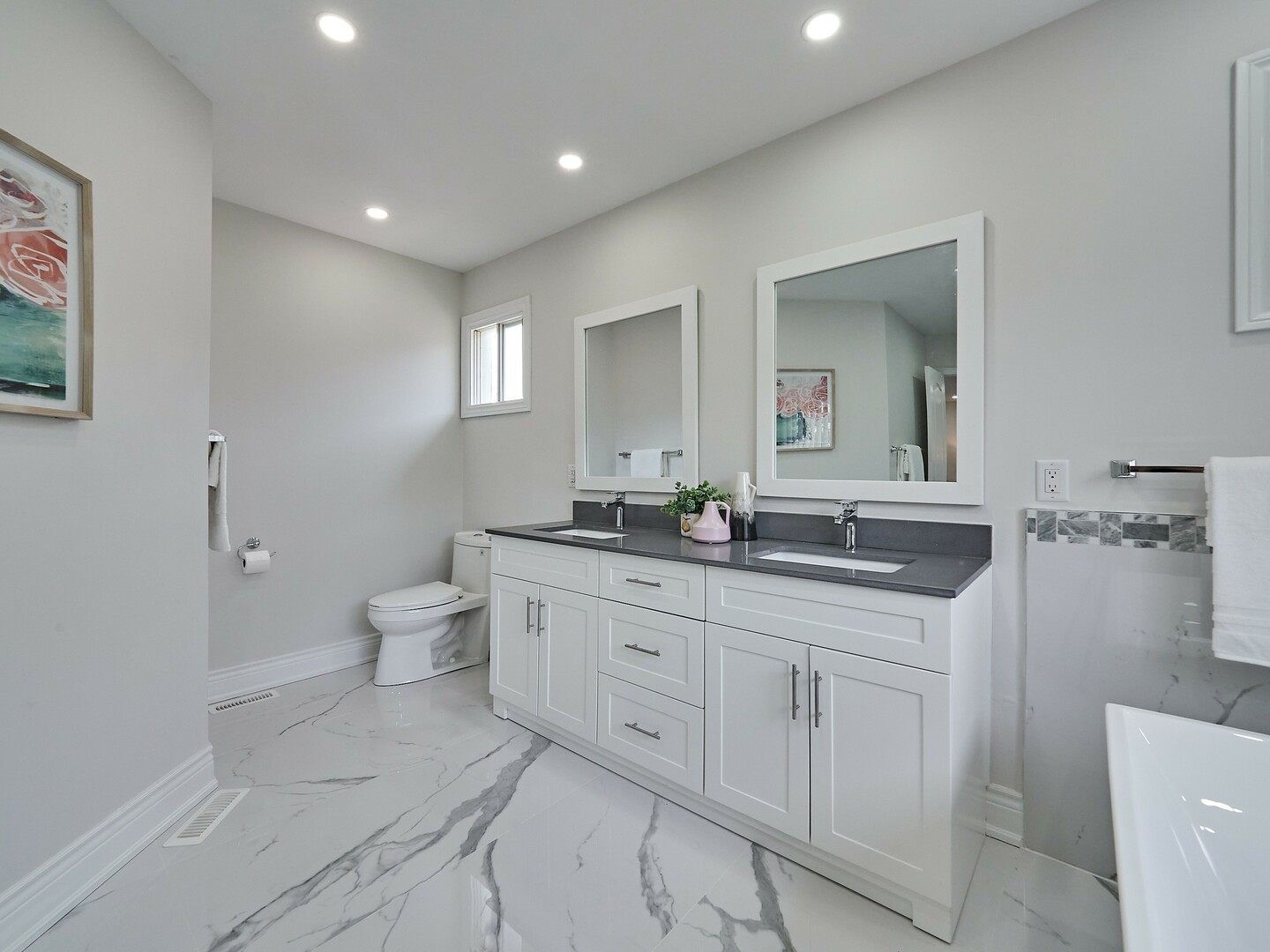 Large windows in the living and dining rooms bring beautiful natural light into these entertaining spaces - their neutral decor, crisp white trims, and pot lighting also featured throughout this level. Bringing modern elegance to these spaces is a pendant chandelier in the dining area, as well as new wide plank hardwood flooring, which also finishes the reception hall, the den, and both the laundry and family rooms.