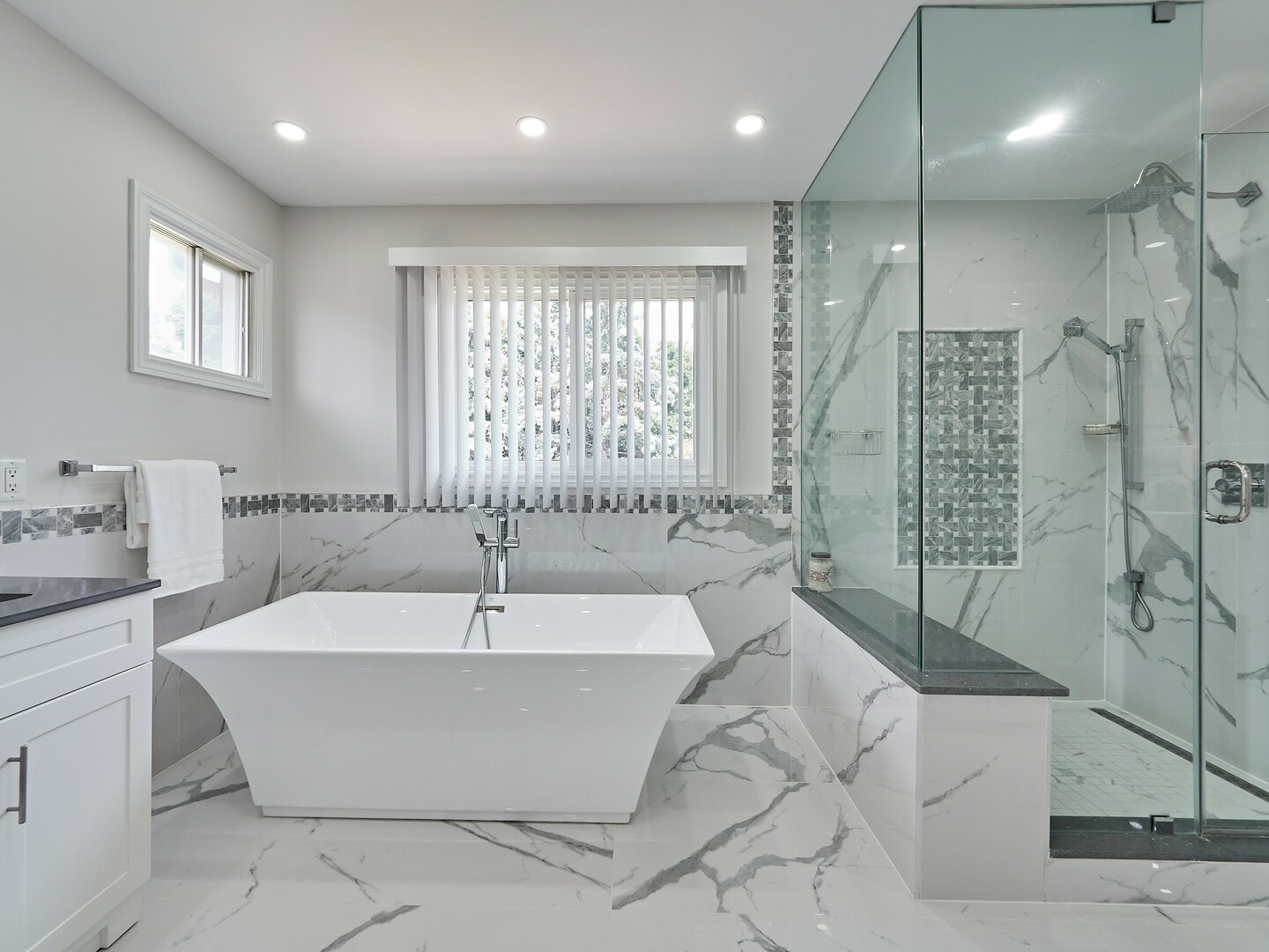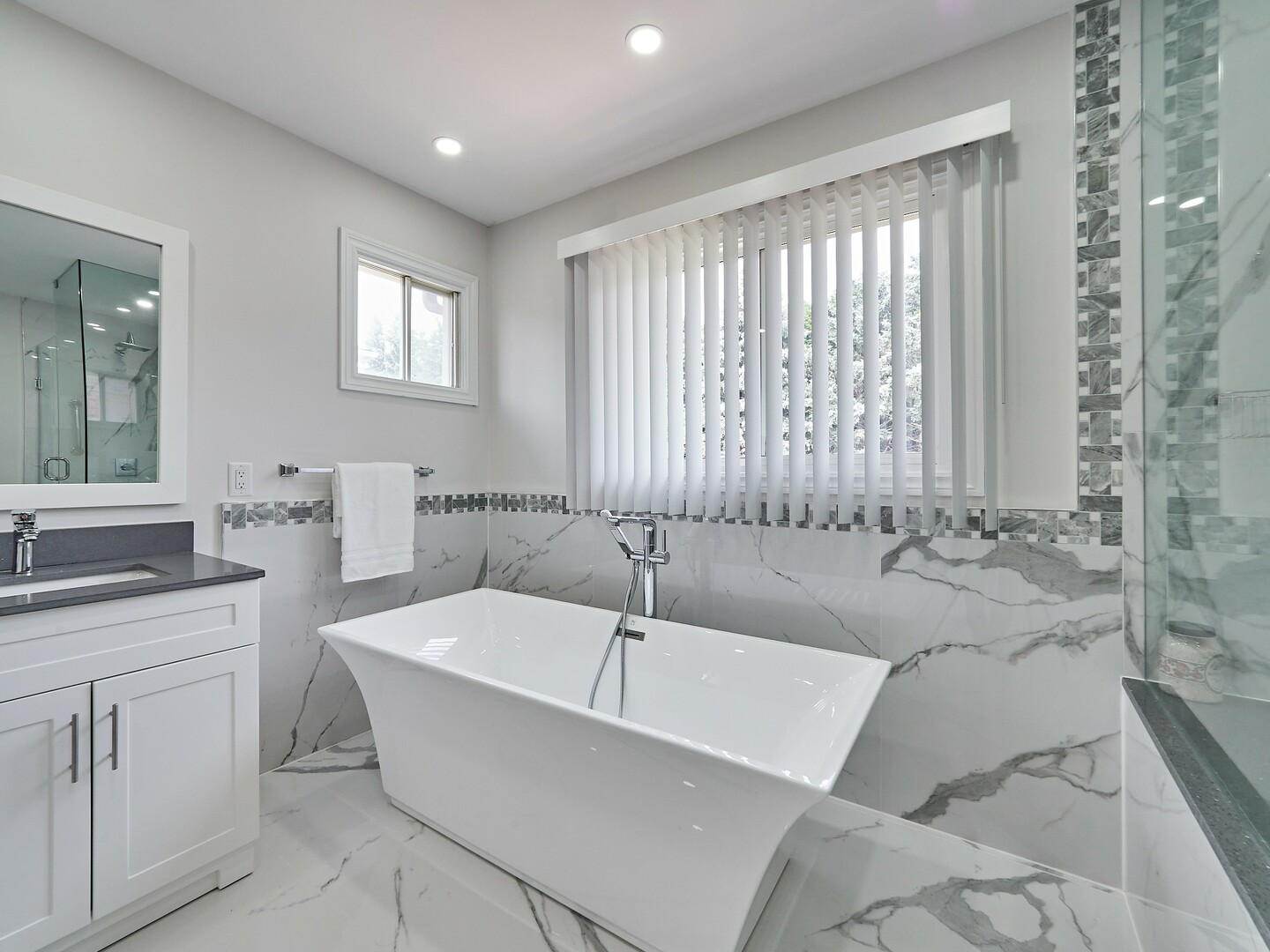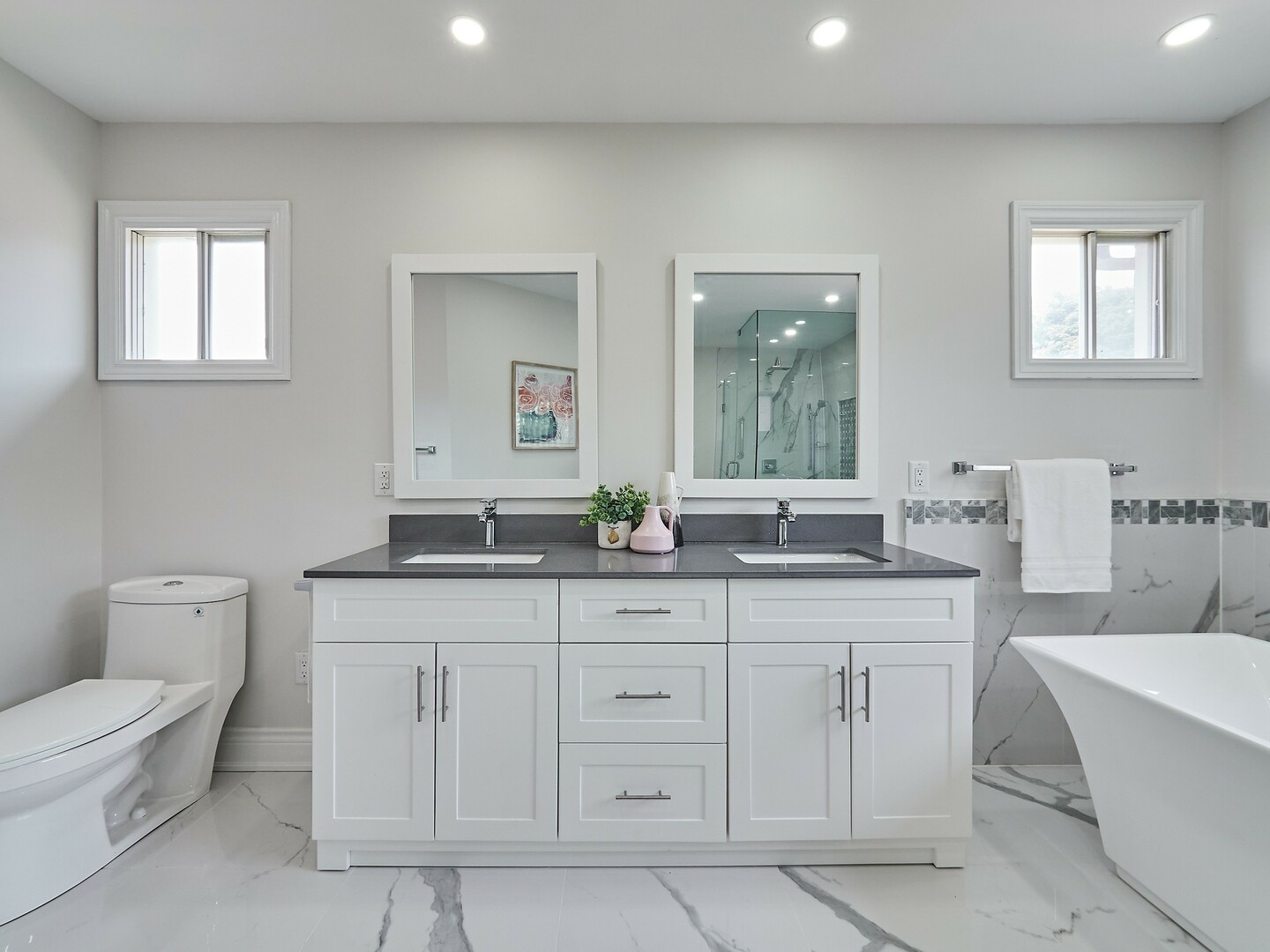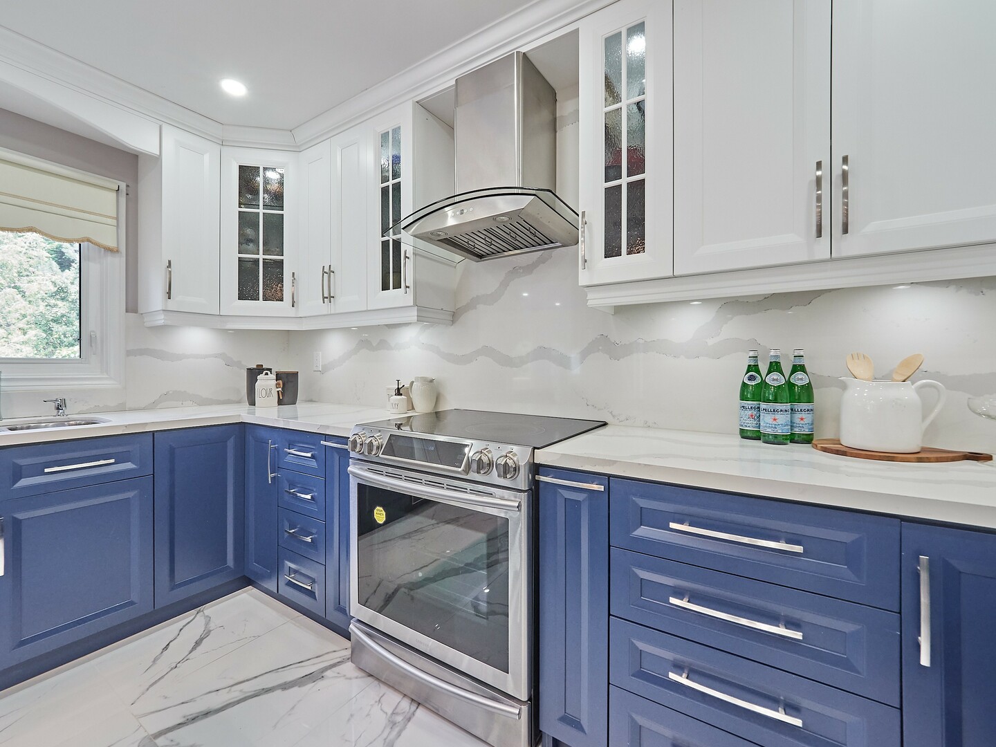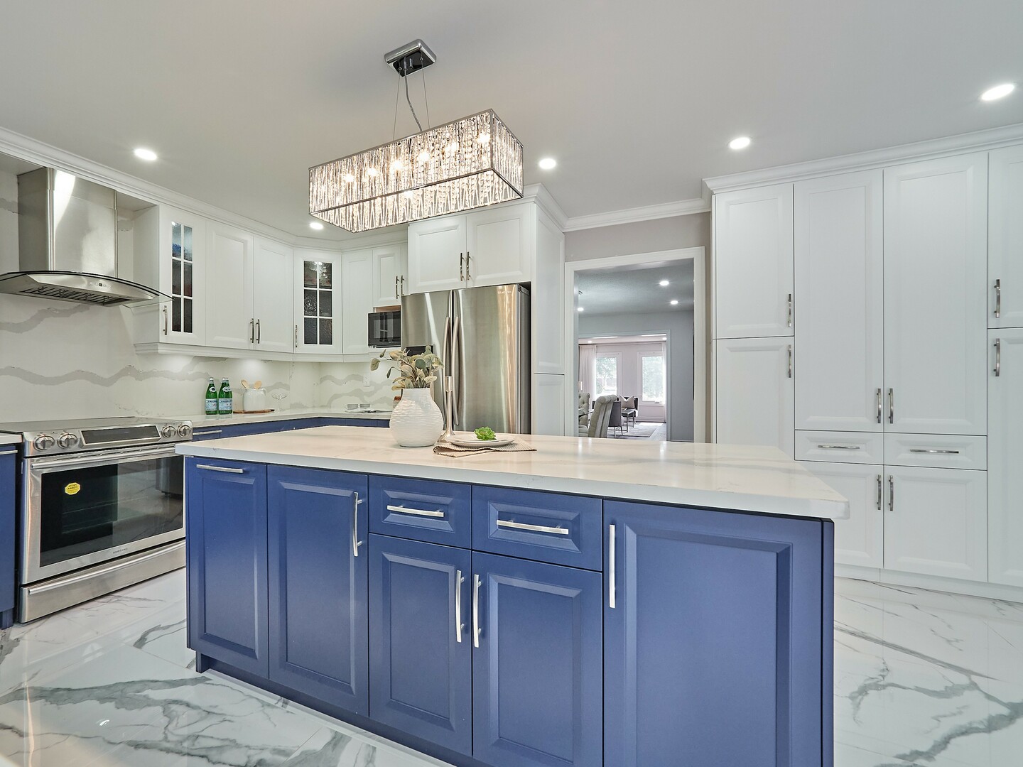 Large windows in the living and dining rooms bring beautiful natural light into these entertaining spaces - their neutral decor, crisp white trims, and pot lighting also featured throughout this level. Bringing modern elegance to these spaces is a pendant chandelier in the dining area, as well as new wide plank hardwood flooring, which also finishes the reception hall, the den, and both the laundry and family rooms.