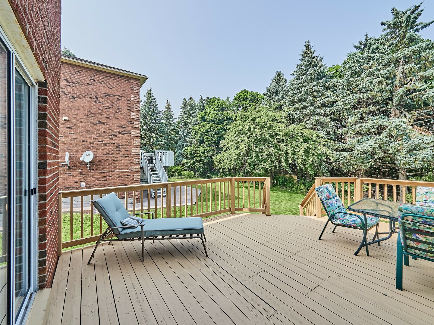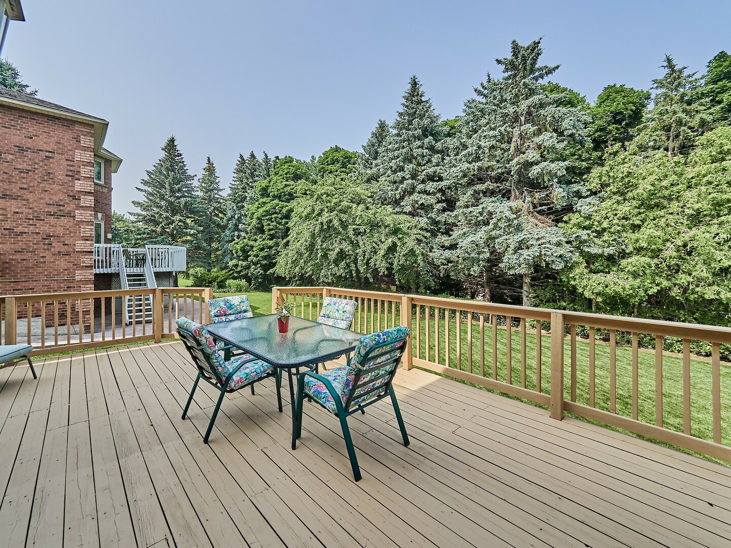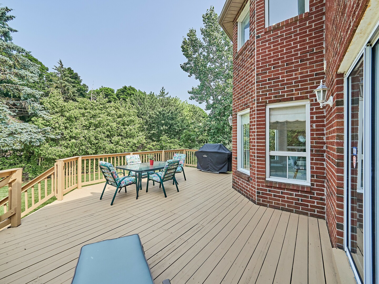 The sliding door walk-out in the breakfast area opens onto a large entertaining deck overlooking a backyard lined with mature trees and a meticulously maintained lawn.