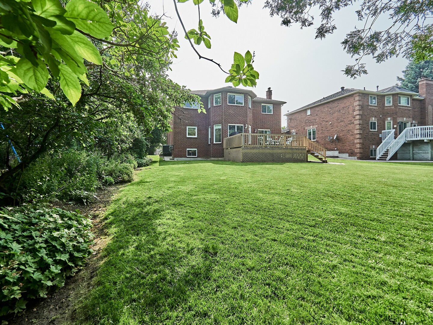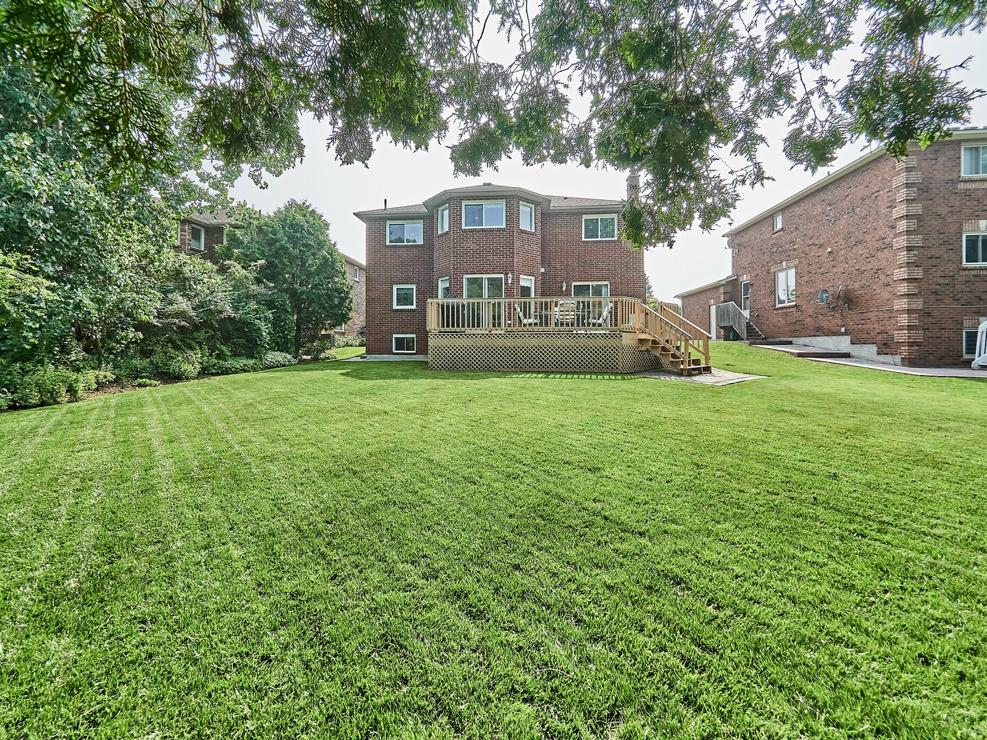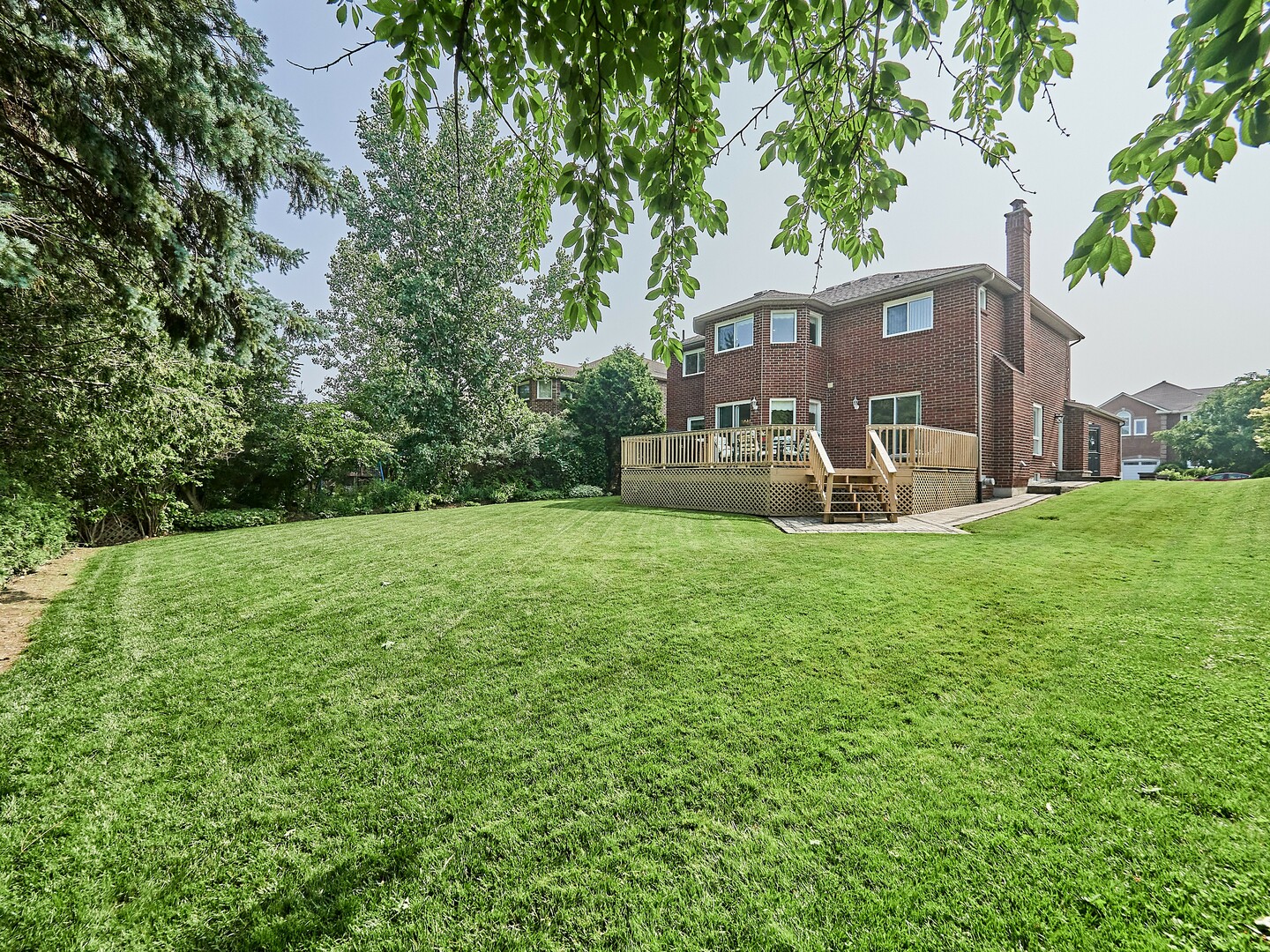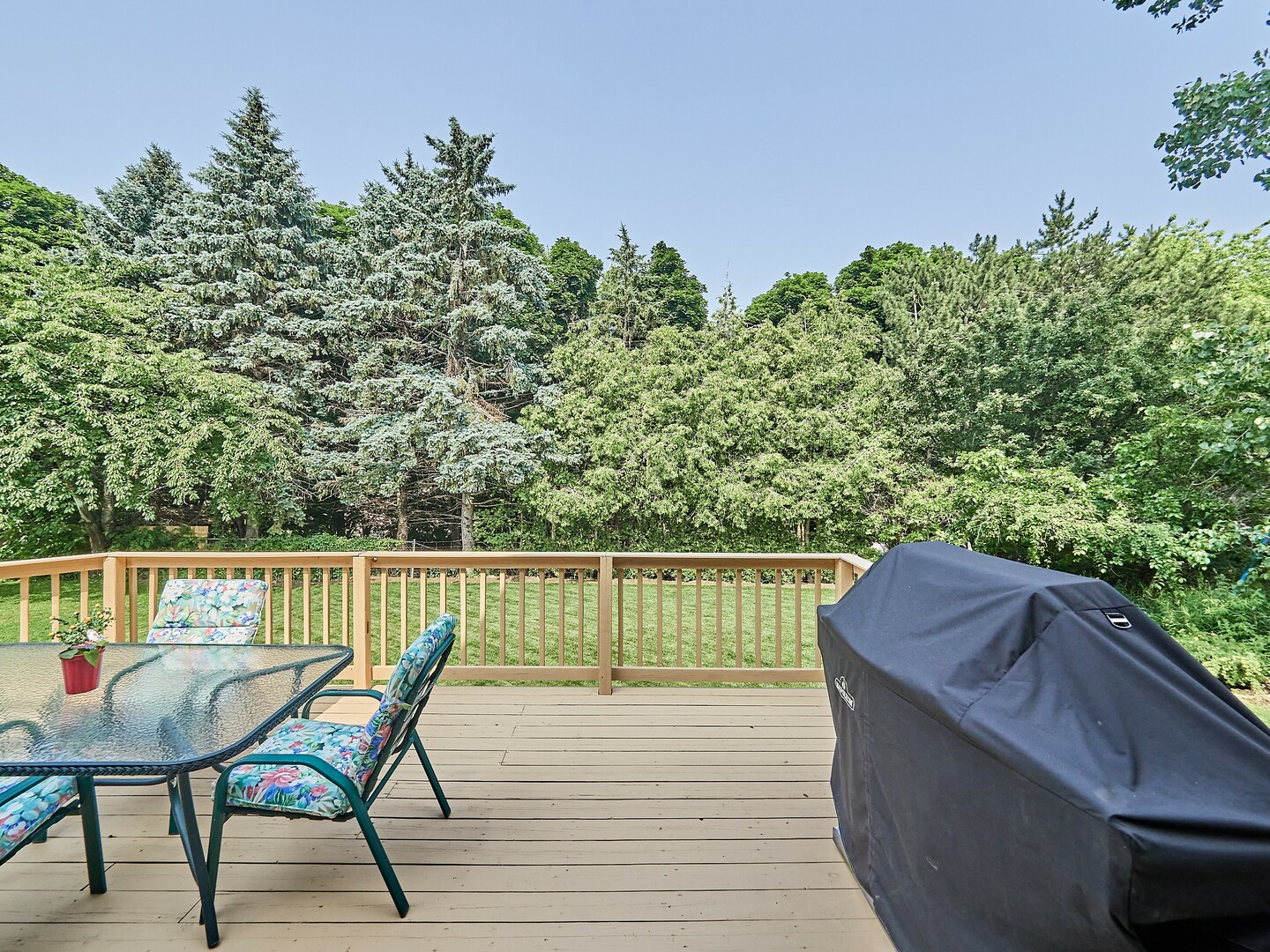 The sliding door walk-out in the breakfast area opens onto a large entertaining deck overlooking a backyard lined with mature trees and a meticulously maintained lawn.