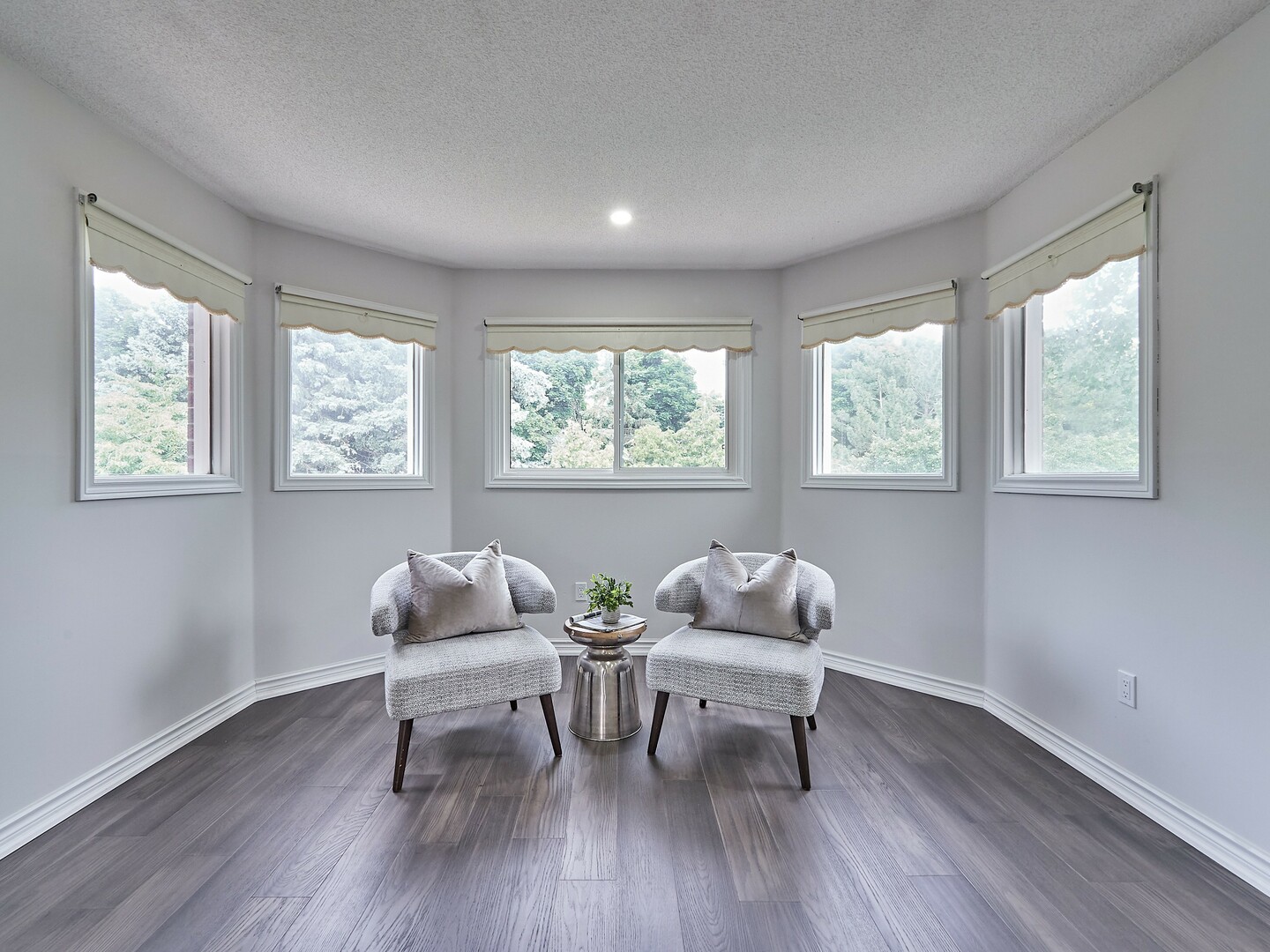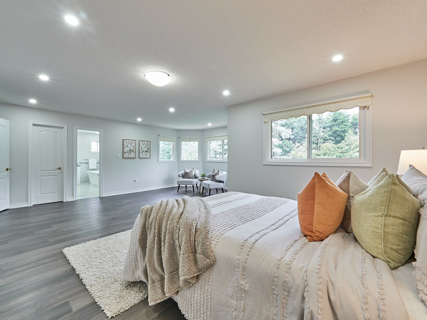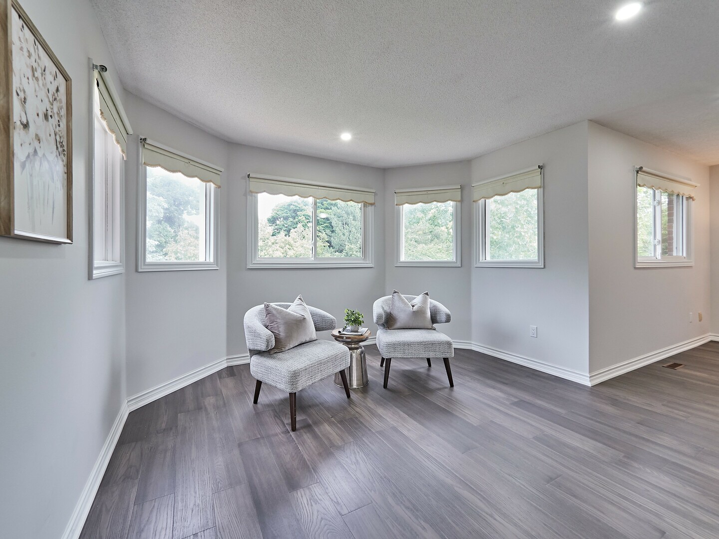 The impeccable master suite showcases a lovely sitting area by its turret wall - and daily views of greenery visible through its windows. Also featuring a double door entry and a large walk-in closet - its ensuite washroom showcases a vanity with quartz counter; a freestanding tub; a glass shower with a quartz-topped shower seat; as well as upgraded tiled finishes throughout, including basketweave accents.