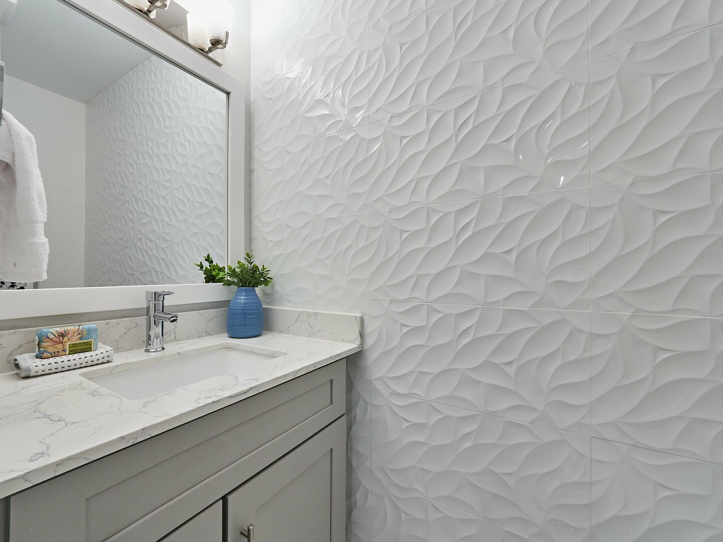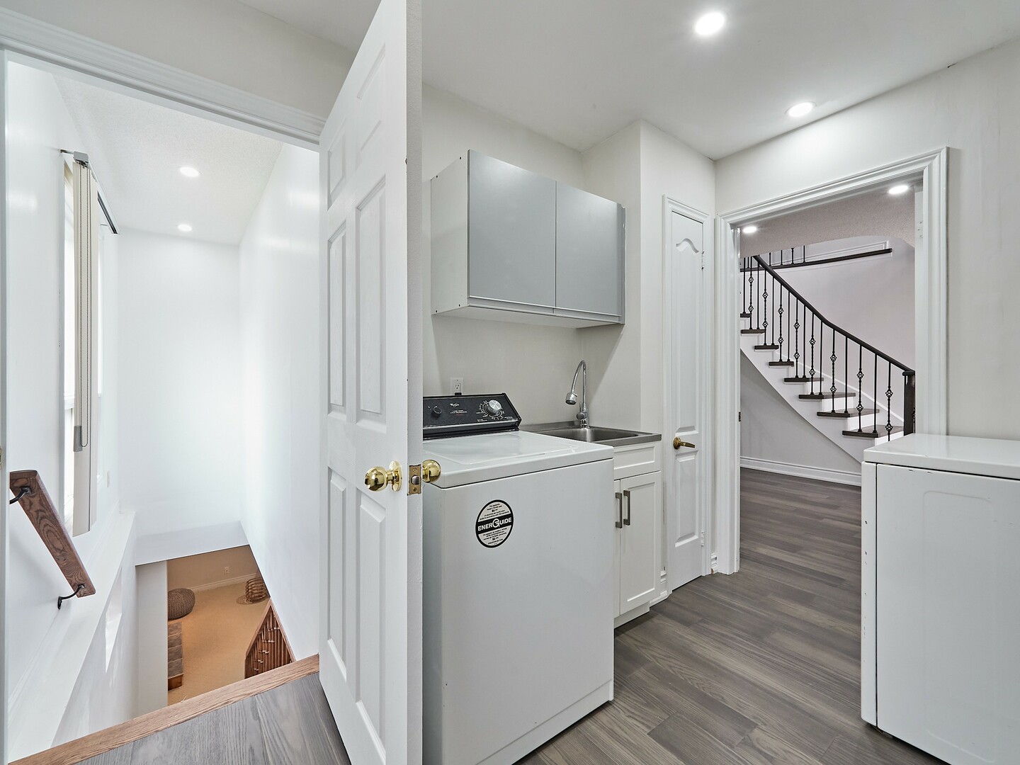 The main level additionally features a powder room with upgraded tiles and a vanity with quartz counter; a private den; and a laundry room with washer and dryer, a stainless steel sink, as well as access to both the garage and to the lower level - and curving to the upper level is a staircase with updated hardwood treads and a railing with wrought iron pickets.