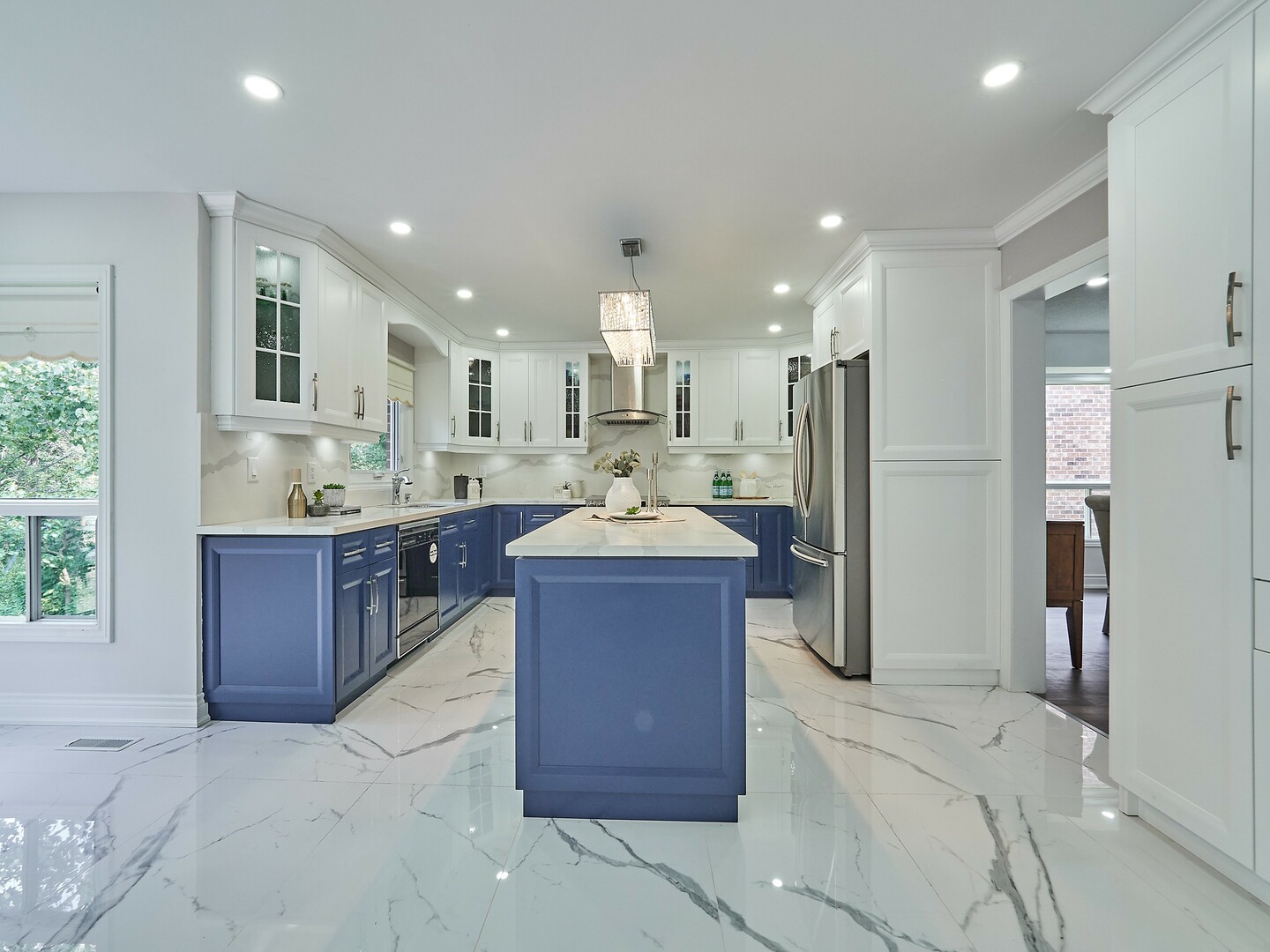 Fully open to the family room - the kitchen showcases a chandelier above the island; upgraded polished floor tiles; quartz counters and back splashes; a stainless steel double under mount sink, oven, range hood, and French door fridge; and cabinetry that features valance lighting, crown molding, glass-panelled accent doors, and storage that includes a separate wall pantry.