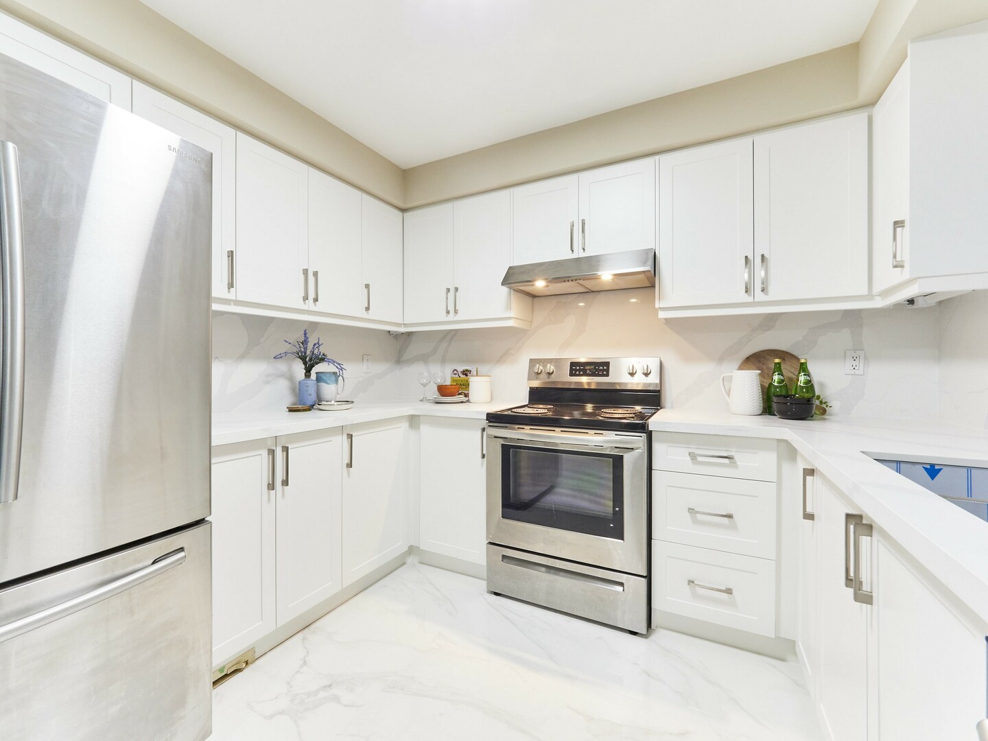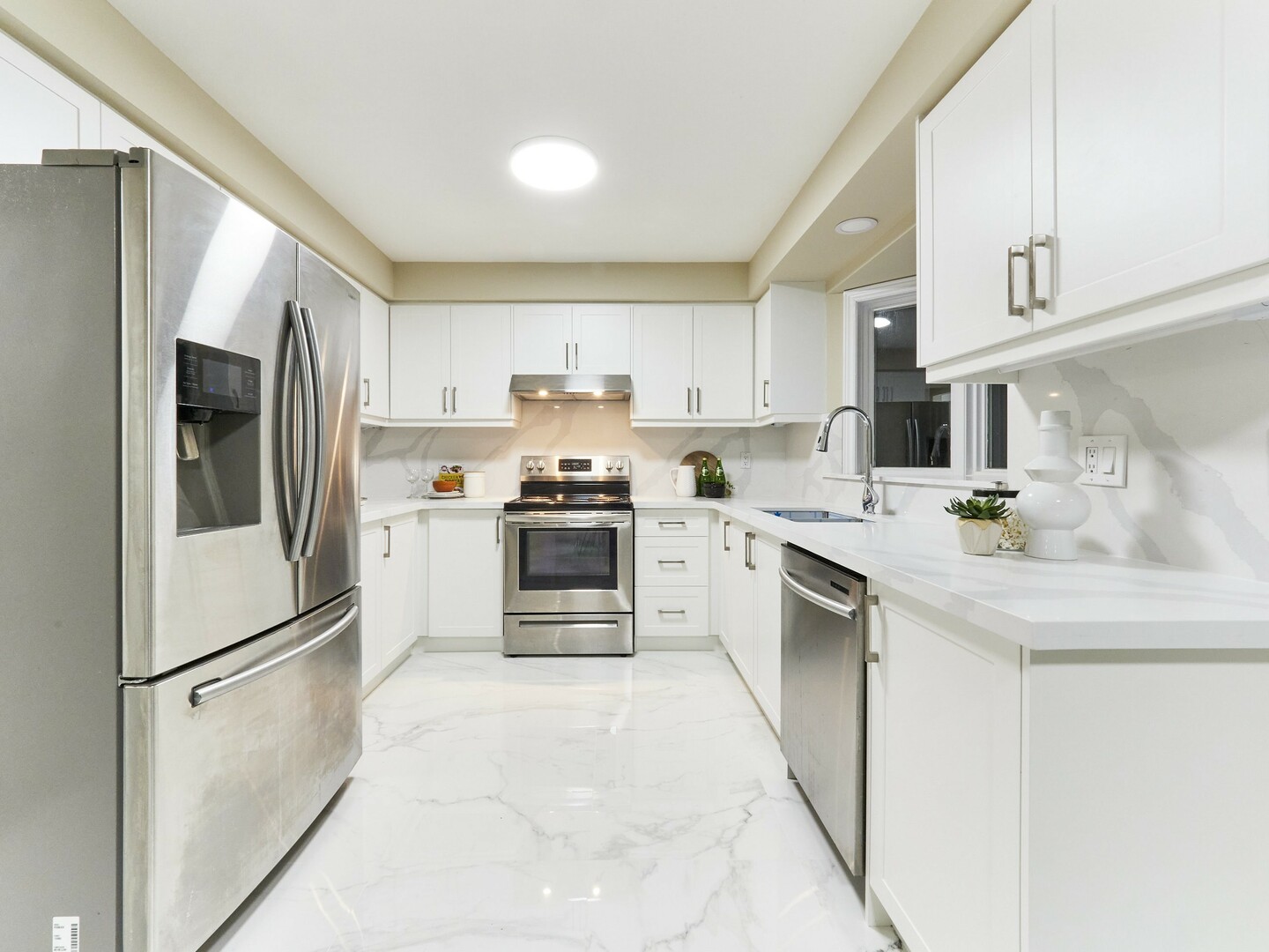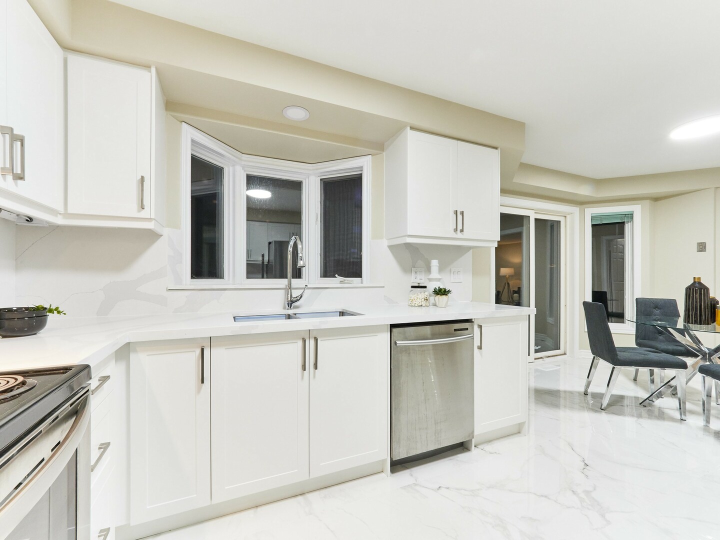 With a light colour palette, upgraded light fixtures, and large windows, the kitchen and its breakfast area are both incredibly bright - and with its updated modern design, the kitchen is as functional as it is gorgeous. A joy for the home chef, this space showcases crisp white cabinetry with under cabinet lighting, plus a built-in pantry in the breakfast area; quartz counters and back splashes; stainless steel appliances; as well as a new stainless steel double under mount sink with a new gooseneck faucet, the bay window above the sink also finished with a quartz ledge - and during the warm weather months, entertaining easily extends to the outdoors through a sliding door walk-out, which opens to a fully fenced and nicely sized backyard that is landscaped with garden beds and a large patio area.