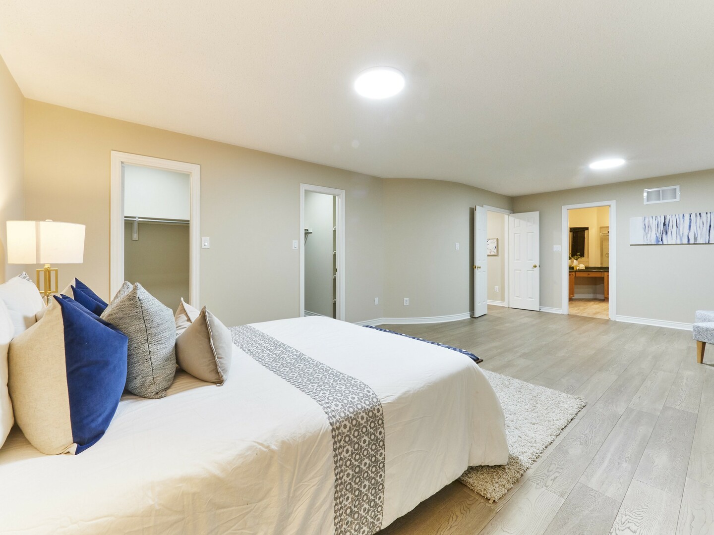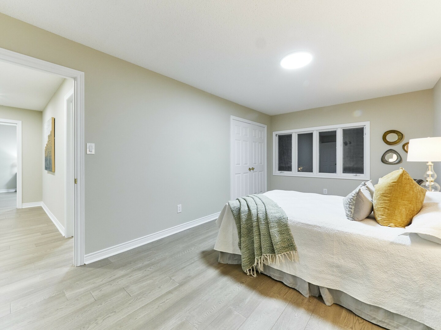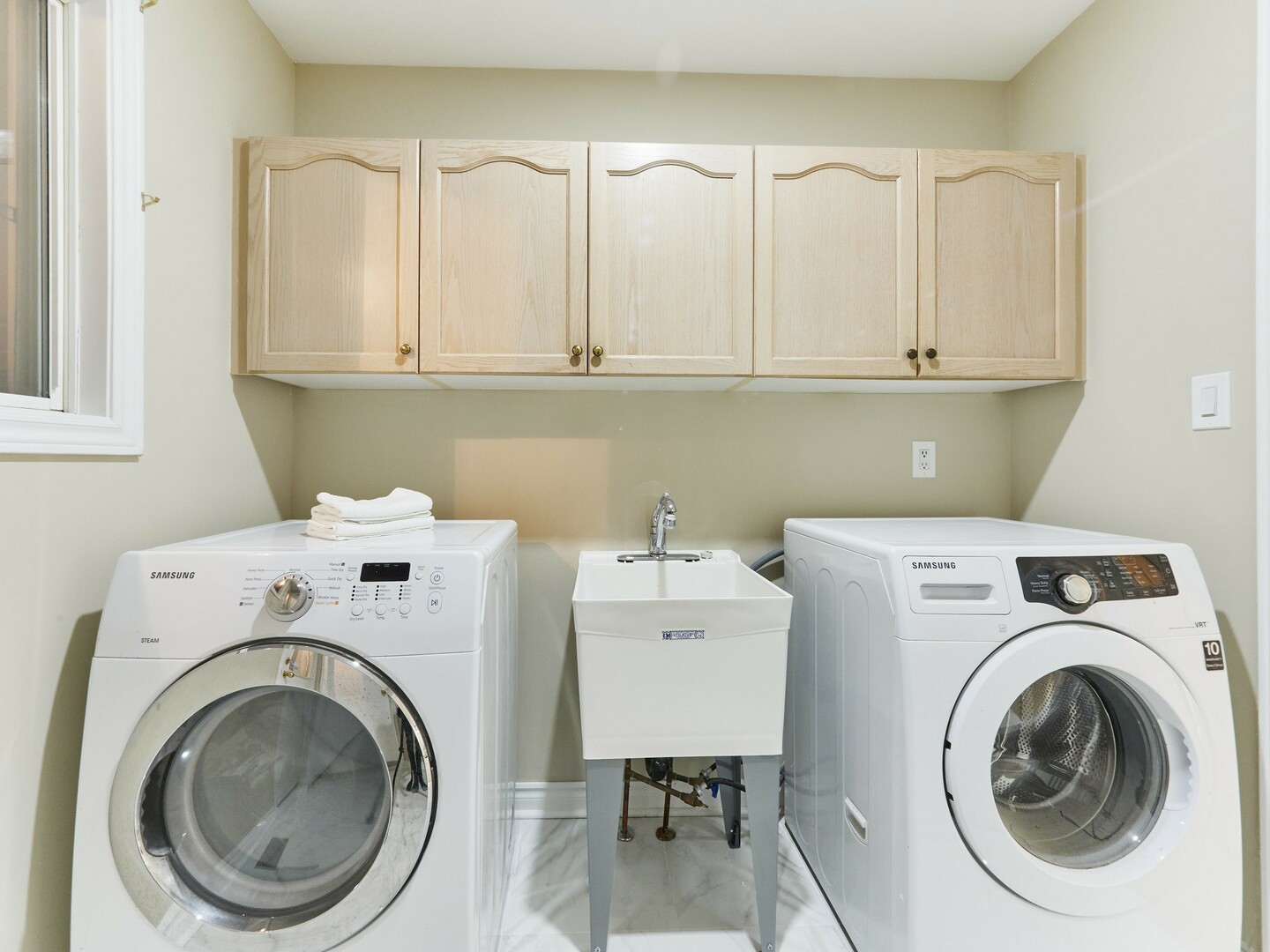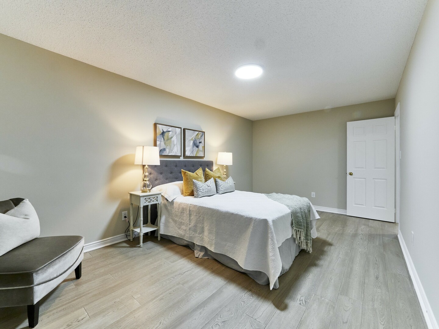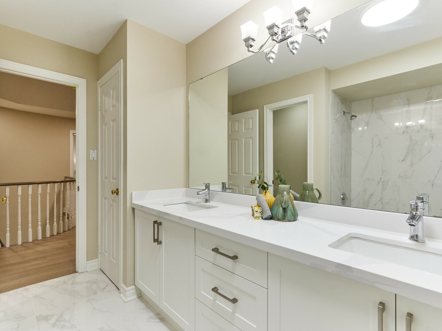 Of the two washrooms on this level, the main 5-pc has been beautifully updated, and showcases a new vanity with quartz counter and under mount basins, upgraded tiles finishing the bath area and the floor, upgraded light fixtures, as well as a water closet and a linen closet.