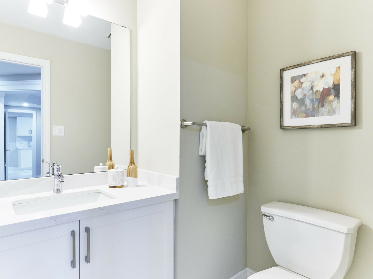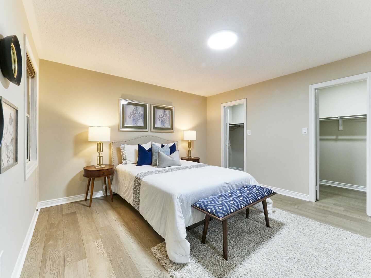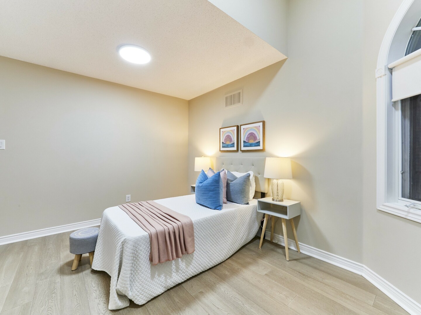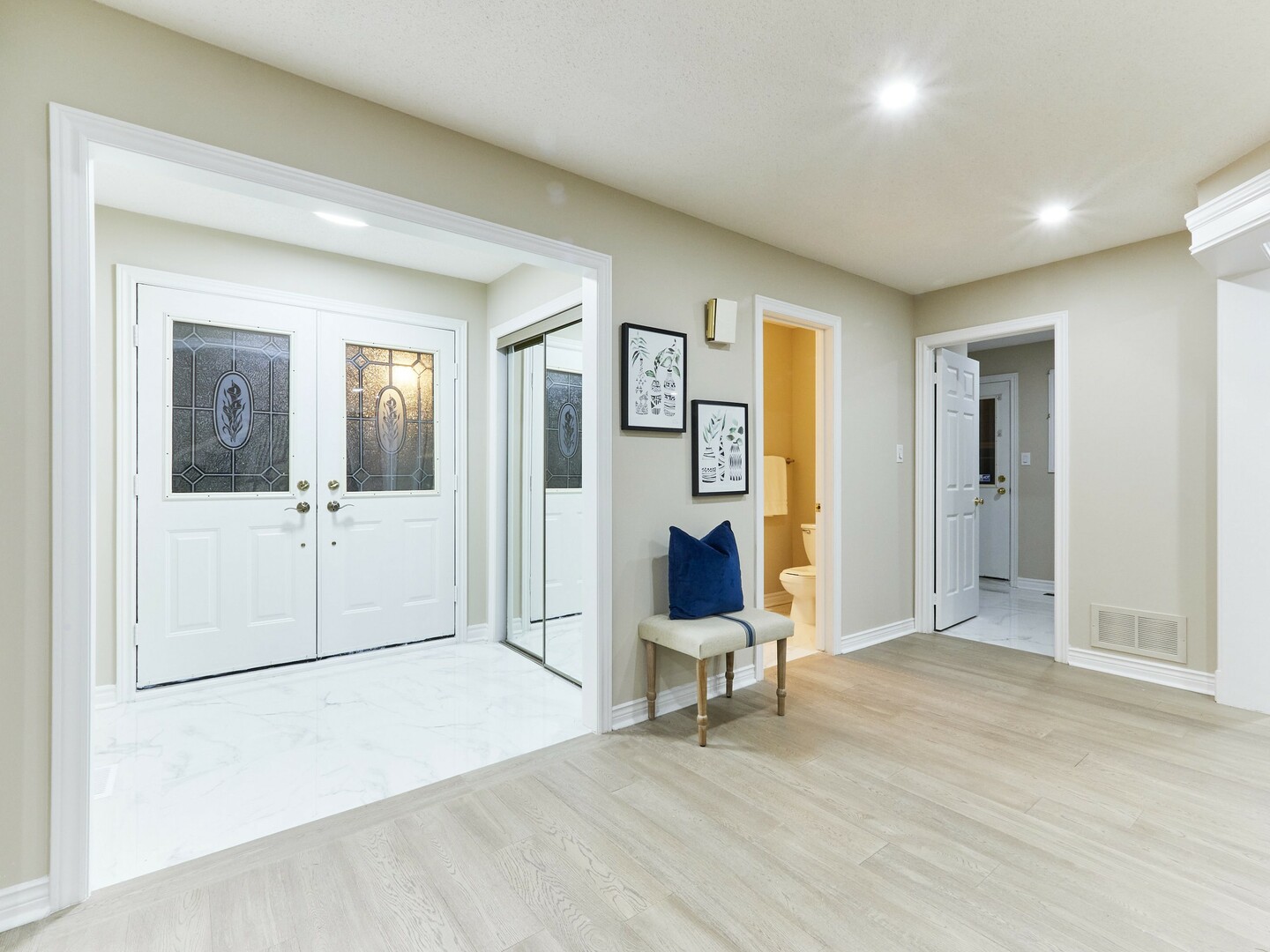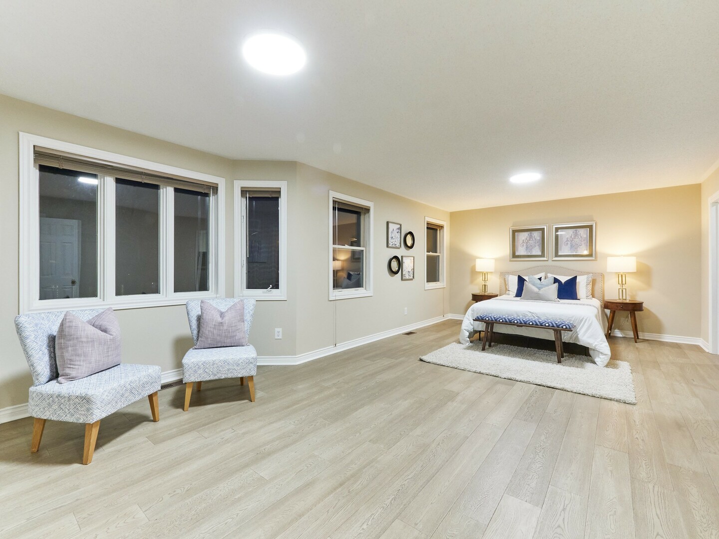 Of the two washrooms on this level, the main 5-pc has been beautifully updated, and showcases a new vanity with quartz counter and under mount basins, upgraded tiles finishing the bath area and the floor, upgraded light fixtures, as well as a water closet and a linen closet.
