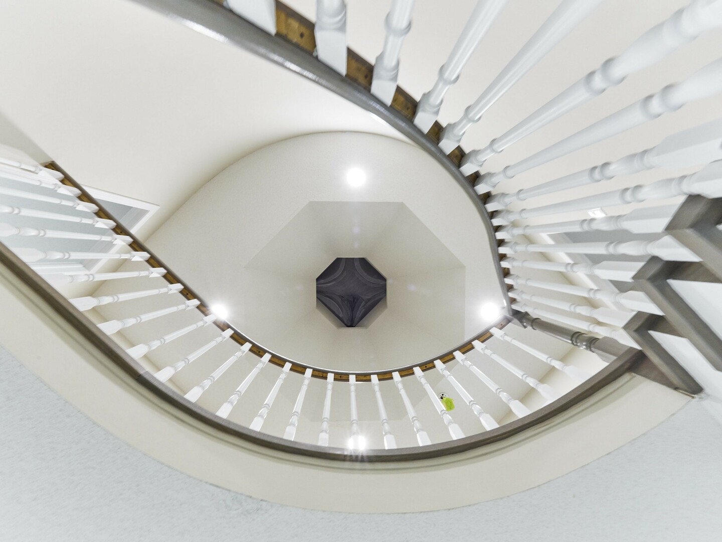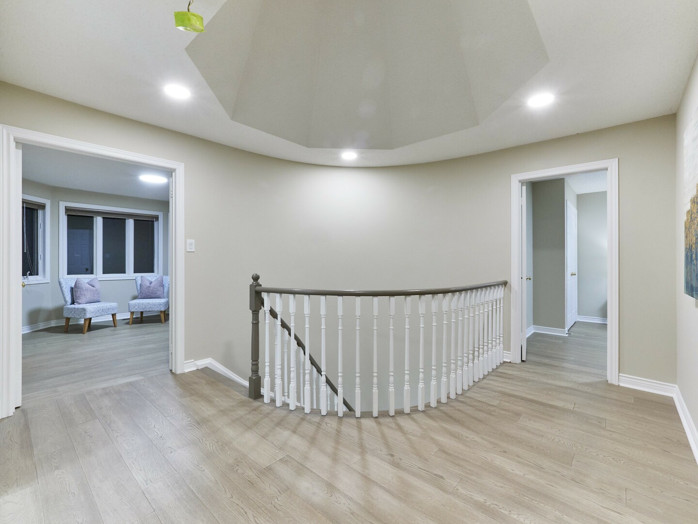 The upper level is finished with wide plank engineered hardwood flooring throughout, and above the staircase - surrounded by pot lighting - is John Boddy’s iconic octagonal-shaped skylight.