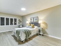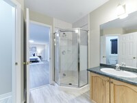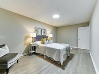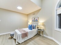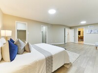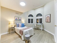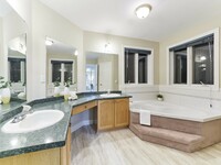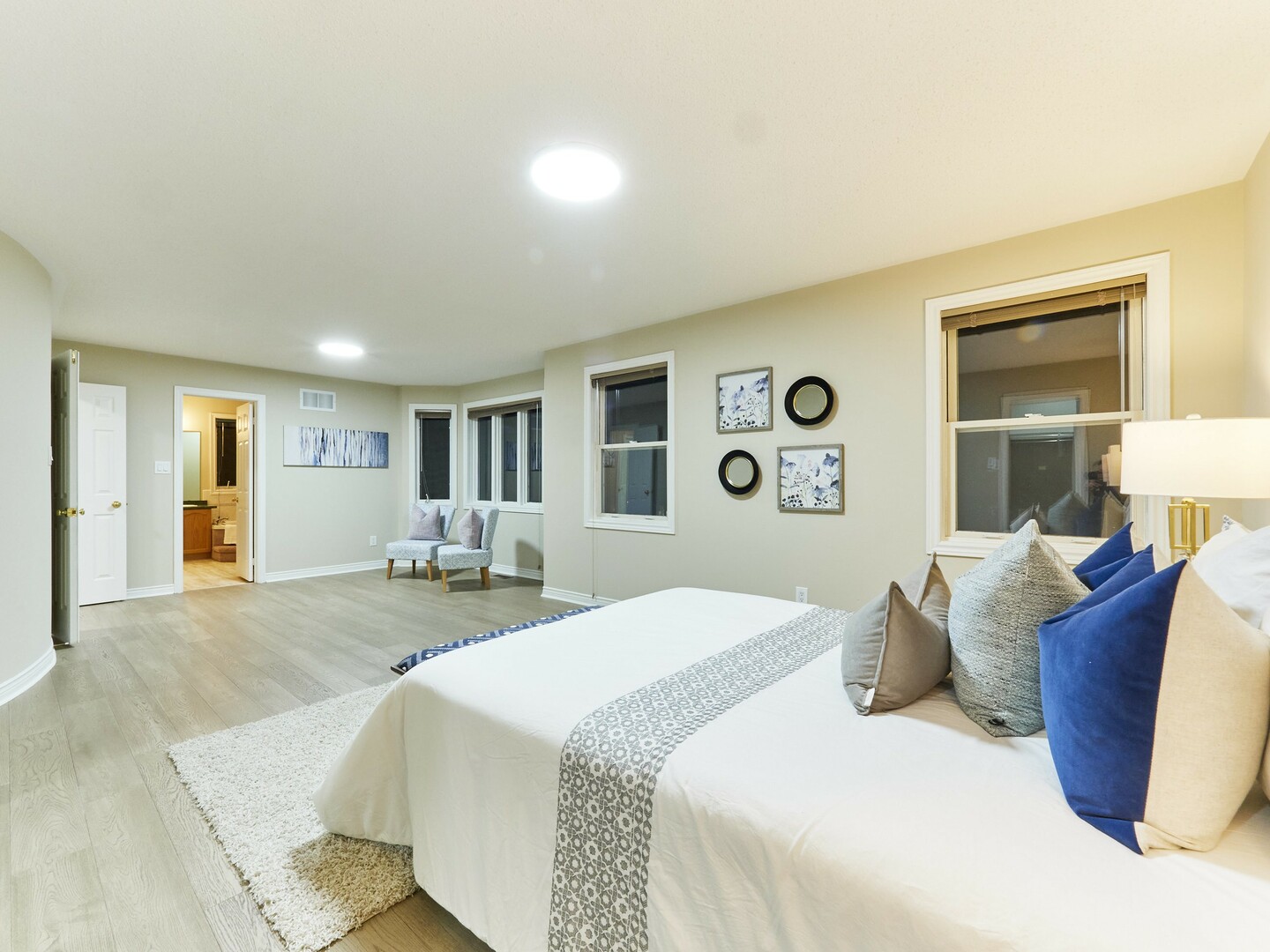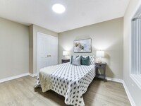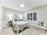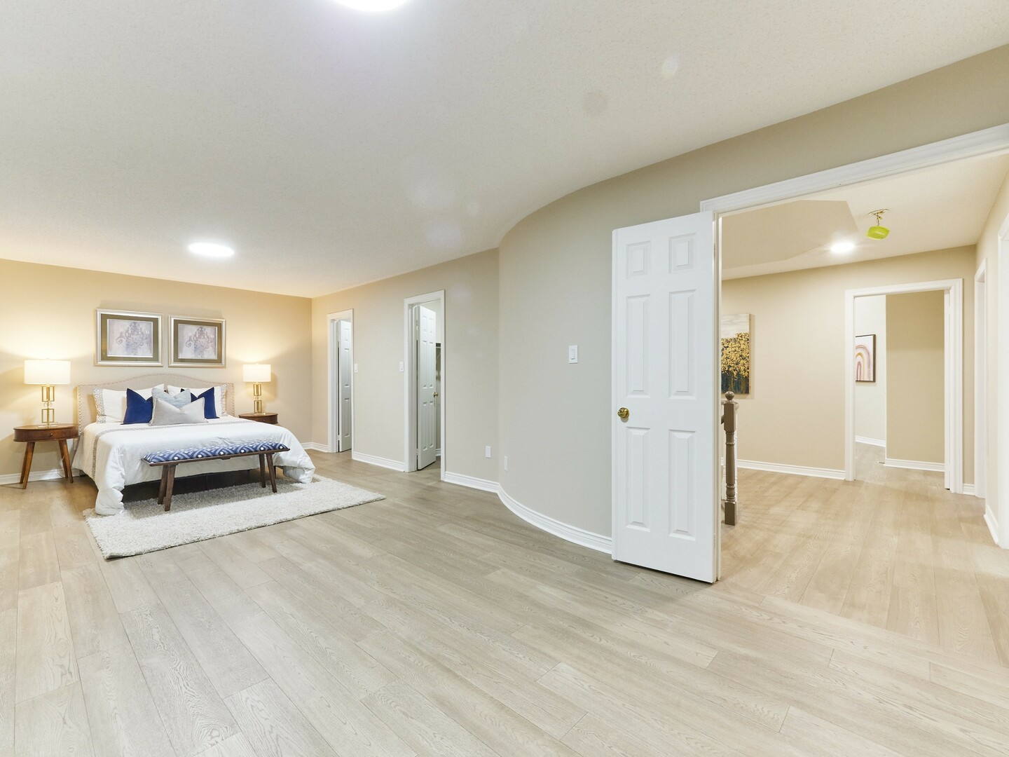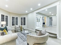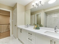 The very generously sized master suite has a double door entry, and the turret-shaped portion of its north wall is an ideal sitting area, while windows along this wall fill this lovely retreat with soft natural light. The bedroom also showcases upgraded light fixtures and two walk-in closets with pot lights - and its 5-pc ensuite washroom features a glass shower area; a water closet; a step-up corner tub; as well as a corner vanity with drop-in basins separated by a make-up counter.