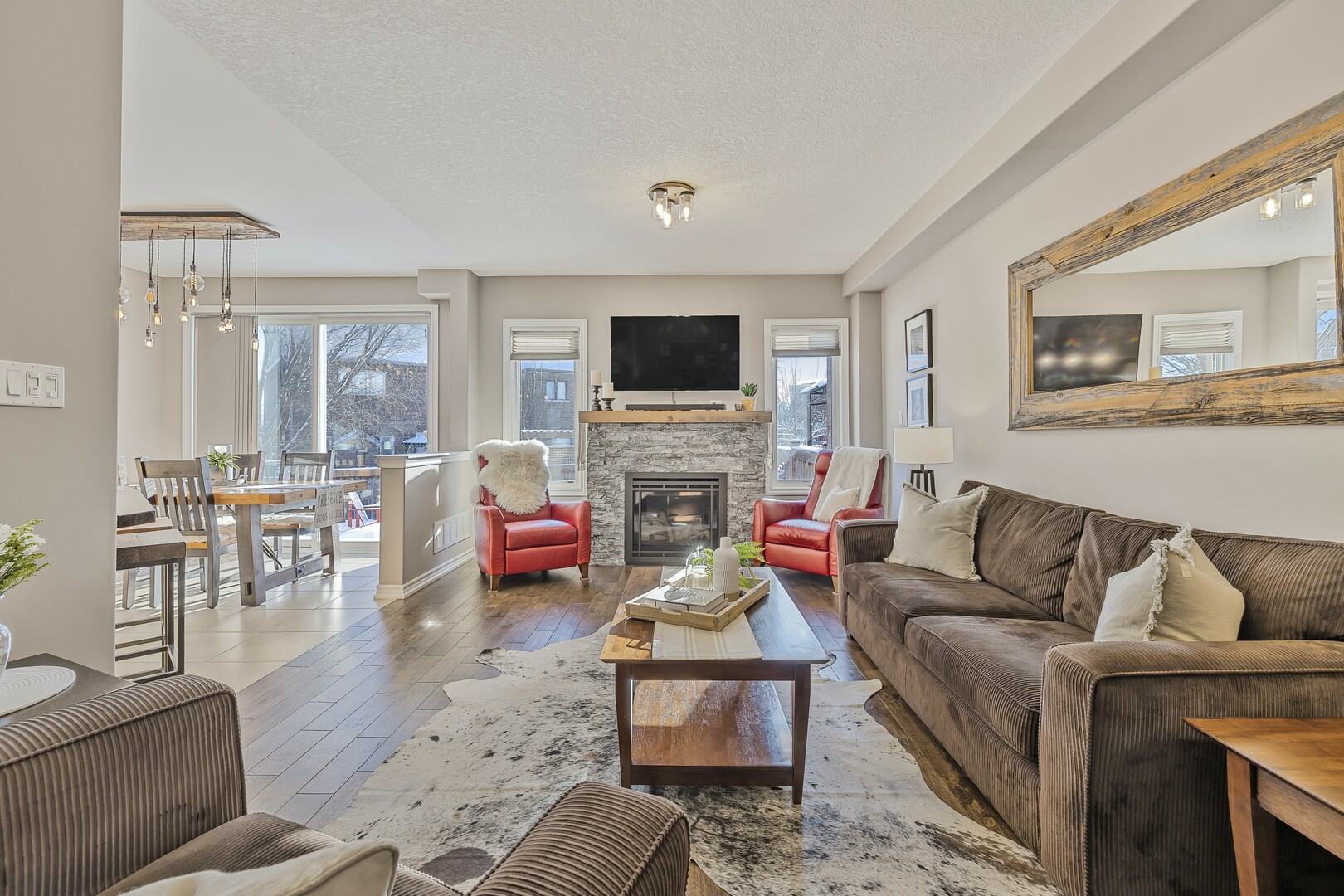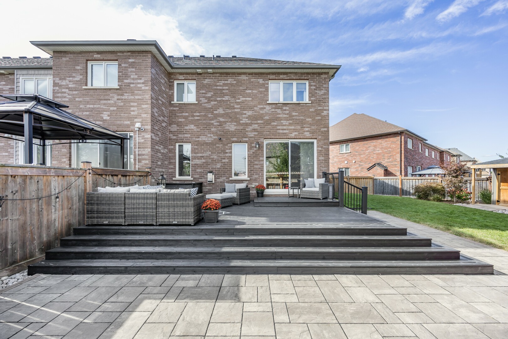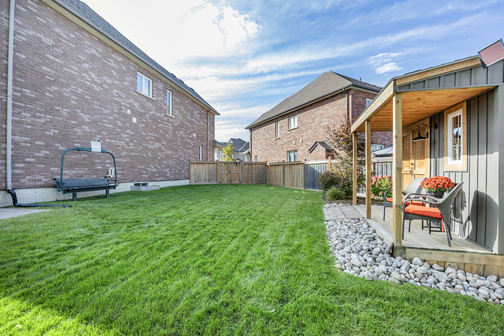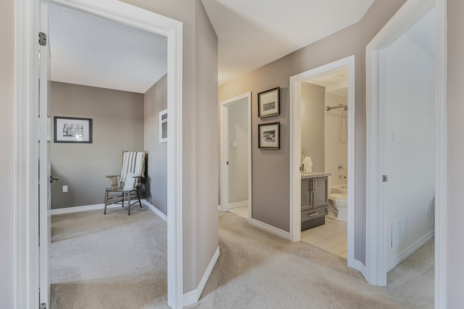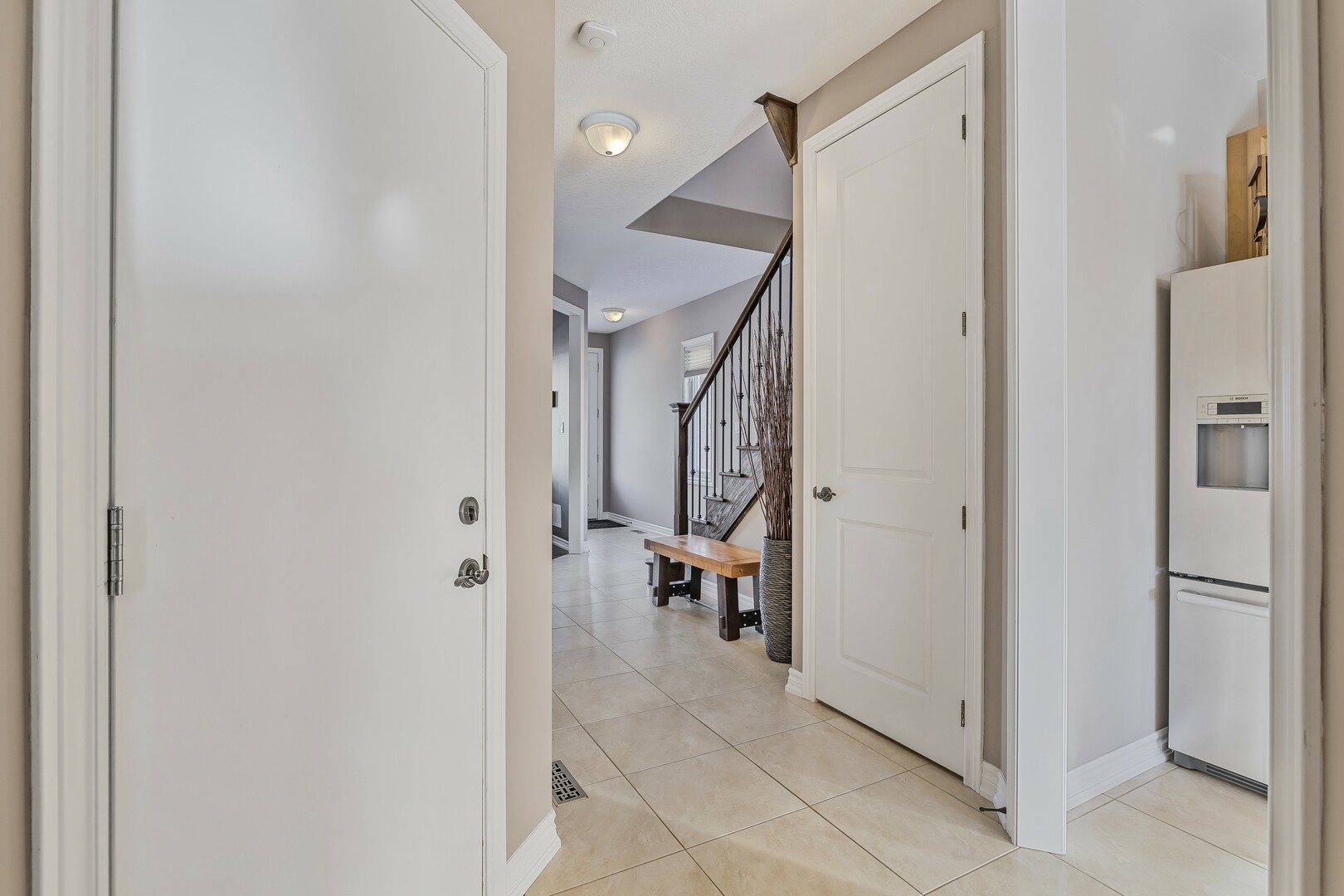 Welcome to this beautifully maintained Dorchester II home by Previn Court! This four-bedroom end unit townhouse is exceptionally clean, well cared for, and shows beautifully. The main floor features 9-foot ceilings, hardwood flooring, and custom blinds throughout. The kitchen boasts Bosch appliances, granite countertops, and breakfast bar seating, with a walkout from the dining area to the backyard deck and patio. The living room showcases a custom gas fireplace, while the front den/office provides a versatile space. A powder room and garage access complete this level. Upstairs, the second floor includes four spacious bedrooms with carpet throughout. The principal bedroom offers a walk-in closet and an en suite with a separate glass-enclosed shower and a luxurious soaker tub. The bathrooms feature upgraded granite countertops, and a laundry room is conveniently located on this floor. The unfinished basement features tall ceilings, above-grade windows, and a bathroom rough-in, offering great potential. The exterior is a backyard retreat, featuring a fully fenced yard with two custom pergola privacy walls, a garden shed, and a large, pool-sized premium lot (6000+ sq. ft. / ~560 m). A ~200 sq. ft. deck leads down to a ~500 sq. ft. patio, perfect for relaxing and entertaining. A covered front porch and all brick exterior adds charm and curb appeal. This ~2154 sq. ft. home (as per builders plans) offers a perfect blend of style, space, and comfort. Must be seen!