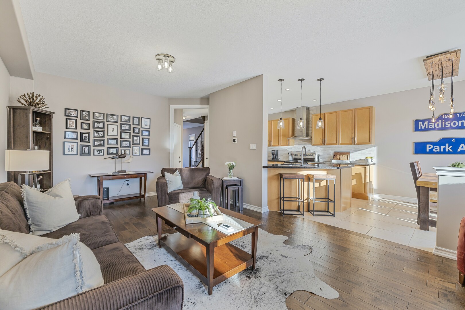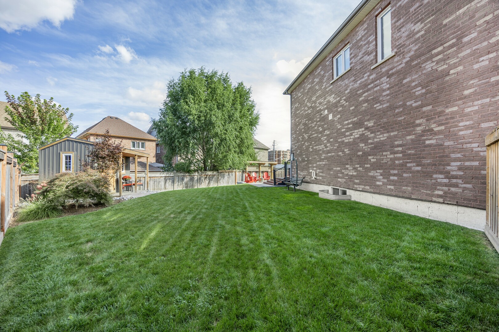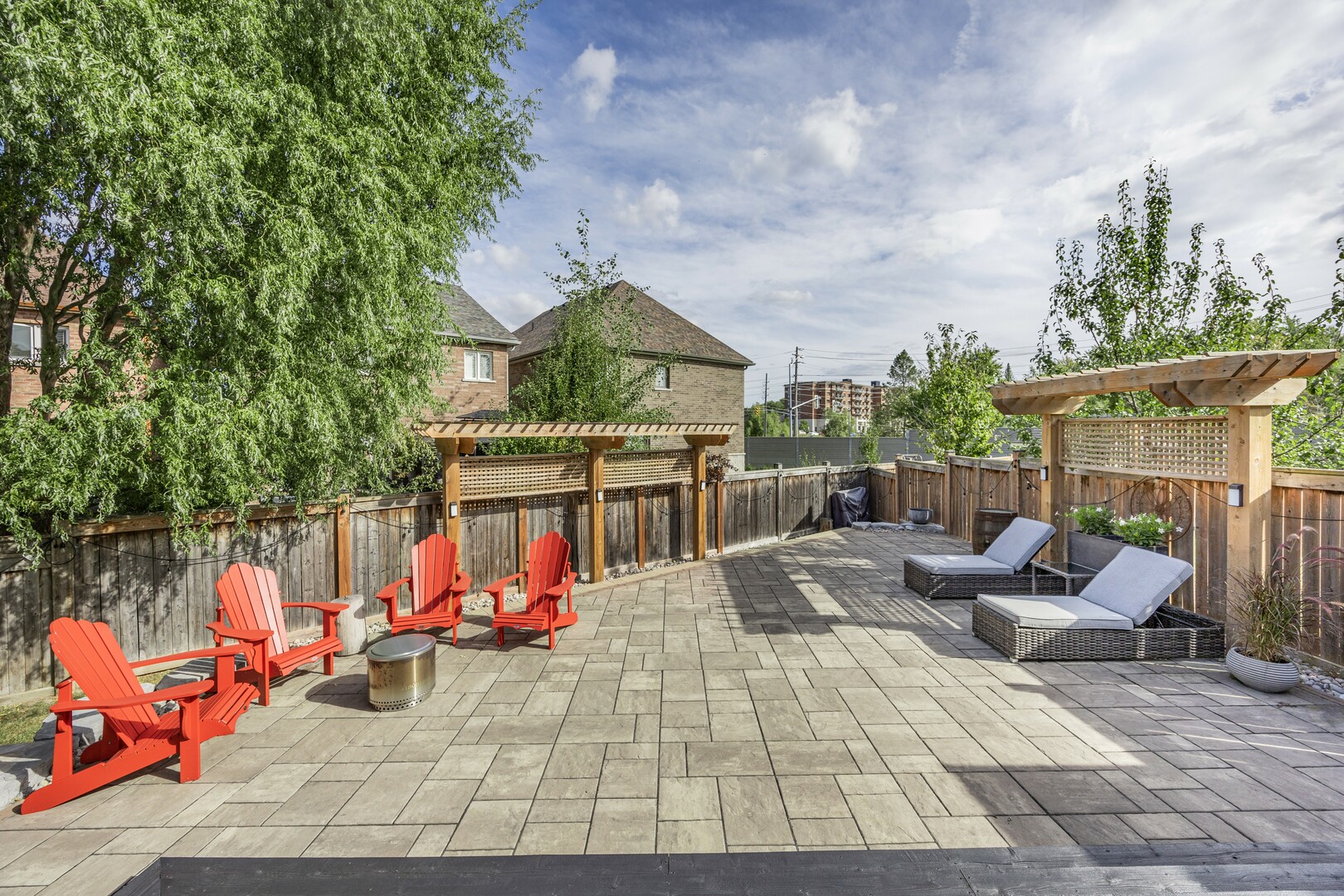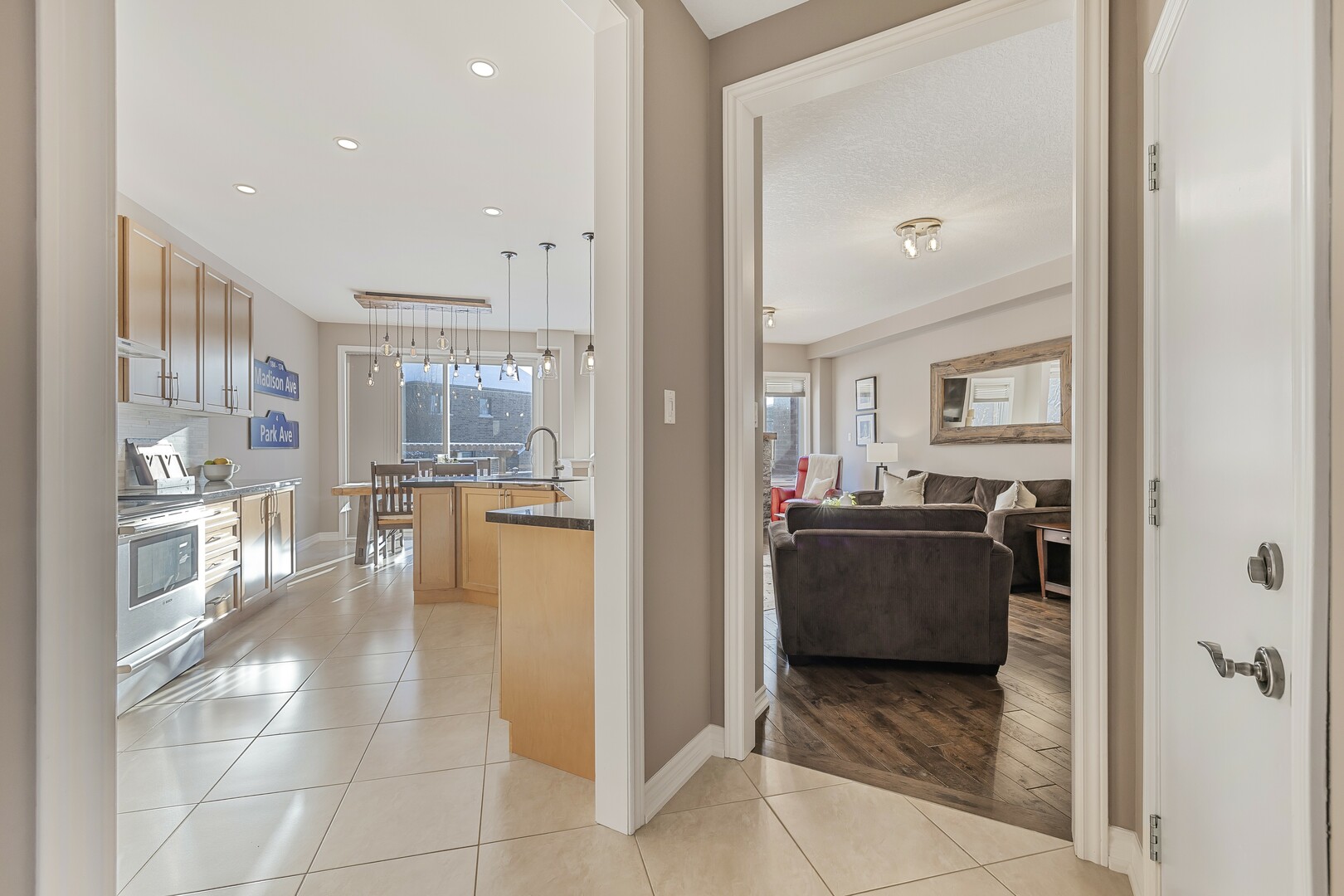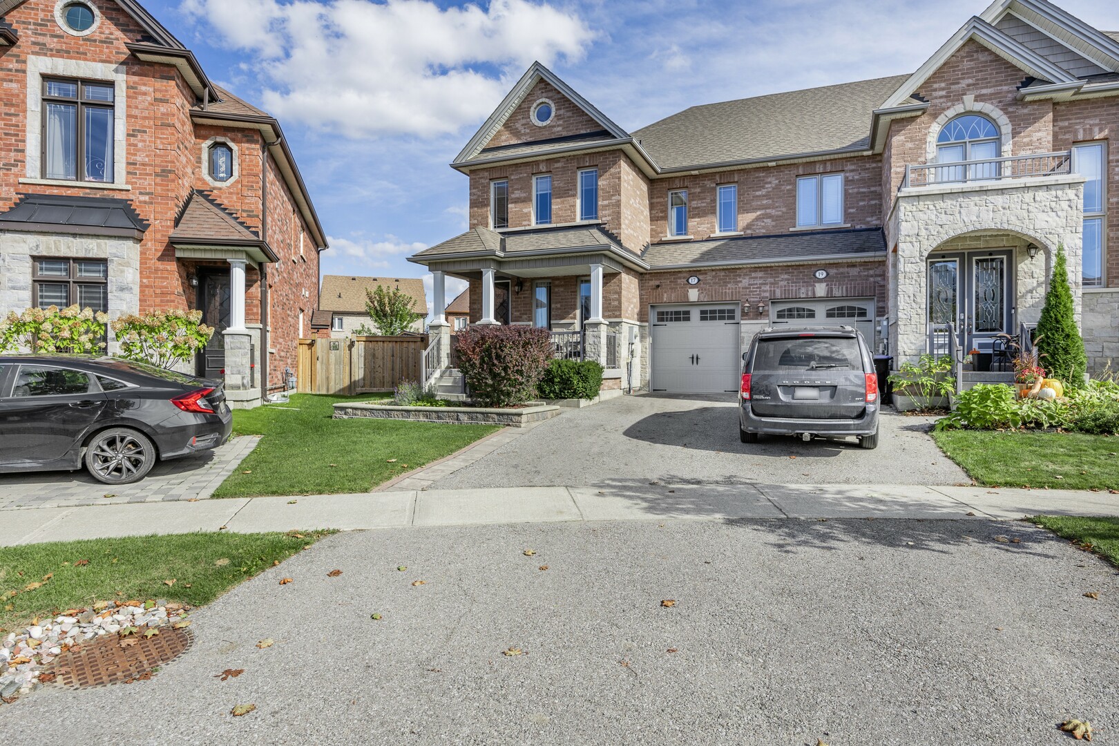 Welcome to this beautifully maintained Dorchester II home by Previn Court! This four-bedroom end unit townhouse is exceptionally clean, well cared for, and shows beautifully. The main floor features 9-foot ceilings, hardwood flooring, and custom blinds throughout. The kitchen boasts Bosch appliances, granite countertops, and breakfast bar seating, with a walkout from the dining area to the backyard deck and patio. The living room showcases a custom gas fireplace, while the front den/office provides a versatile space. A powder room and garage access complete this level. Upstairs, the second floor includes four spacious bedrooms with carpet throughout. The principal bedroom offers a walk-in closet and an en suite with a separate glass-enclosed shower and a luxurious soaker tub. The bathrooms feature upgraded granite countertops, and a laundry room is conveniently located on this floor. The unfinished basement features tall ceilings, above-grade windows, and a bathroom rough-in, offering great potential. The exterior is a backyard retreat, featuring a fully fenced yard with two custom pergola privacy walls, a garden shed, and a large, pool-sized premium lot (6000+ sq. ft. / ~560 m). A ~200 sq. ft. deck leads down to a ~500 sq. ft. patio, perfect for relaxing and entertaining. A covered front porch and all brick exterior adds charm and curb appeal. This ~2154 sq. ft. home (as per builders plans) offers a perfect blend of style, space, and comfort. Must be seen!