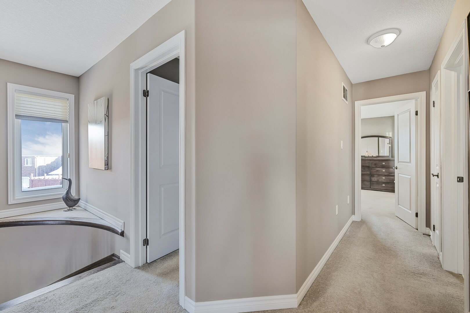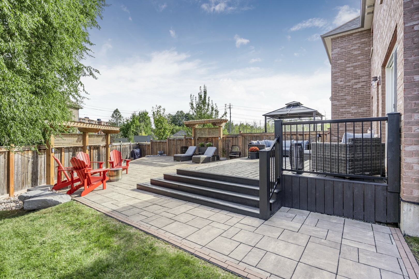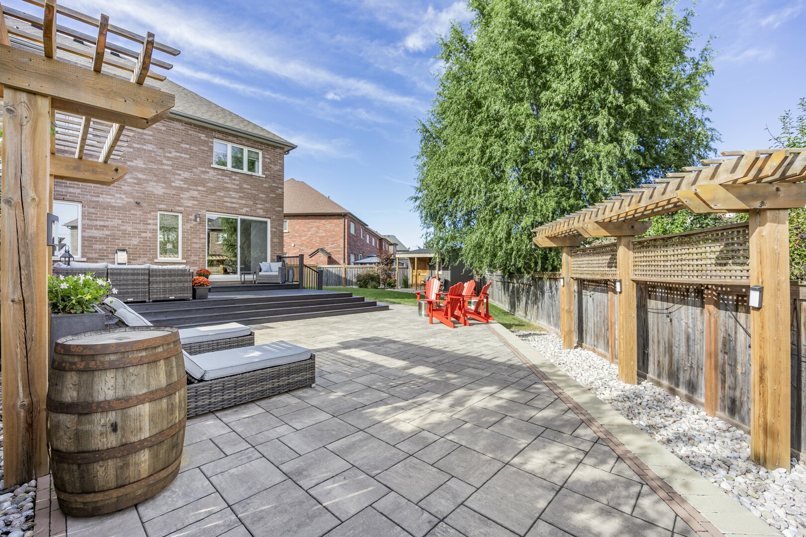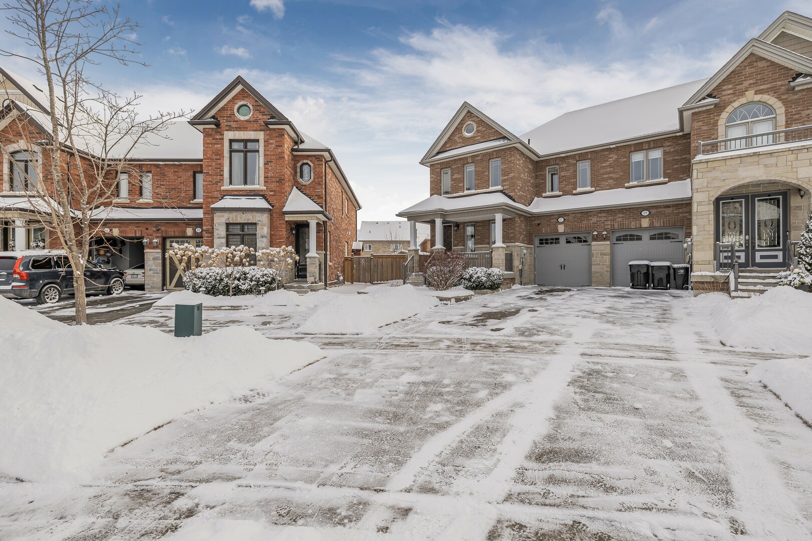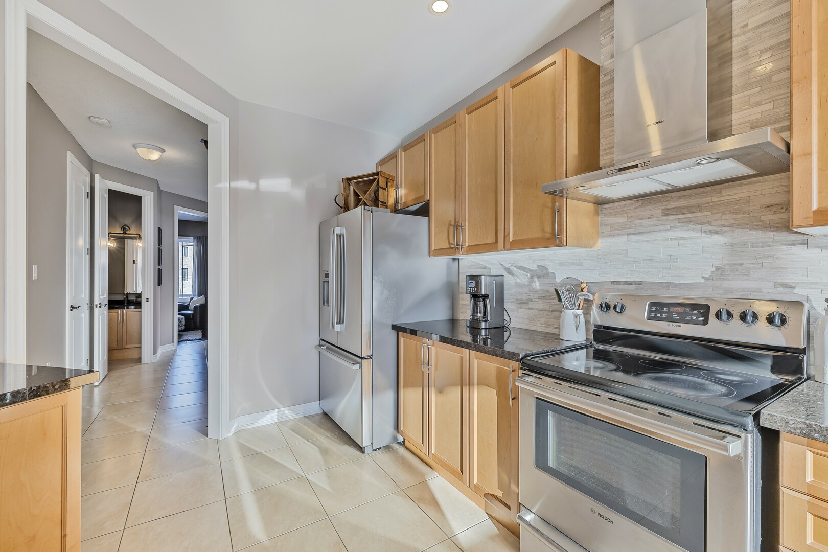 Welcome to this beautifully maintained Dorchester II home by Previn Court! This four-bedroom end unit townhouse is exceptionally clean, well cared for, and shows beautifully. The main floor features 9-foot ceilings, hardwood flooring, and custom blinds throughout. The kitchen boasts Bosch appliances, granite countertops, and breakfast bar seating, with a walkout from the dining area to the backyard deck and patio. The living room showcases a custom gas fireplace, while the front den/office provides a versatile space. A powder room and garage access complete this level. Upstairs, the second floor includes four spacious bedrooms with carpet throughout. The principal bedroom offers a walk-in closet and an en suite with a separate glass-enclosed shower and a luxurious soaker tub. The bathrooms feature upgraded granite countertops, and a laundry room is conveniently located on this floor. The unfinished basement features tall ceilings, above-grade windows, and a bathroom rough-in, offering great potential. The exterior is a backyard retreat, featuring a fully fenced yard with two custom pergola privacy walls, a garden shed, and a large, pool-sized premium lot (6000+ sq. ft. / ~560 m). A ~200 sq. ft. deck leads down to a ~500 sq. ft. patio, perfect for relaxing and entertaining. A covered front porch and all brick exterior adds charm and curb appeal. This ~2154 sq. ft. home (as per builders plans) offers a perfect blend of style, space, and comfort. Must be seen!