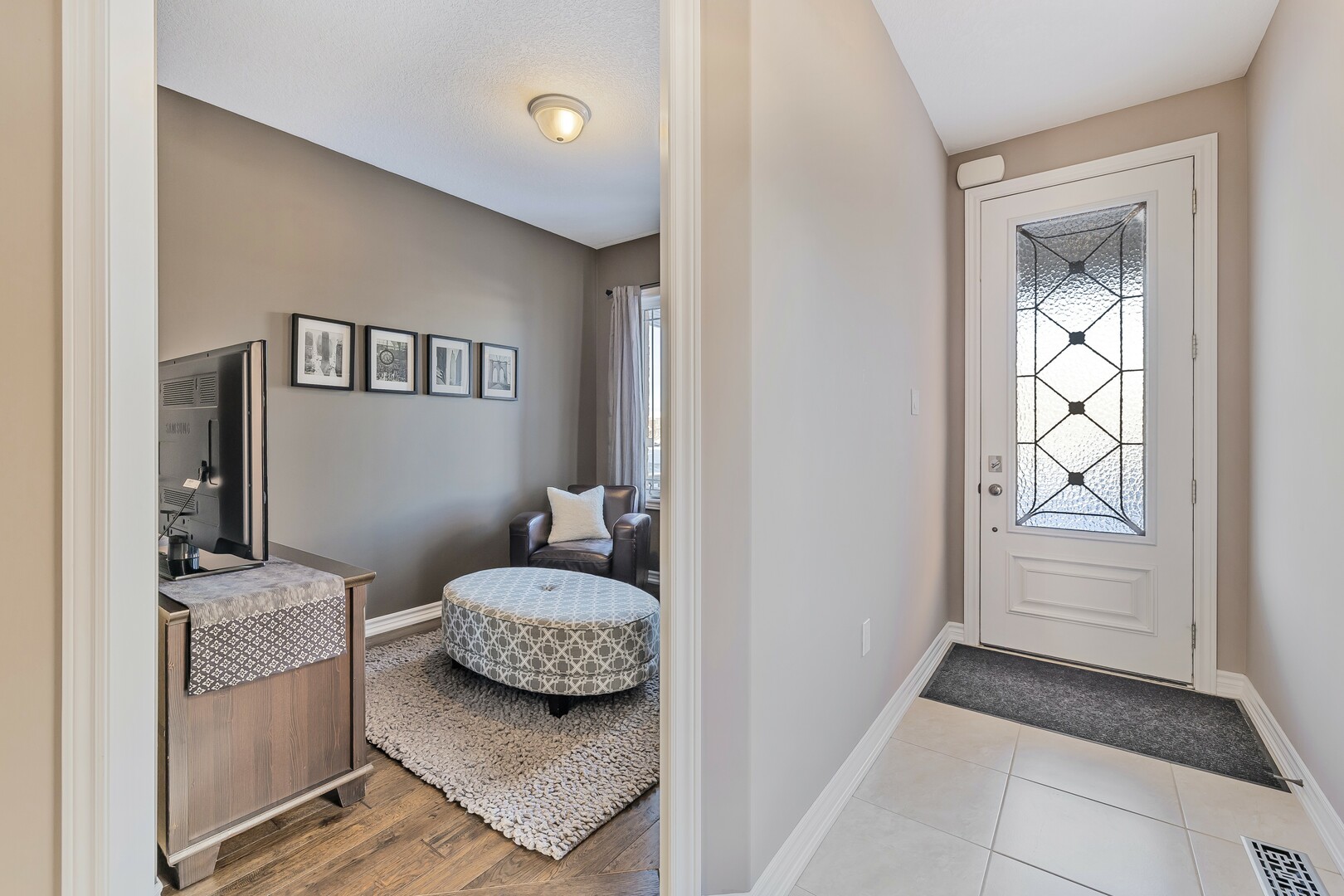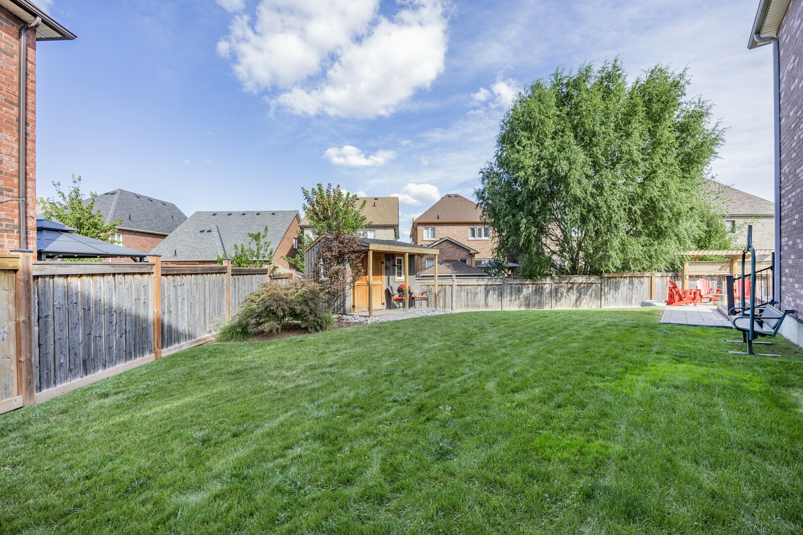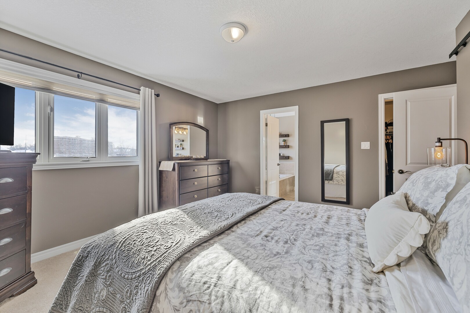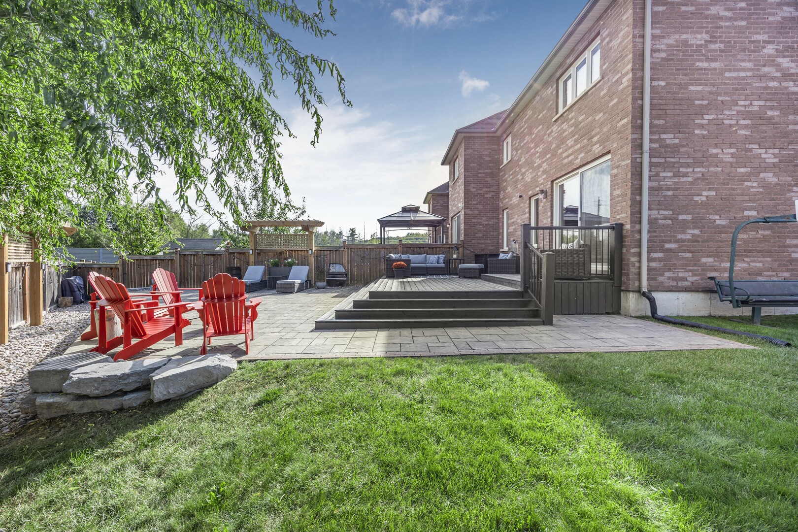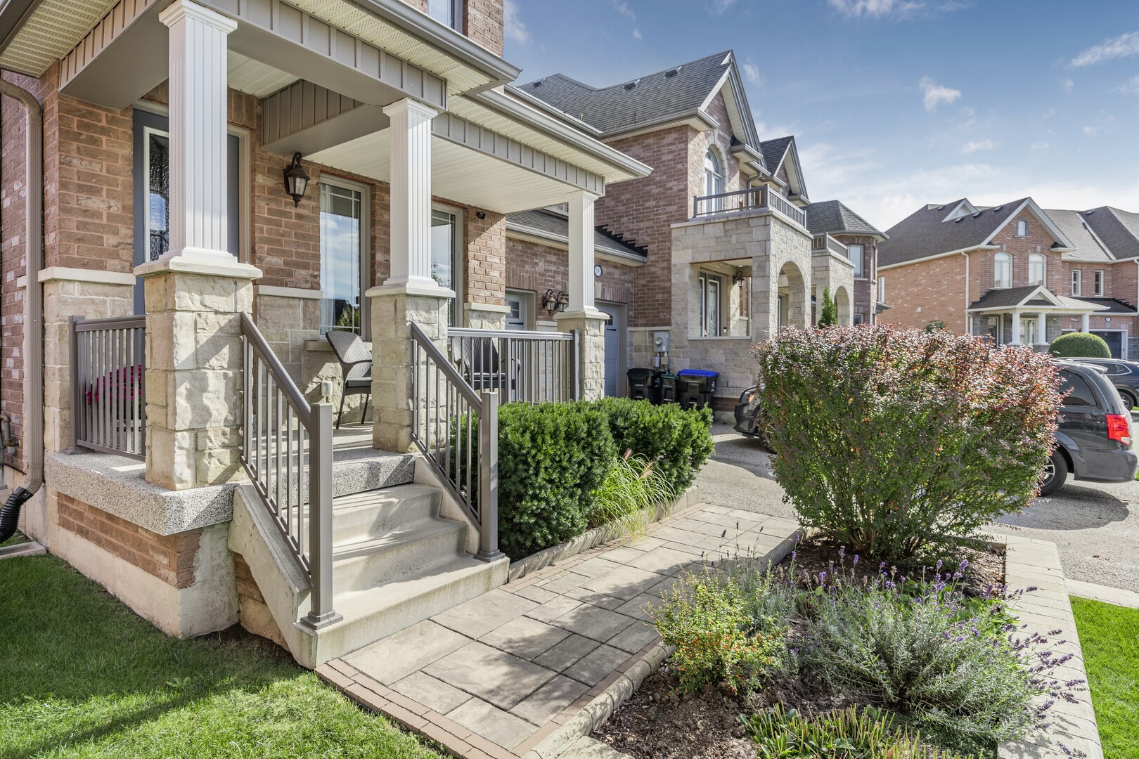Welcome to this beautifully maintained Dorchester II home by Previn Court! This four-bedroom end unit townhouse is exceptionally clean, well cared for, and shows beautifully. The main floor features 9-foot ceilings, hardwood flooring, and custom blinds throughout. The kitchen boasts Bosch appliances, granite countertops, and breakfast bar seating, with a walkout from the dining area to the backyard deck and patio. The living room showcases a custom gas fireplace, while the front den/office provides a versatile space. A powder room and garage access complete this level. Upstairs, the second floor includes four spacious bedrooms with carpet throughout. The principal bedroom offers a walk-in closet and an en suite with a separate glass-enclosed shower and a luxurious soaker tub. The bathrooms feature upgraded granite countertops, and a laundry room is conveniently located on this floor. The unfinished basement features tall ceilings, above-grade windows, and a bathroom rough-in, offering great potential. The exterior is a backyard retreat, featuring a fully fenced yard with two custom pergola privacy walls, a garden shed, and a large, pool-sized premium lot (6000+ sq. ft. / ~560 m). A ~200 sq. ft. deck leads down to a ~500 sq. ft. patio, perfect for relaxing and entertaining. A covered front porch and all brick exterior adds charm and curb appeal. This ~2154 sq. ft. home (as per builders plans) offers a perfect blend of style, space, and comfort. Must be seen!