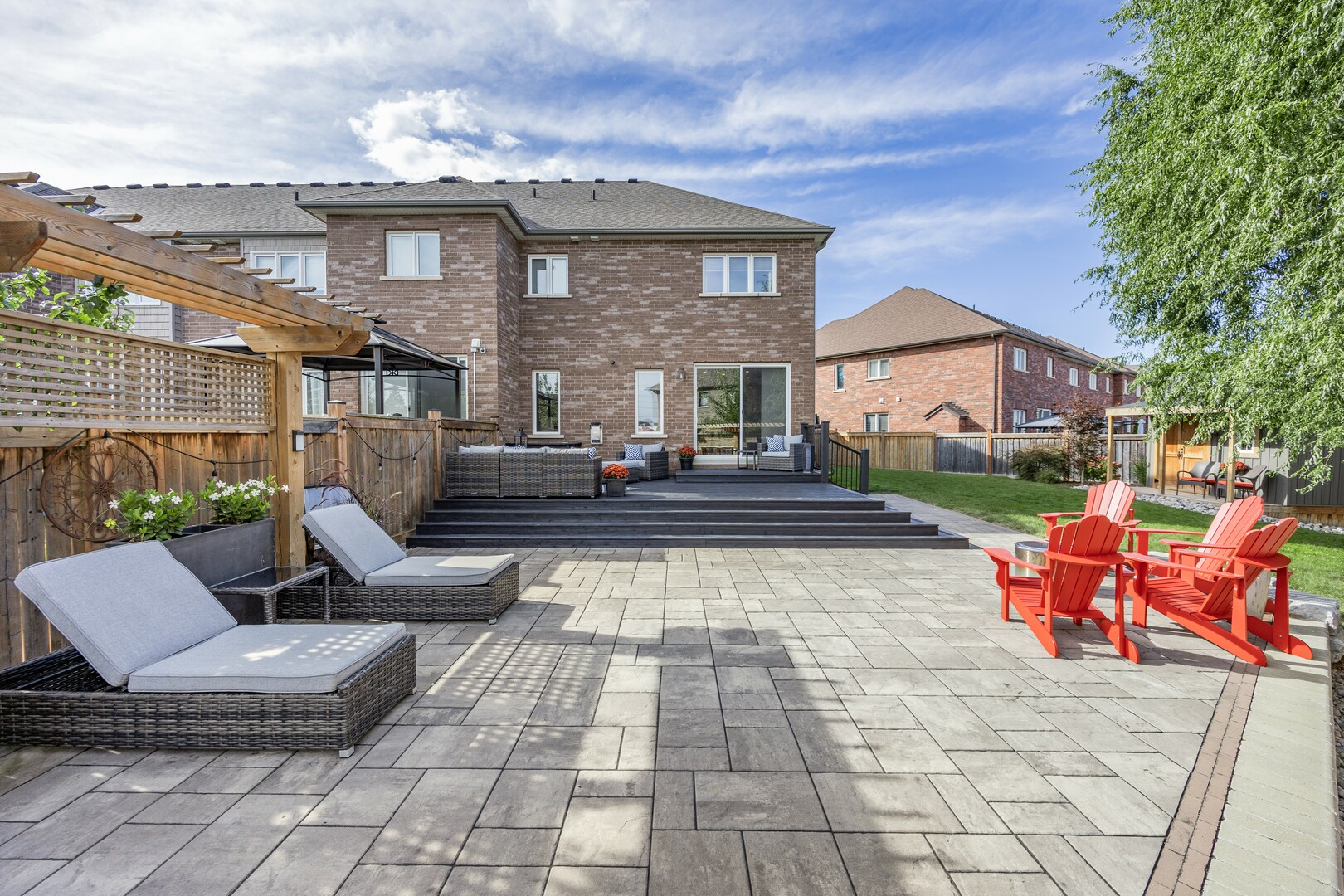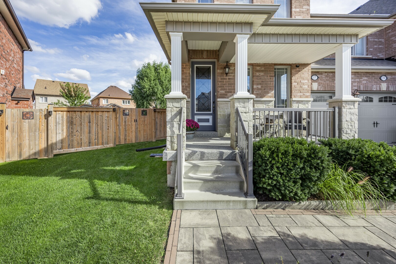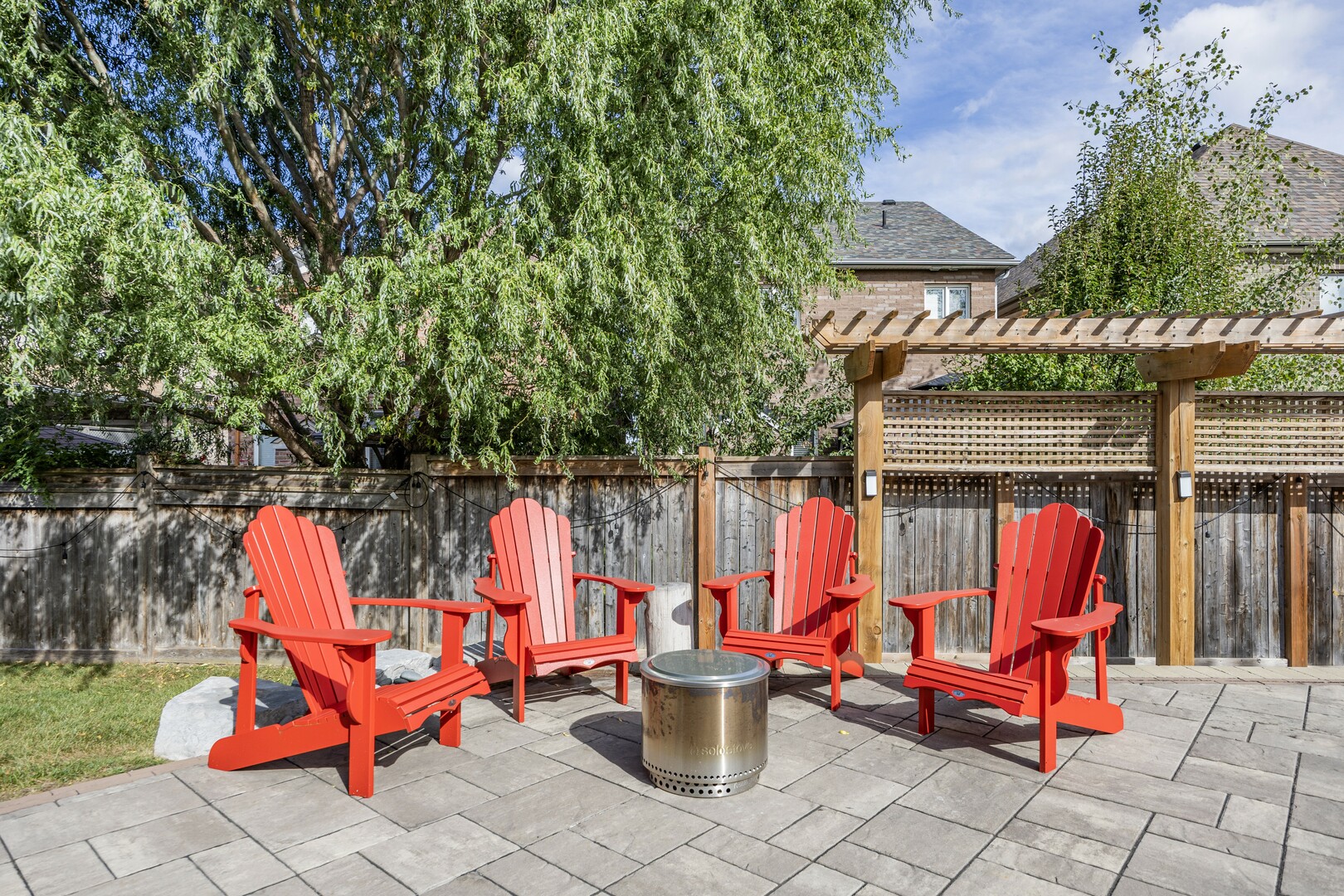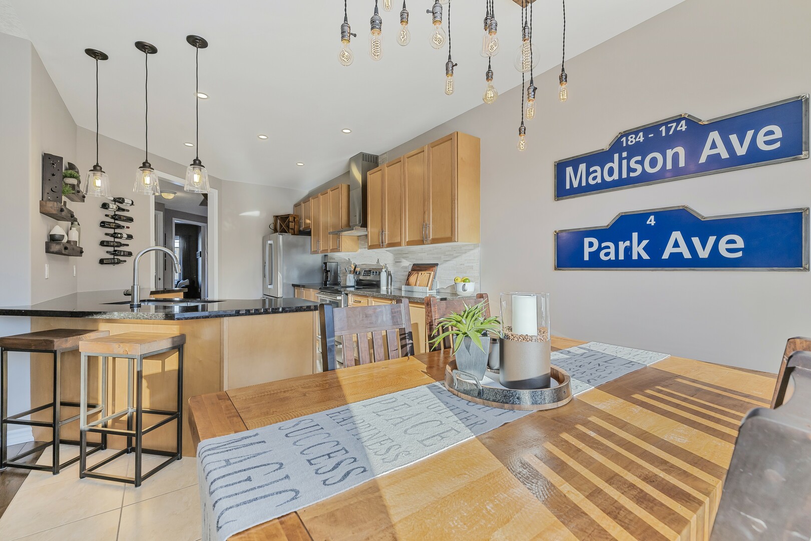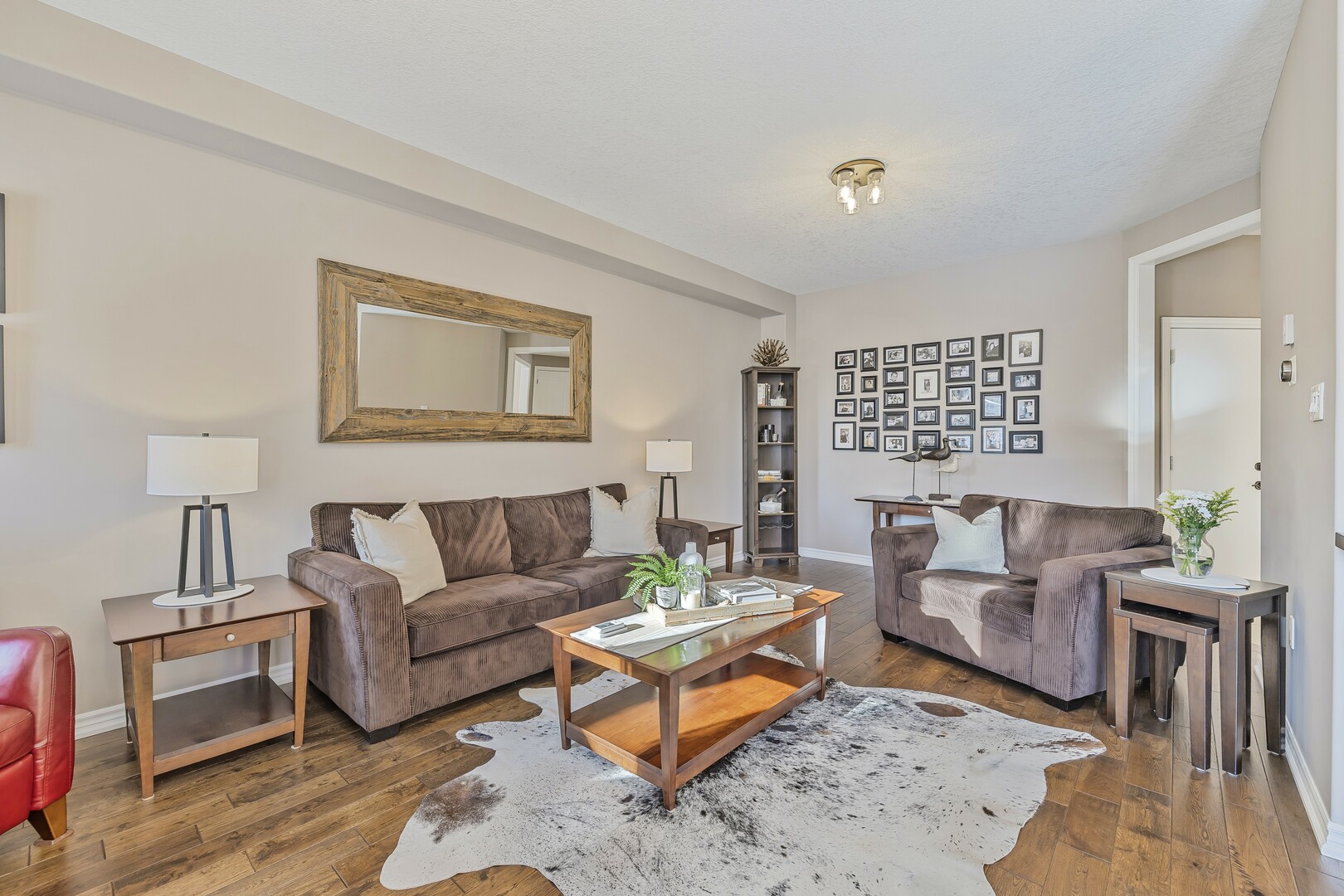 Welcome to this beautifully maintained Dorchester II home by Previn Court! This four-bedroom end unit townhouse is exceptionally clean, well cared for, and shows beautifully. The main floor features 9-foot ceilings, hardwood flooring, and custom blinds throughout. The kitchen boasts Bosch appliances, granite countertops, and breakfast bar seating, with a walkout from the dining area to the backyard deck and patio. The living room showcases a custom gas fireplace, while the front den/office provides a versatile space. A powder room and garage access complete this level. Upstairs, the second floor includes four spacious bedrooms with carpet throughout. The principal bedroom offers a walk-in closet and an en suite with a separate glass-enclosed shower and a luxurious soaker tub. The bathrooms feature upgraded granite countertops, and a laundry room is conveniently located on this floor. The unfinished basement features tall ceilings, above-grade windows, and a bathroom rough-in, offering great potential. The exterior is a backyard retreat, featuring a fully fenced yard with two custom pergola privacy walls, a garden shed, and a large, pool-sized premium lot (6000+ sq. ft. / ~560 m). A ~200 sq. ft. deck leads down to a ~500 sq. ft. patio, perfect for relaxing and entertaining. A covered front porch and all brick exterior adds charm and curb appeal. This ~2154 sq. ft. home (as per builders plans) offers a perfect blend of style, space, and comfort. Must be seen!