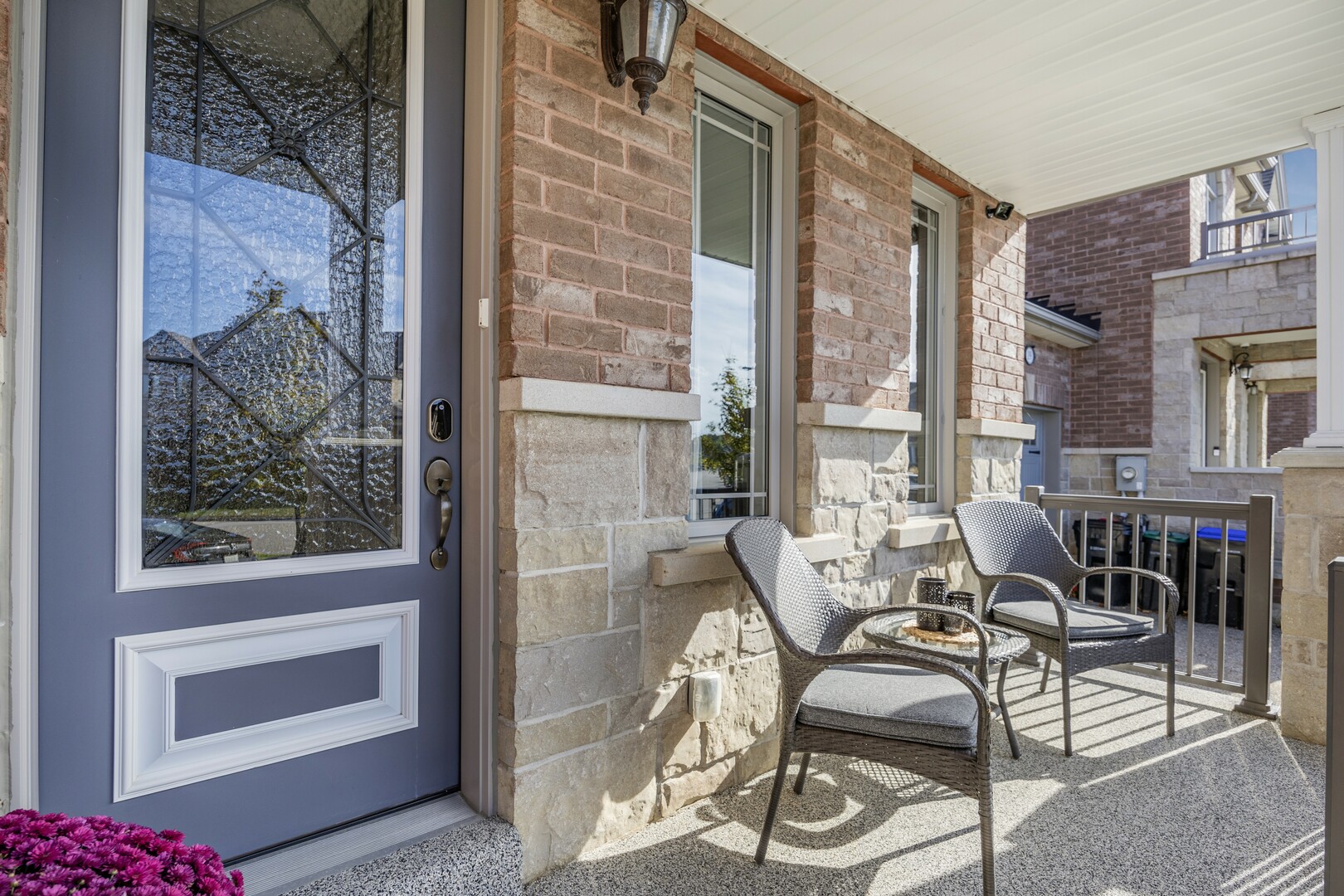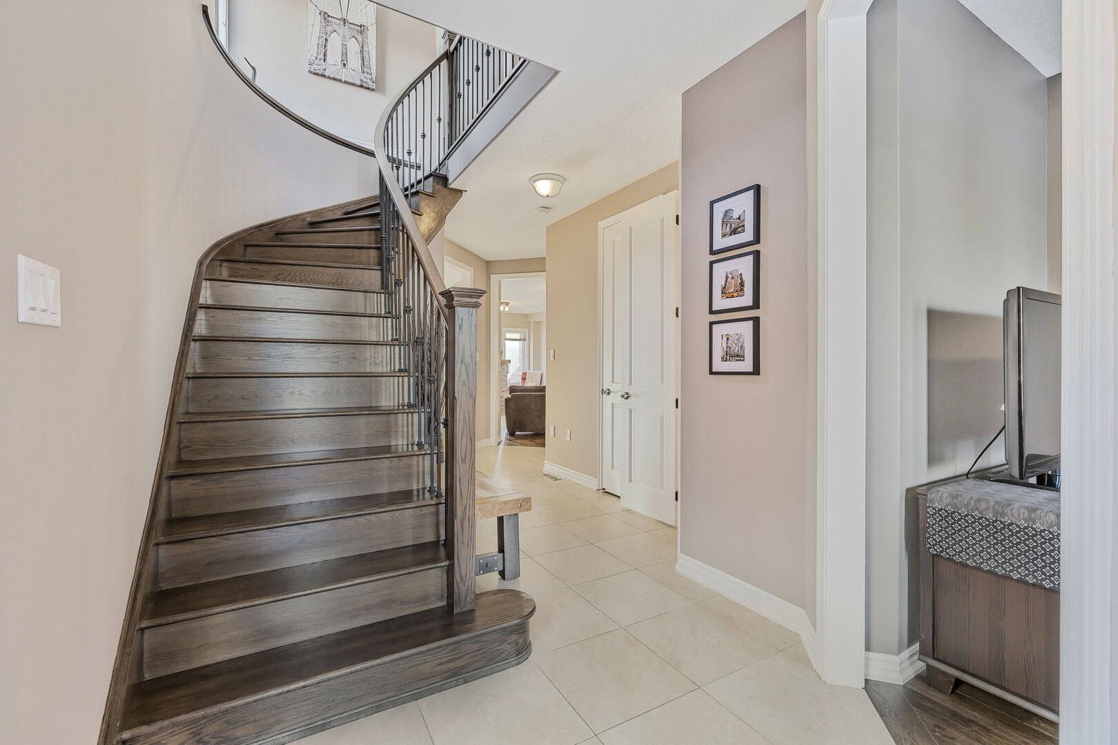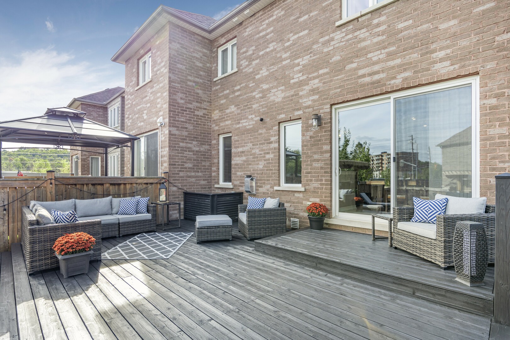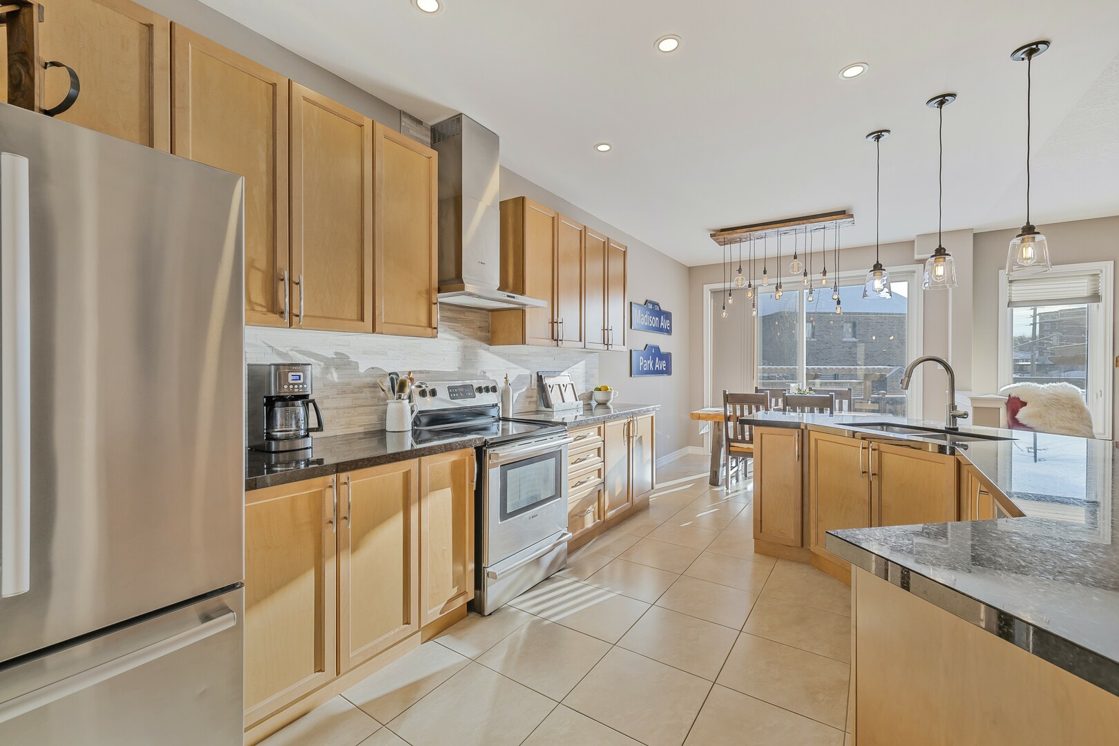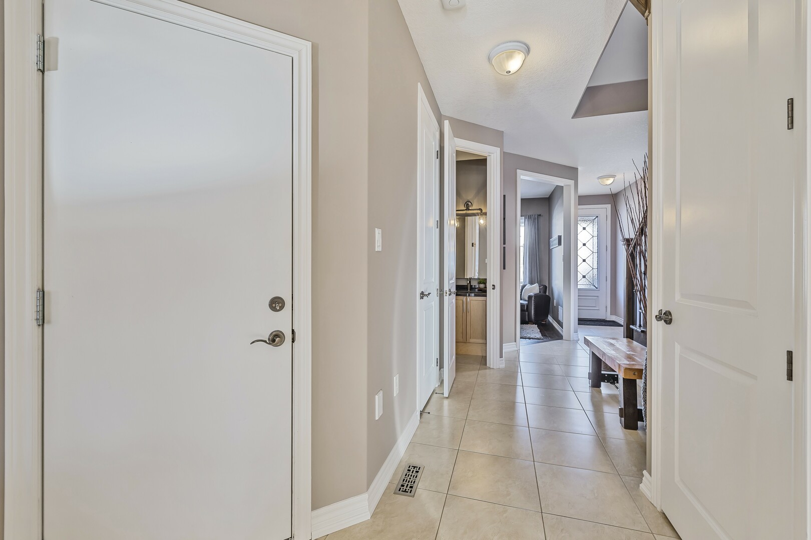 Welcome to this beautifully maintained Dorchester II home by Previn Court! This four-bedroom end unit townhouse is exceptionally clean, well cared for, and shows beautifully. The main floor features 9-foot ceilings, hardwood flooring, and custom blinds throughout. The kitchen boasts Bosch appliances, granite countertops, and breakfast bar seating, with a walkout from the dining area to the backyard deck and patio. The living room showcases a custom gas fireplace, while the front den/office provides a versatile space. A powder room and garage access complete this level. Upstairs, the second floor includes four spacious bedrooms with carpet throughout. The principal bedroom offers a walk-in closet and an en suite with a separate glass-enclosed shower and a luxurious soaker tub. The bathrooms feature upgraded granite countertops, and a laundry room is conveniently located on this floor. The unfinished basement features tall ceilings, above-grade windows, and a bathroom rough-in, offering great potential. The exterior is a backyard retreat, featuring a fully fenced yard with two custom pergola privacy walls, a garden shed, and a large, pool-sized premium lot (6000+ sq. ft. / ~560 m). A ~200 sq. ft. deck leads down to a ~500 sq. ft. patio, perfect for relaxing and entertaining. A covered front porch and all brick exterior adds charm and curb appeal. This ~2154 sq. ft. home (as per builders plans) offers a perfect blend of style, space, and comfort. Must be seen!