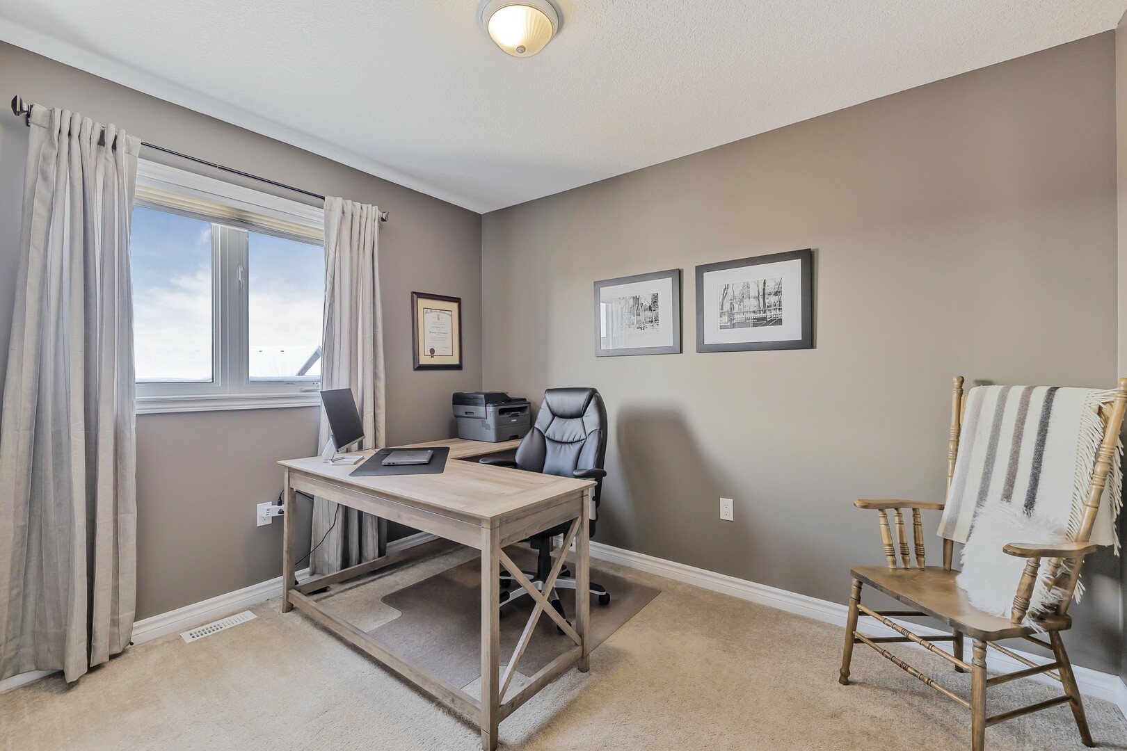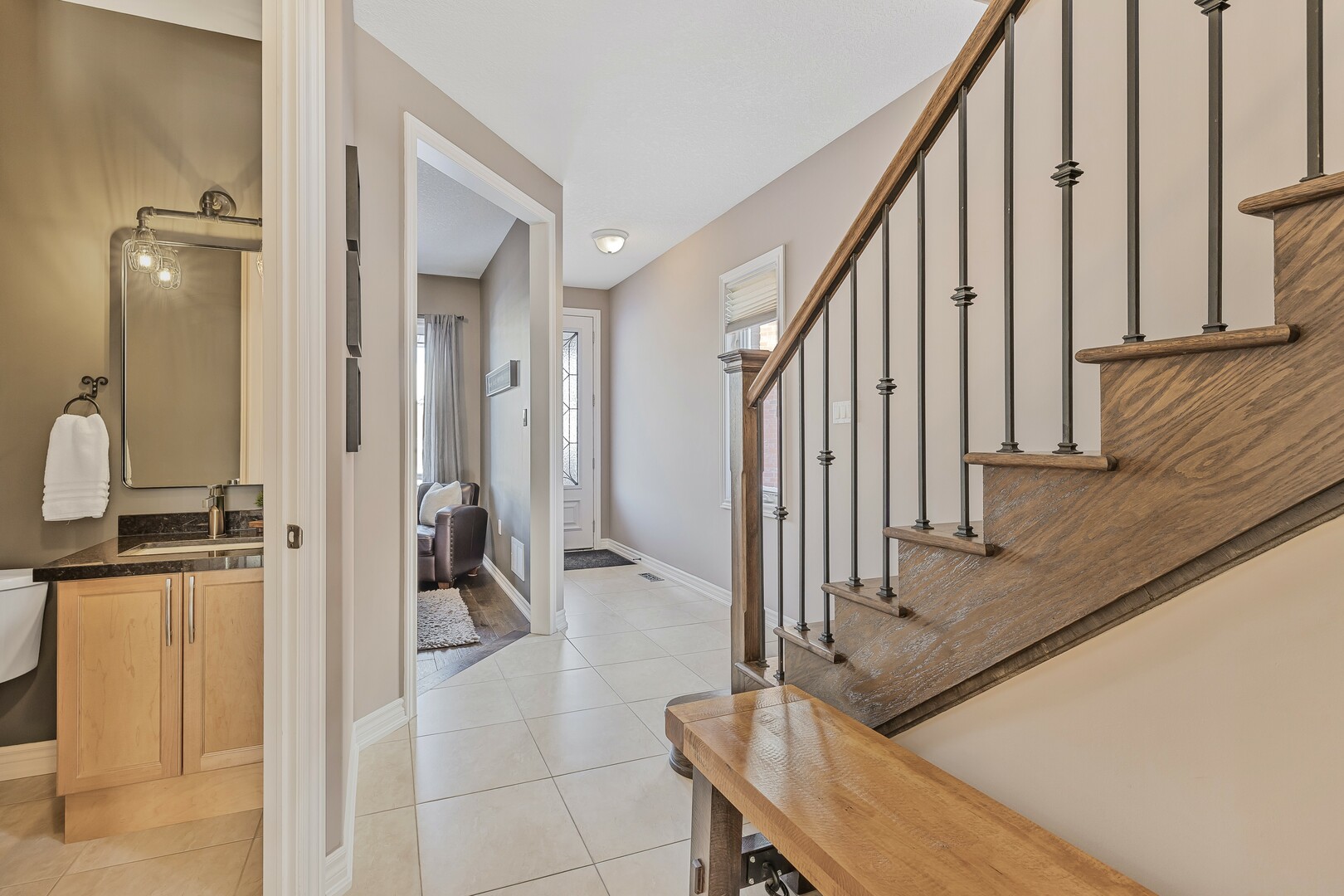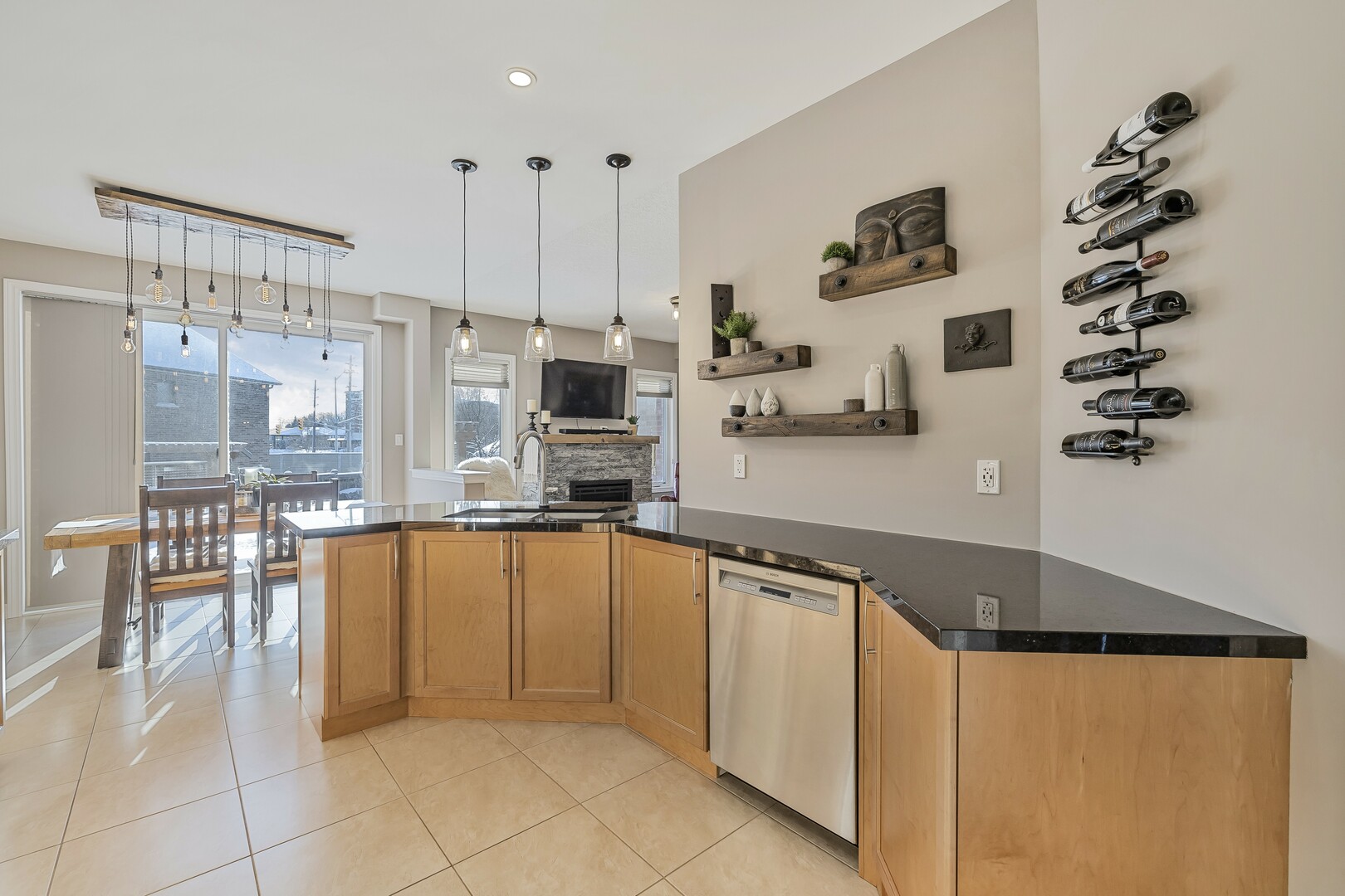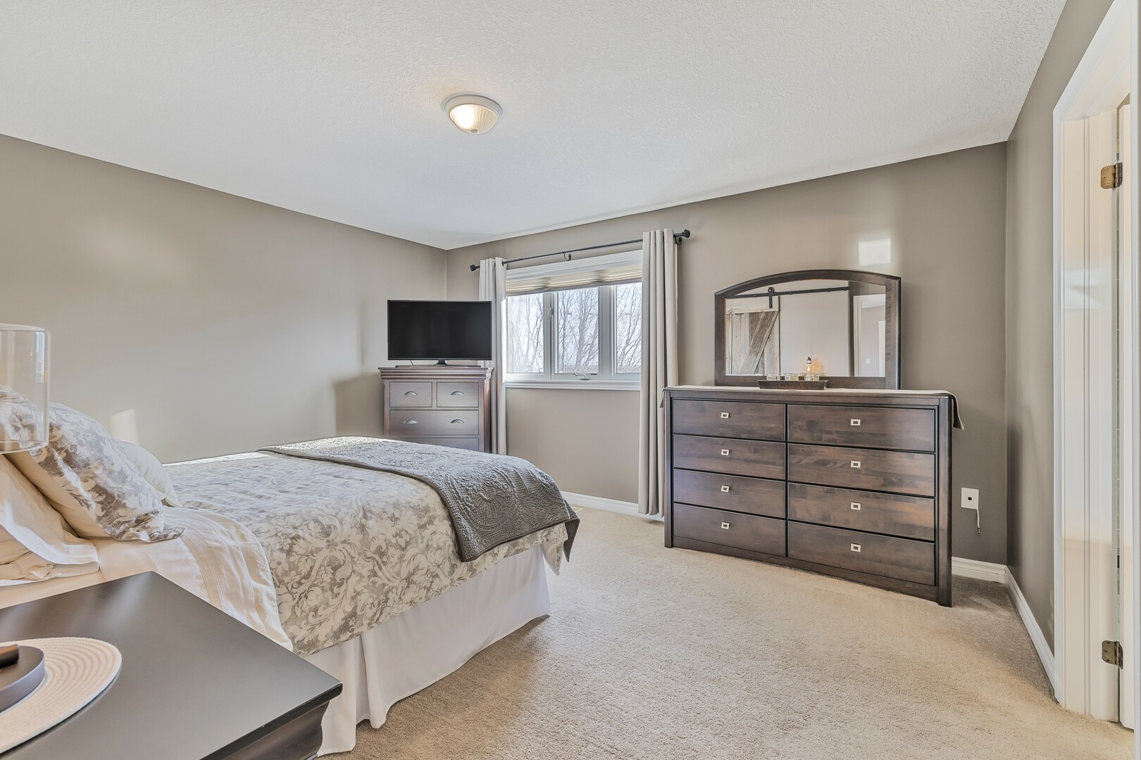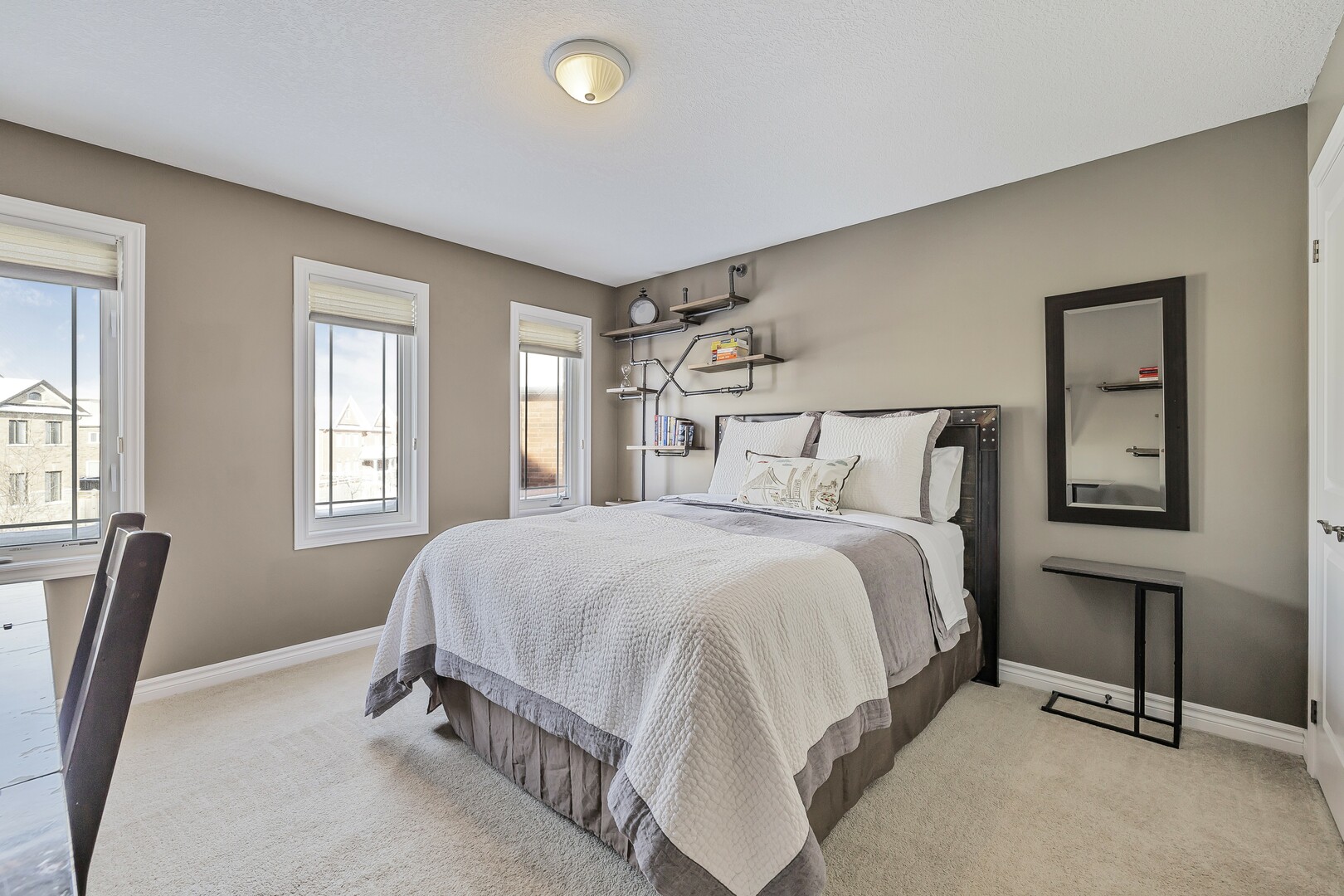 Welcome to this beautifully maintained Dorchester II home by Previn Court! This four-bedroom end unit townhouse is exceptionally clean, well cared for, and shows beautifully. The main floor features 9-foot ceilings, hardwood flooring, and custom blinds throughout. The kitchen boasts Bosch appliances, granite countertops, and breakfast bar seating, with a walkout from the dining area to the backyard deck and patio. The living room showcases a custom gas fireplace, while the front den/office provides a versatile space. A powder room and garage access complete this level. Upstairs, the second floor includes four spacious bedrooms with carpet throughout. The principal bedroom offers a walk-in closet and an en suite with a separate glass-enclosed shower and a luxurious soaker tub. The bathrooms feature upgraded granite countertops, and a laundry room is conveniently located on this floor. The unfinished basement features tall ceilings, above-grade windows, and a bathroom rough-in, offering great potential. The exterior is a backyard retreat, featuring a fully fenced yard with two custom pergola privacy walls, a garden shed, and a large, pool-sized premium lot (6000+ sq. ft. / ~560 m). A ~200 sq. ft. deck leads down to a ~500 sq. ft. patio, perfect for relaxing and entertaining. A covered front porch and all brick exterior adds charm and curb appeal. This ~2154 sq. ft. home (as per builders plans) offers a perfect blend of style, space, and comfort. Must be seen!