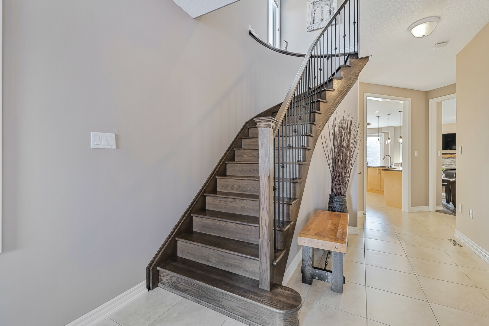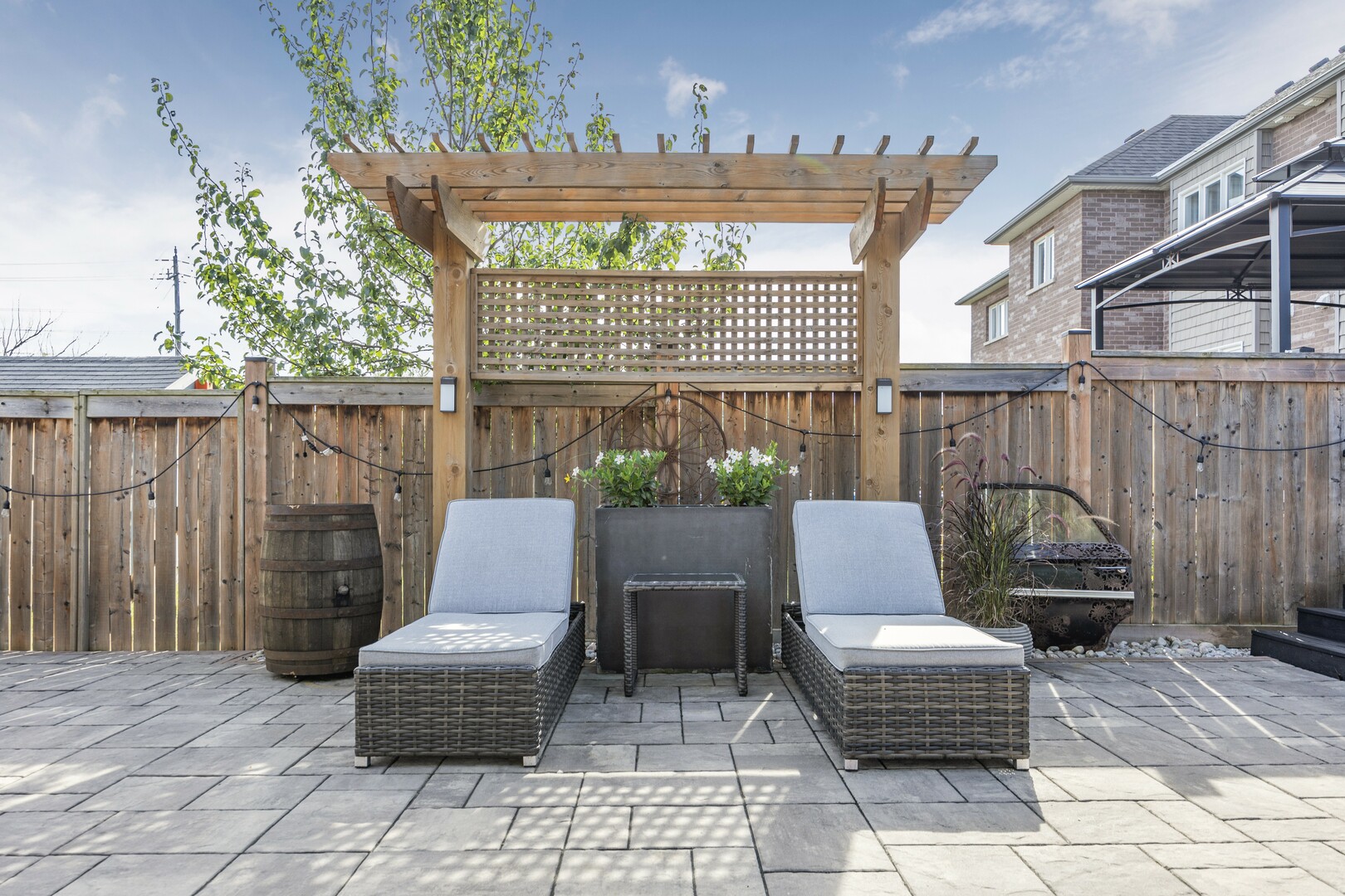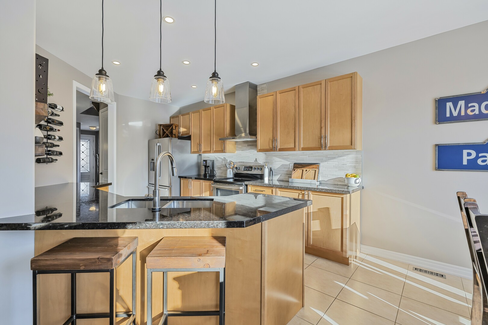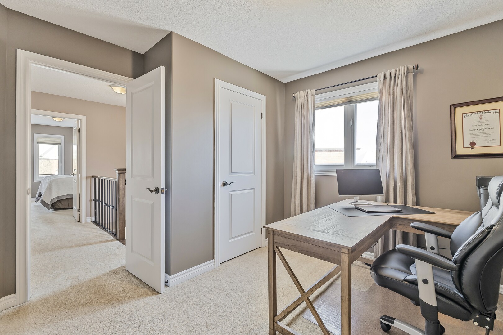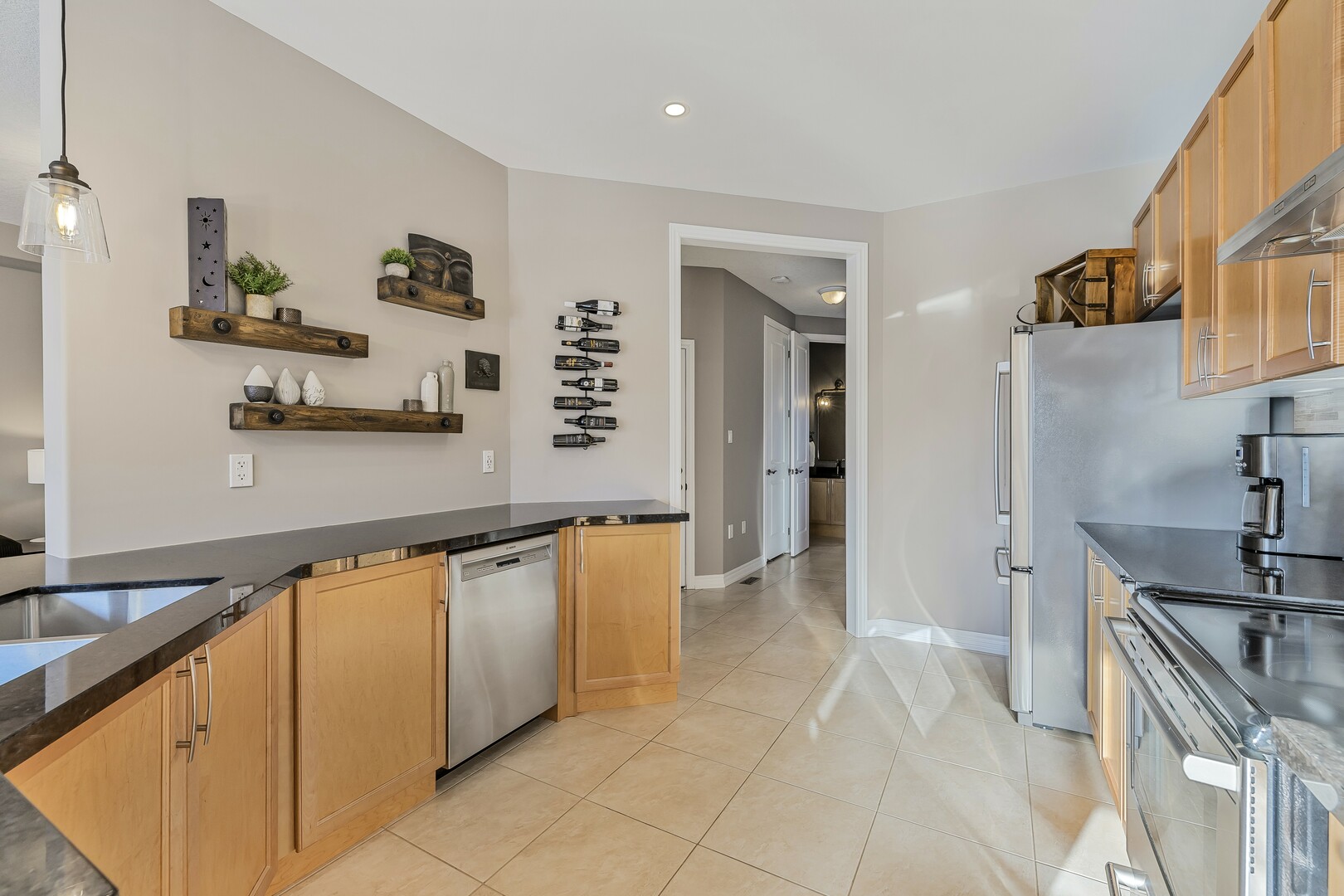 Welcome to this beautifully maintained Dorchester II home by Previn Court! This four-bedroom end unit townhouse is exceptionally clean, well cared for, and shows beautifully. The main floor features 9-foot ceilings, hardwood flooring, and custom blinds throughout. The kitchen boasts Bosch appliances, granite countertops, and breakfast bar seating, with a walkout from the dining area to the backyard deck and patio. The living room showcases a custom gas fireplace, while the front den/office provides a versatile space. A powder room and garage access complete this level. Upstairs, the second floor includes four spacious bedrooms with carpet throughout. The principal bedroom offers a walk-in closet and an en suite with a separate glass-enclosed shower and a luxurious soaker tub. The bathrooms feature upgraded granite countertops, and a laundry room is conveniently located on this floor. The unfinished basement features tall ceilings, above-grade windows, and a bathroom rough-in, offering great potential. The exterior is a backyard retreat, featuring a fully fenced yard with two custom pergola privacy walls, a garden shed, and a large, pool-sized premium lot (6000+ sq. ft. / ~560 m). A ~200 sq. ft. deck leads down to a ~500 sq. ft. patio, perfect for relaxing and entertaining. A covered front porch and all brick exterior adds charm and curb appeal. This ~2154 sq. ft. home (as per builders plans) offers a perfect blend of style, space, and comfort. Must be seen!