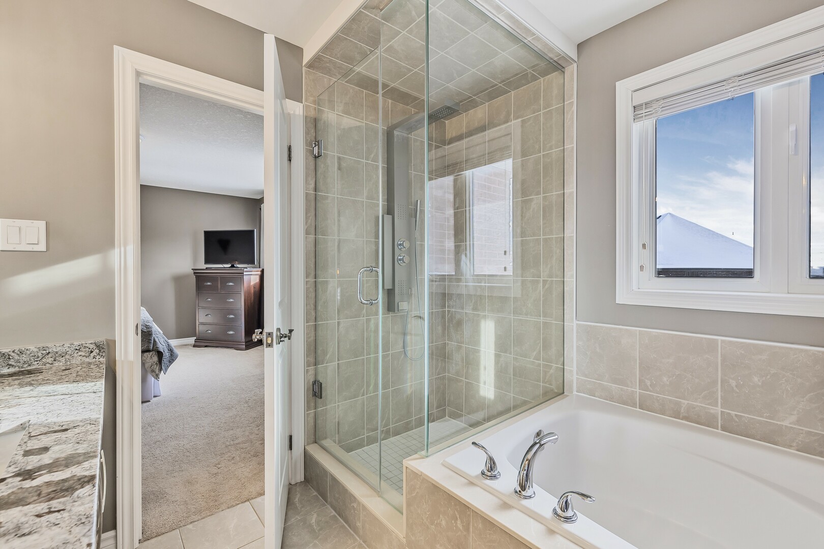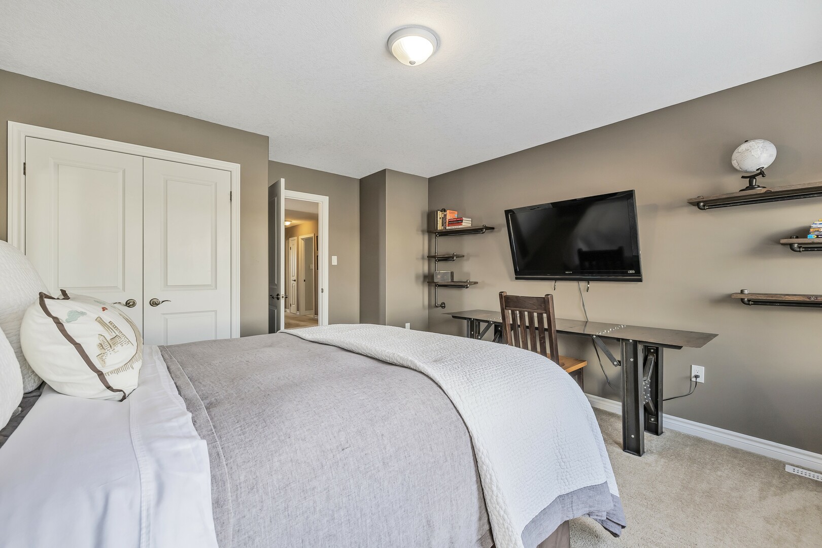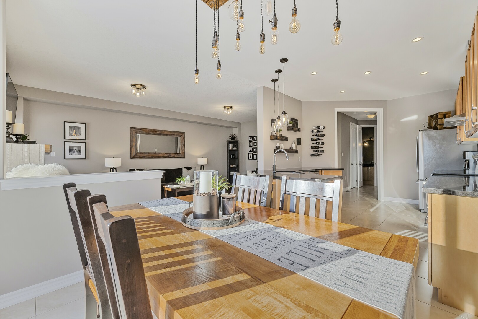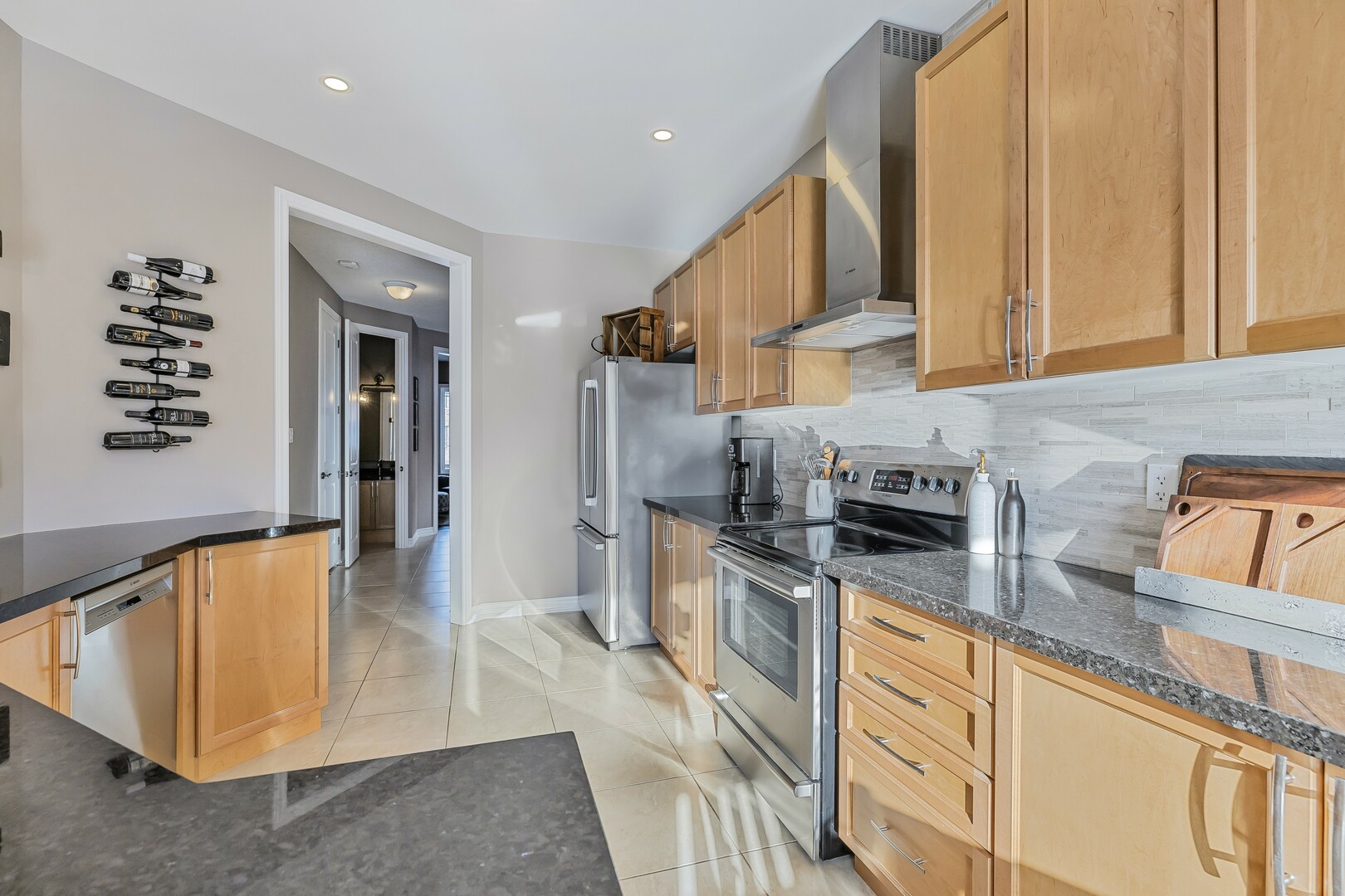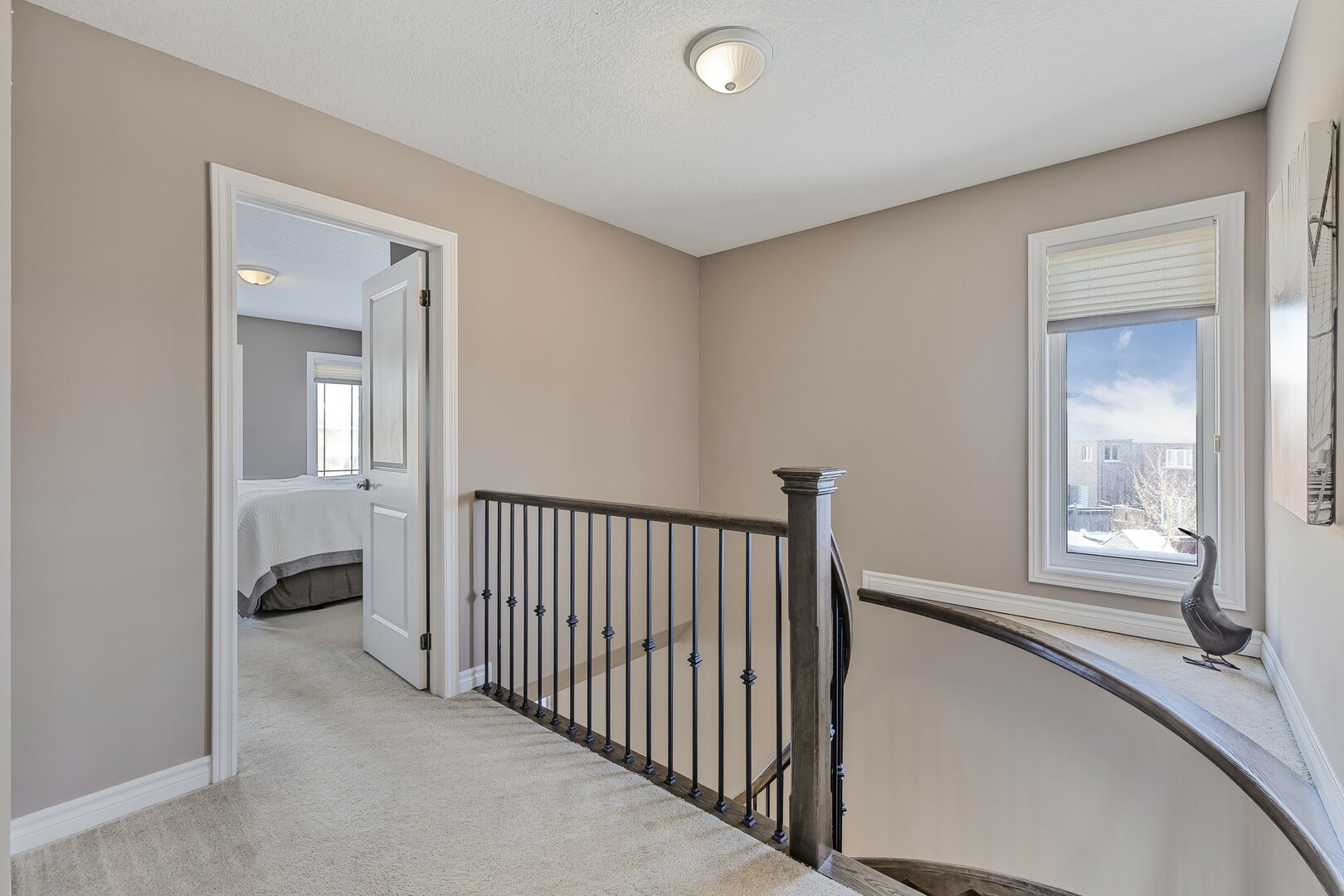 Welcome to this beautifully maintained Dorchester II home by Previn Court! This four-bedroom end unit townhouse is exceptionally clean, well cared for, and shows beautifully. The main floor features 9-foot ceilings, hardwood flooring, and custom blinds throughout. The kitchen boasts Bosch appliances, granite countertops, and breakfast bar seating, with a walkout from the dining area to the backyard deck and patio. The living room showcases a custom gas fireplace, while the front den/office provides a versatile space. A powder room and garage access complete this level. Upstairs, the second floor includes four spacious bedrooms with carpet throughout. The principal bedroom offers a walk-in closet and an en suite with a separate glass-enclosed shower and a luxurious soaker tub. The bathrooms feature upgraded granite countertops, and a laundry room is conveniently located on this floor. The unfinished basement features tall ceilings, above-grade windows, and a bathroom rough-in, offering great potential. The exterior is a backyard retreat, featuring a fully fenced yard with two custom pergola privacy walls, a garden shed, and a large, pool-sized premium lot (6000+ sq. ft. / ~560 m). A ~200 sq. ft. deck leads down to a ~500 sq. ft. patio, perfect for relaxing and entertaining. A covered front porch and all brick exterior adds charm and curb appeal. This ~2154 sq. ft. home (as per builders plans) offers a perfect blend of style, space, and comfort. Must be seen!