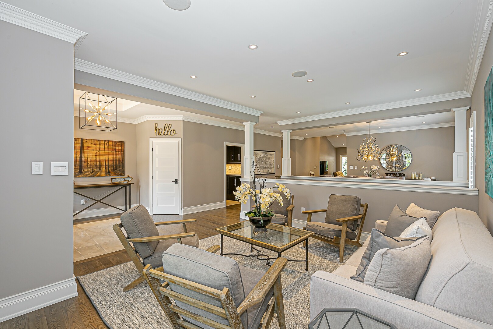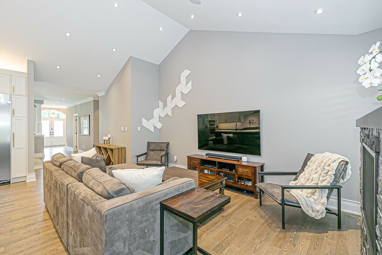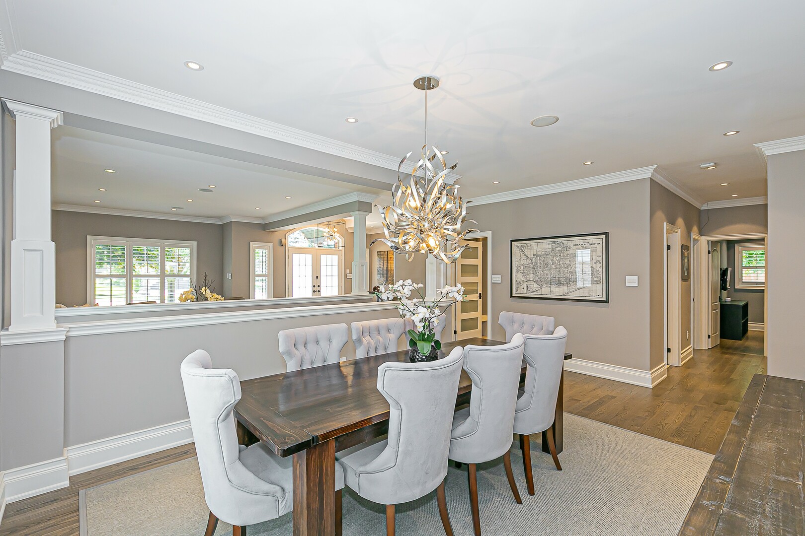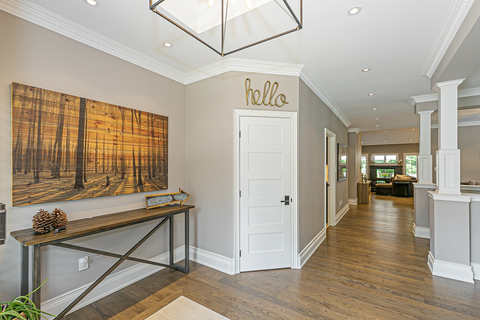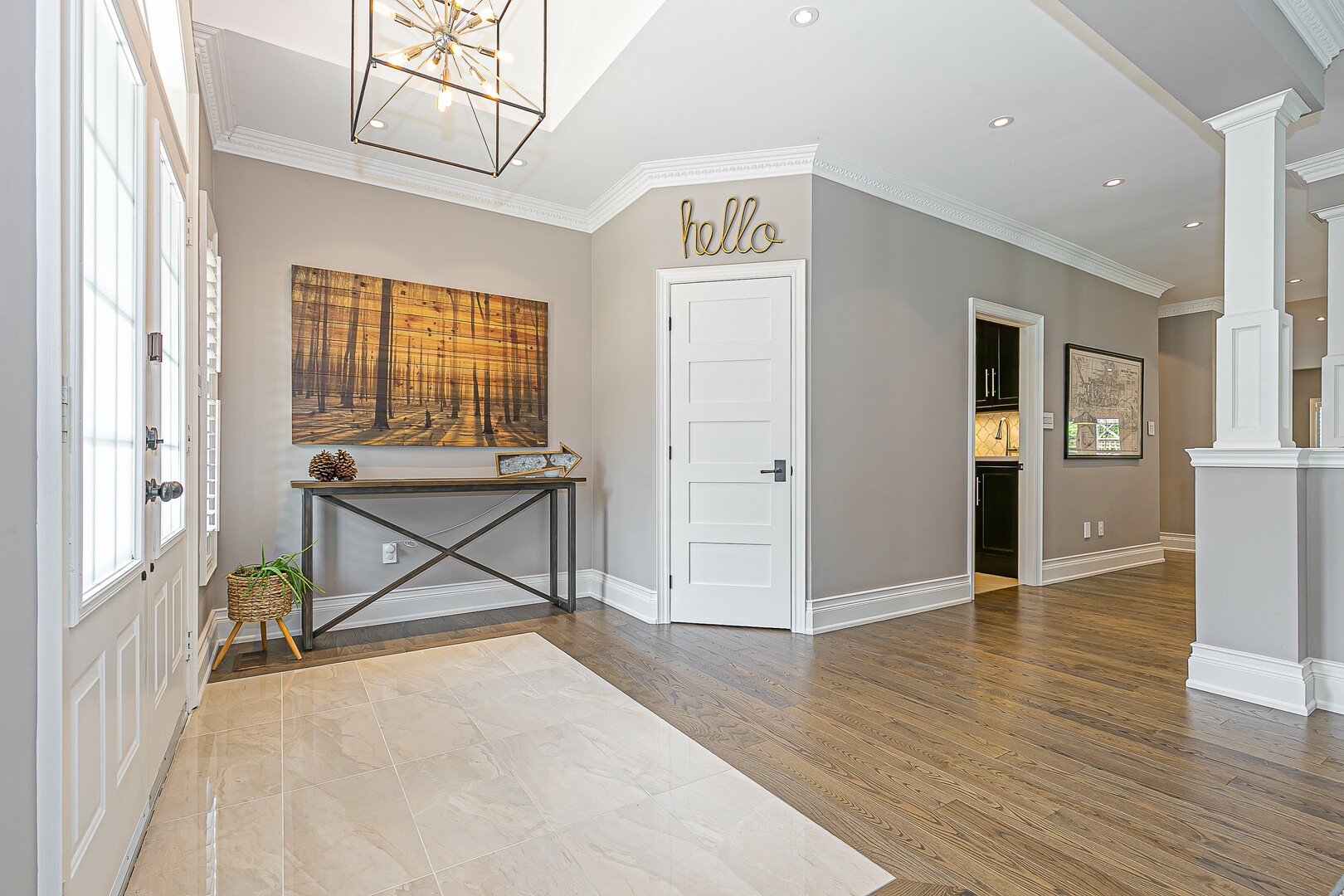 Step inside to a spacious, light-filled foyer with a double-door entry and a walk-in closet. The open-concept main floor is perfect for both everyday living and entertaining. The formal living room boasts elegant crown moulding and a large window overlooking the front yard. The dining room offers a warm and inviting space, perfect for gathering with family and friends. The chef-inspired kitchen is the heart of the home, complete with stainless steel appliances, pot filler, quartz countertops, custom cabinetry, a large island with breakfast bar, pendant lighting and a walkout to the back deck. The adjoining great room features a vaulted ceiling and a cozy double-sided fireplace that can be enjoyed from both indoors and out. A powder room is conveniently located off the main living area.