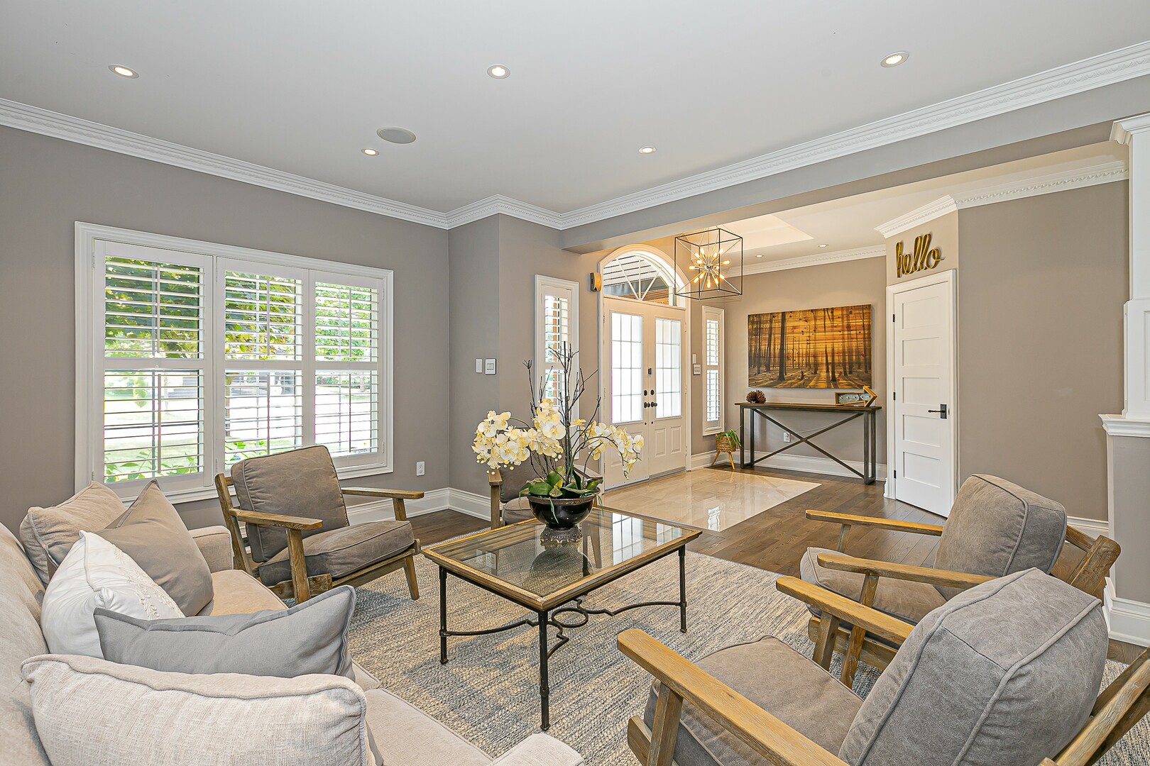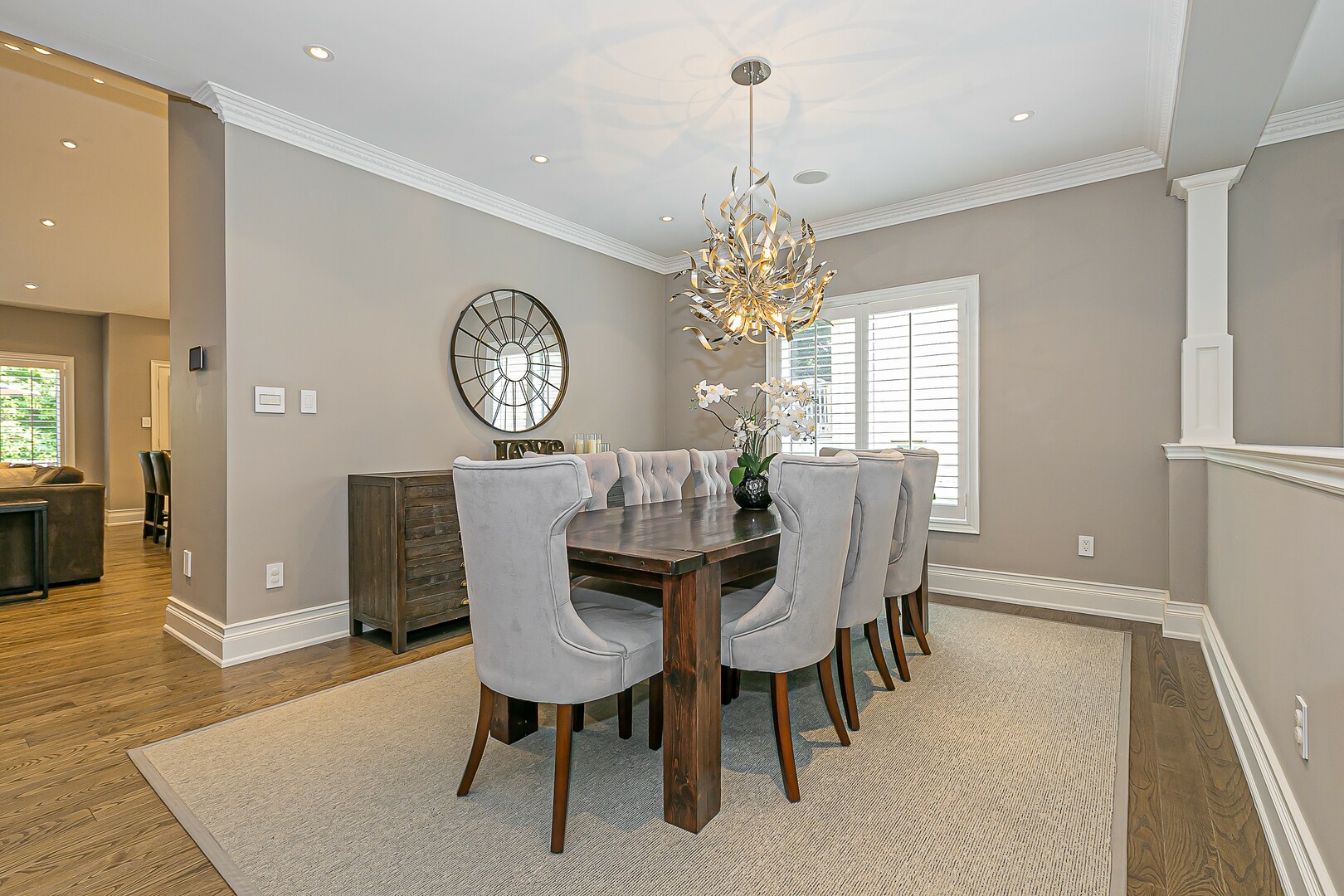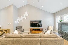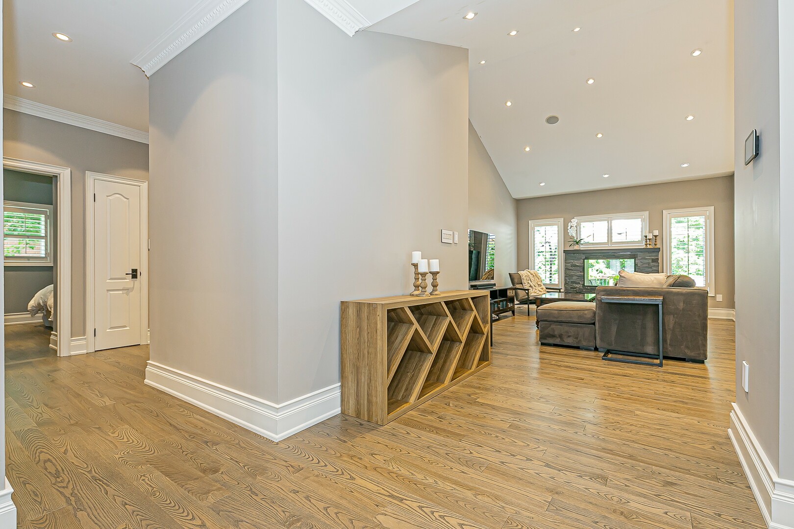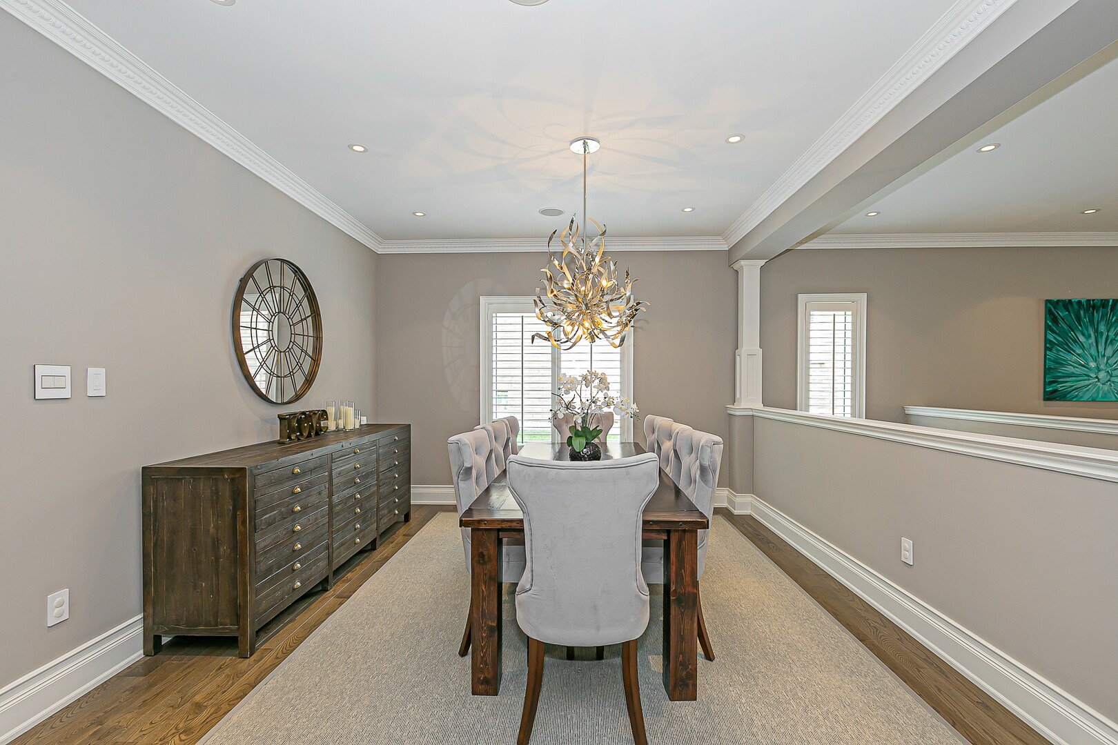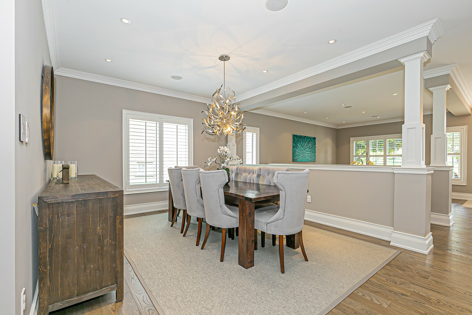 Step inside to a spacious, light-filled foyer with a double-door entry and a walk-in closet. The open-concept main floor is perfect for both everyday living and entertaining. The formal living room boasts elegant crown moulding and a large window overlooking the front yard. The dining room offers a warm and inviting space, perfect for gathering with family and friends. The chef-inspired kitchen is the heart of the home, complete with stainless steel appliances, pot filler, quartz countertops, custom cabinetry, a large island with breakfast bar, pendant lighting and a walkout to the back deck. The adjoining great room features a vaulted ceiling and a cozy double-sided fireplace that can be enjoyed from both indoors and out. A powder room is conveniently located off the main living area.
