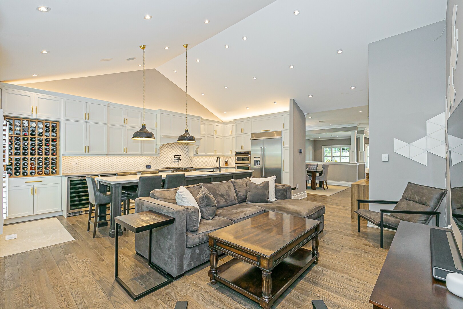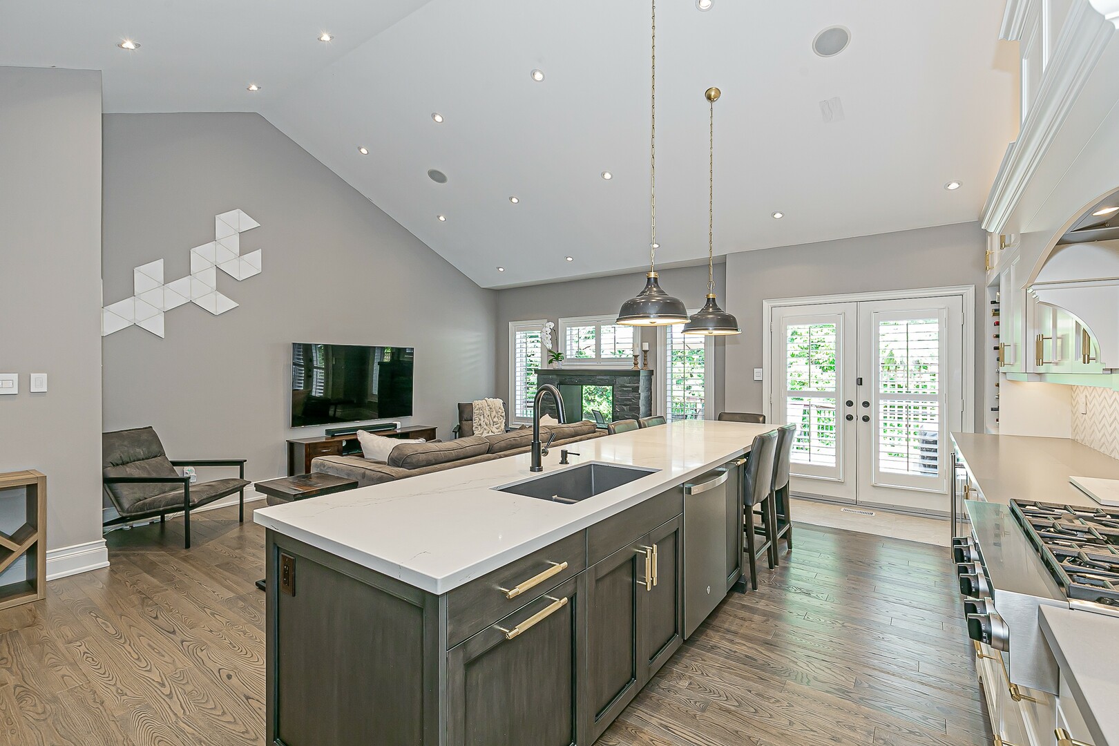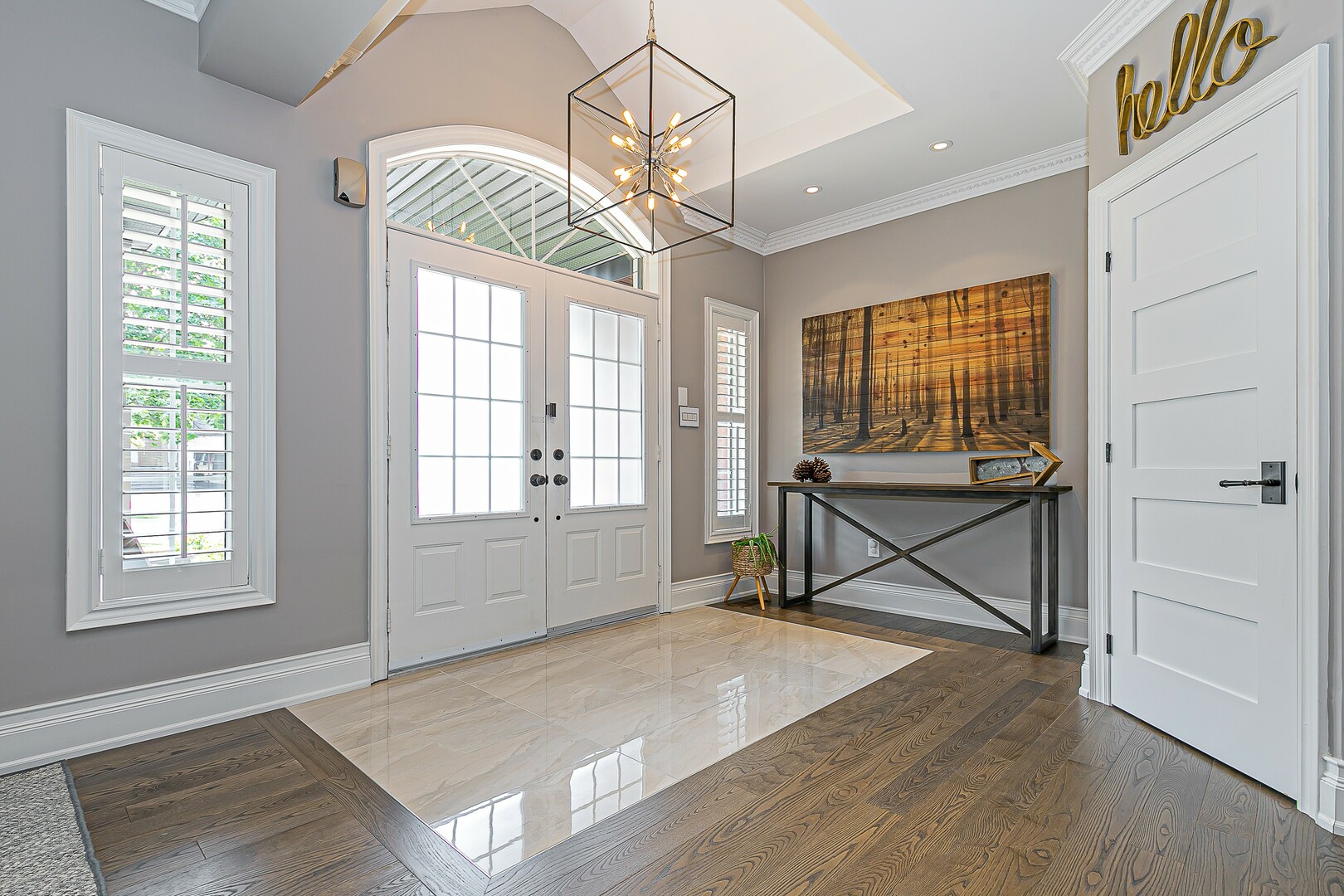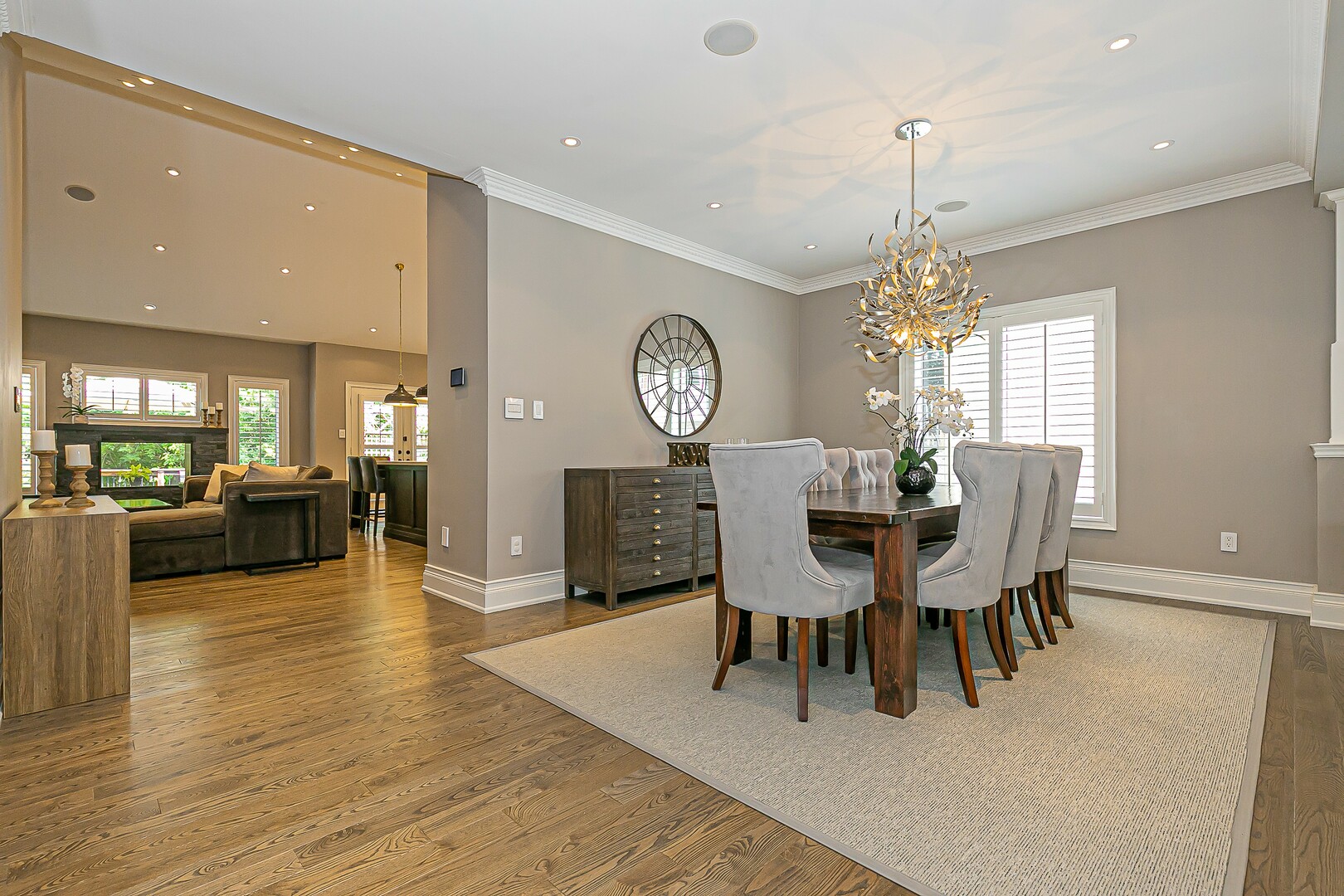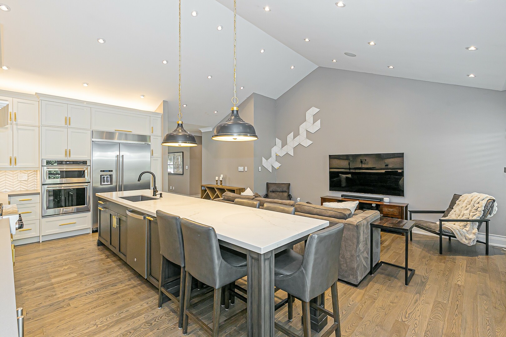 Step inside to a spacious, light-filled foyer with a double-door entry and a walk-in closet. The open-concept main floor is perfect for both everyday living and entertaining. The formal living room boasts elegant crown moulding and a large window overlooking the front yard. The dining room offers a warm and inviting space, perfect for gathering with family and friends. The chef-inspired kitchen is the heart of the home, complete with stainless steel appliances, pot filler, quartz countertops, custom cabinetry, a large island with breakfast bar, pendant lighting and a walkout to the back deck. The adjoining great room features a vaulted ceiling and a cozy double-sided fireplace that can be enjoyed from both indoors and out. A powder room is conveniently located off the main living area.