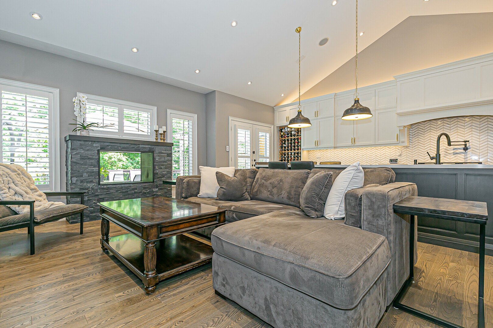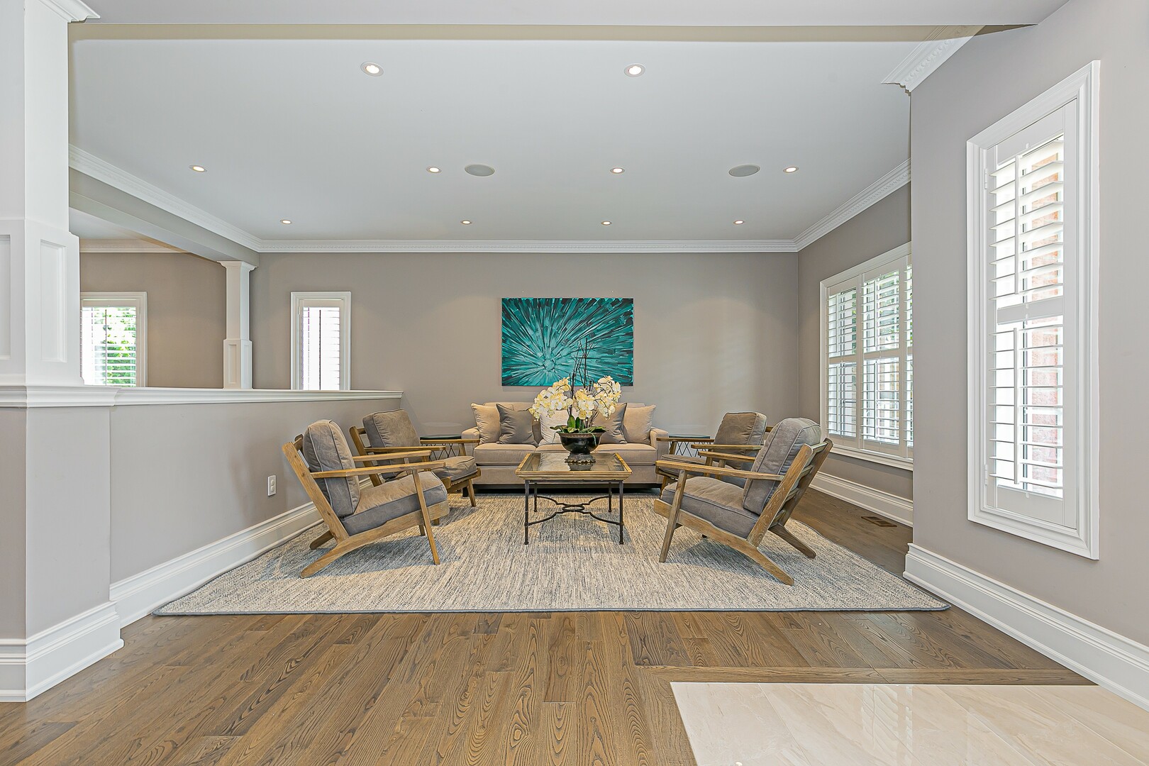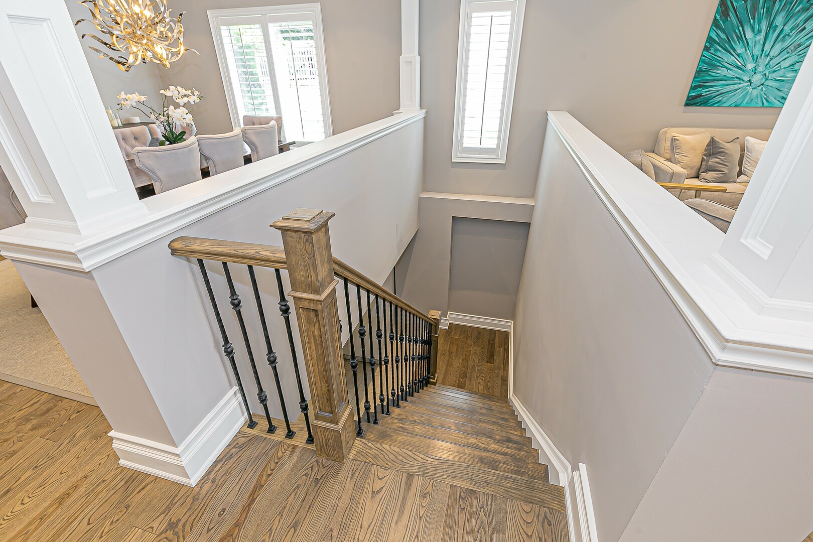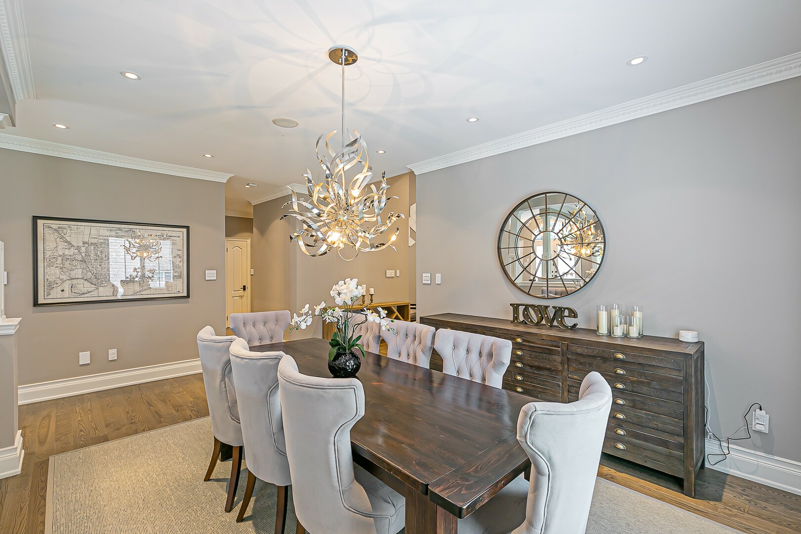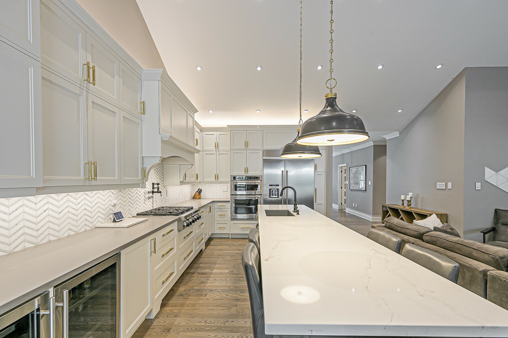 Step inside to a spacious, light-filled foyer with a double-door entry and a walk-in closet. The open-concept main floor is perfect for both everyday living and entertaining. The formal living room boasts elegant crown moulding and a large window overlooking the front yard. The dining room offers a warm and inviting space, perfect for gathering with family and friends. The chef-inspired kitchen is the heart of the home, complete with stainless steel appliances, pot filler, quartz countertops, custom cabinetry, a large island with breakfast bar, pendant lighting and a walkout to the back deck. The adjoining great room features a vaulted ceiling and a cozy double-sided fireplace that can be enjoyed from both indoors and out. A powder room is conveniently located off the main living area.