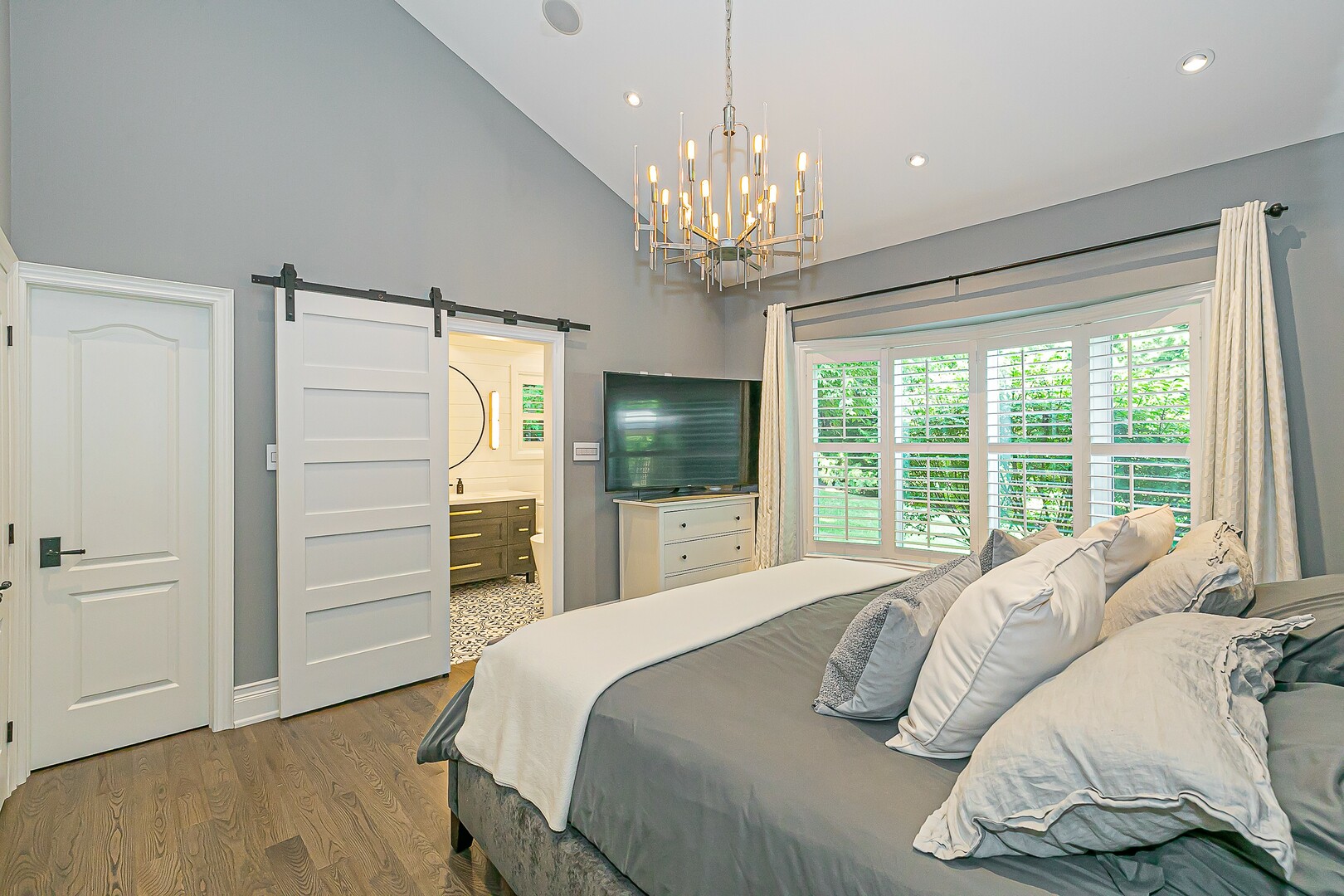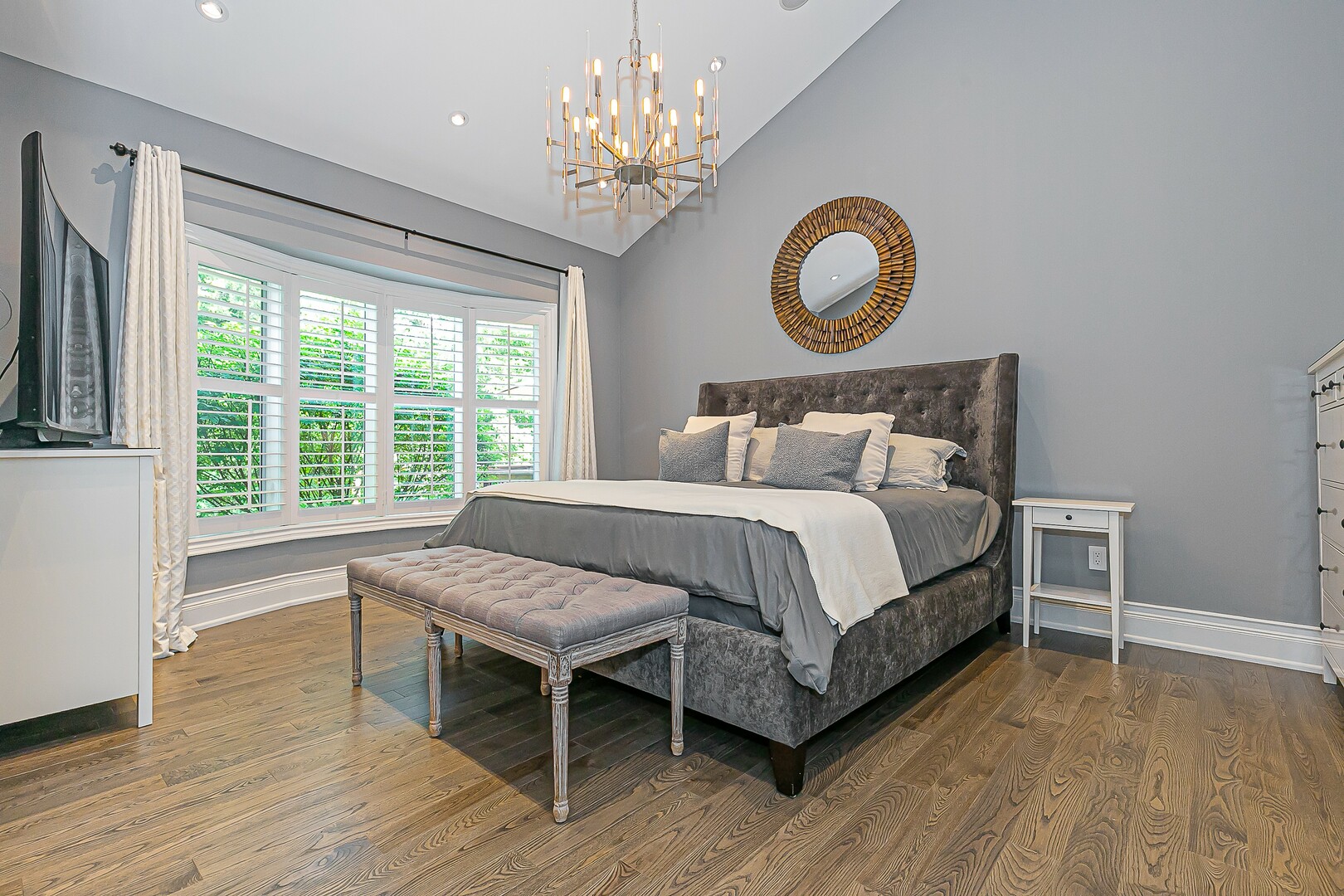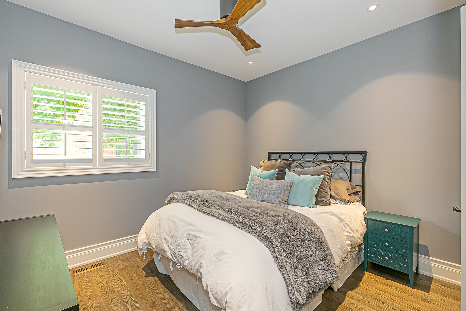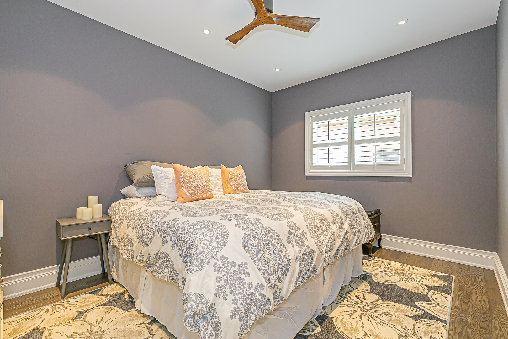 The serene primary bedroom retreat features a vaulted ceiling, his and hers closets- one of which is a walk-in and a spa-like four piece ensuite with a freestanding tub and a glass-enclosed shower with rain showerhead and a handheld. Two additional bedrooms feature pot lights, ceiling fans, closets and share a stylish four piece bathroom. The laundry/mudroom is thoughtfully designed with custom cabinetry, quartz countertops, a built-in bench with hooks and direct access to the double car garage. Beautiful hardwood floors run throughout the main level. California shutters adorn this home enhancing both style and privacy. A built-in sound system adds an extra touch of luxury.