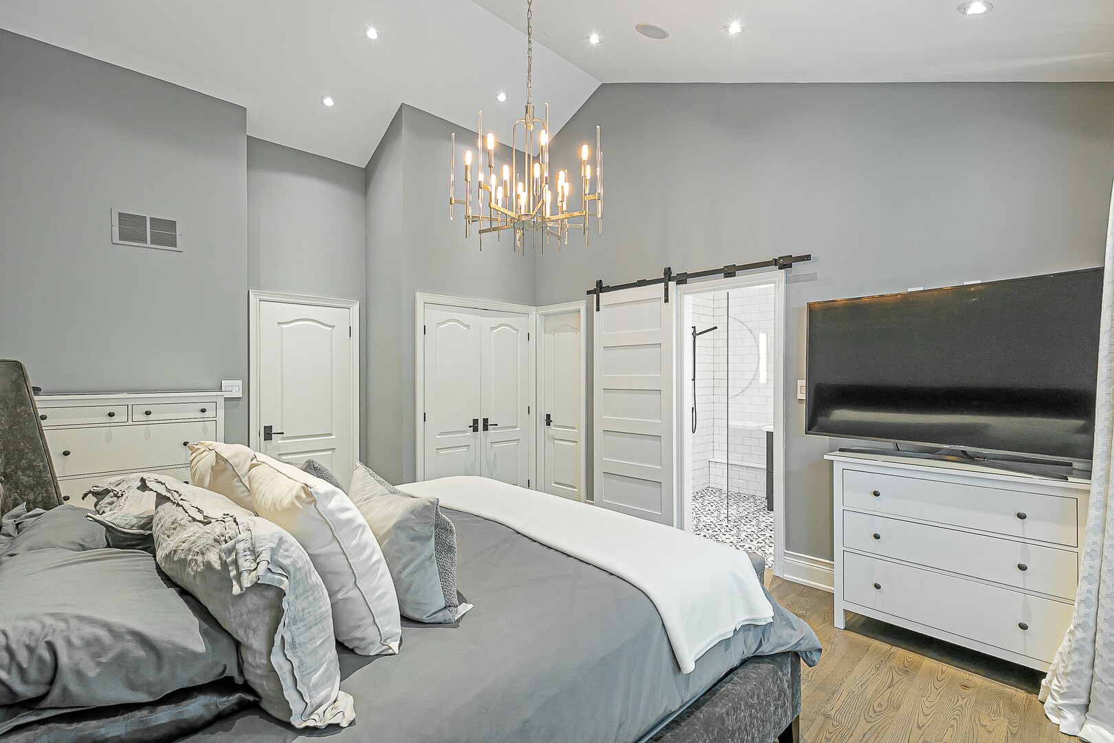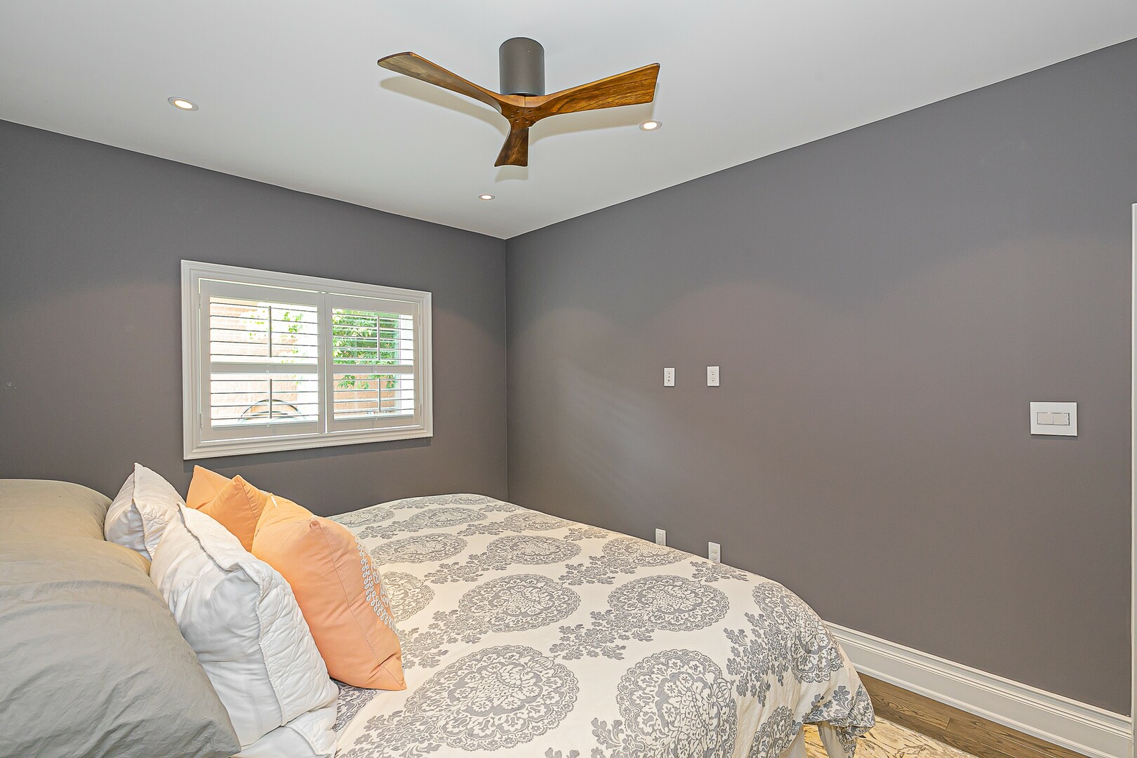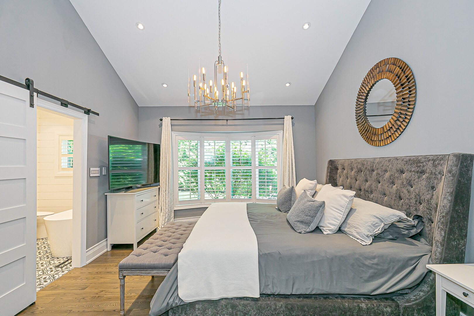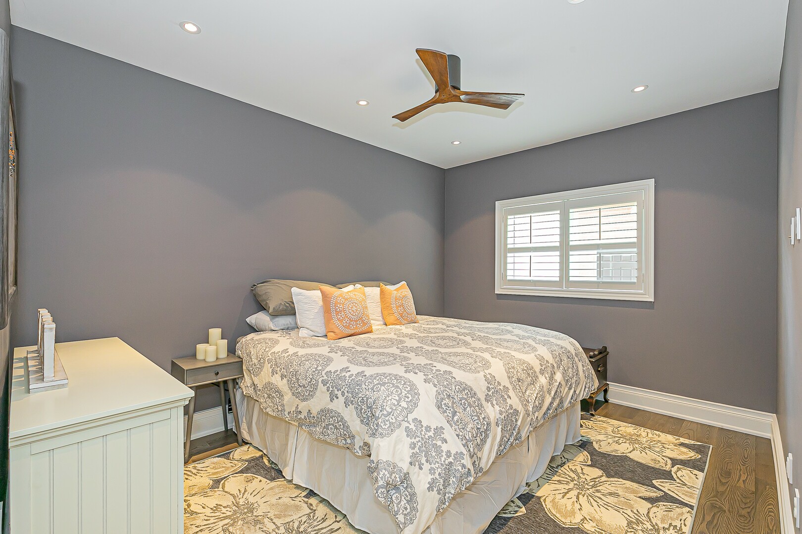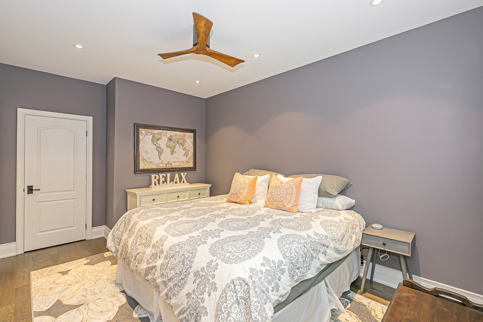 The serene primary bedroom retreat features a vaulted ceiling, his and hers closets- one of which is a walk-in and a spa-like four piece ensuite with a freestanding tub and a glass-enclosed shower with rain showerhead and a handheld. Two additional bedrooms feature pot lights, ceiling fans, closets and share a stylish four piece bathroom. The laundry/mudroom is thoughtfully designed with custom cabinetry, quartz countertops, a built-in bench with hooks and direct access to the double car garage. Beautiful hardwood floors run throughout the main level. California shutters adorn this home enhancing both style and privacy. A built-in sound system adds an extra touch of luxury.