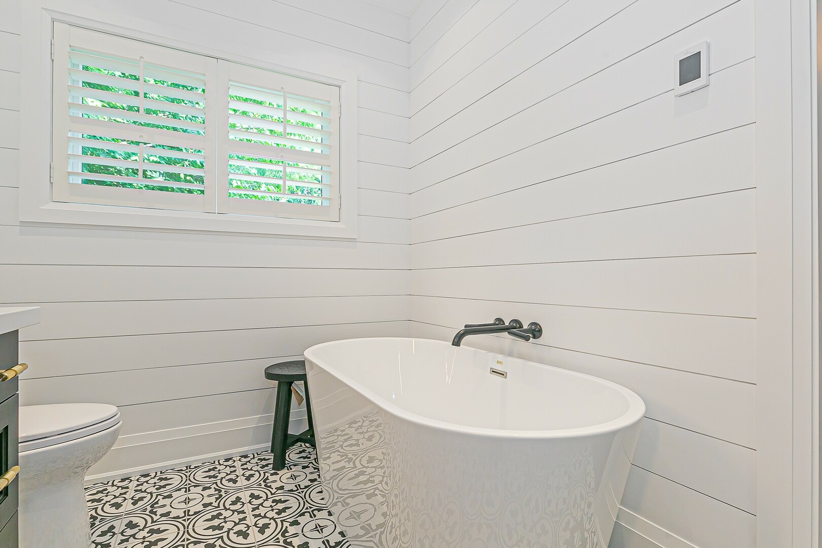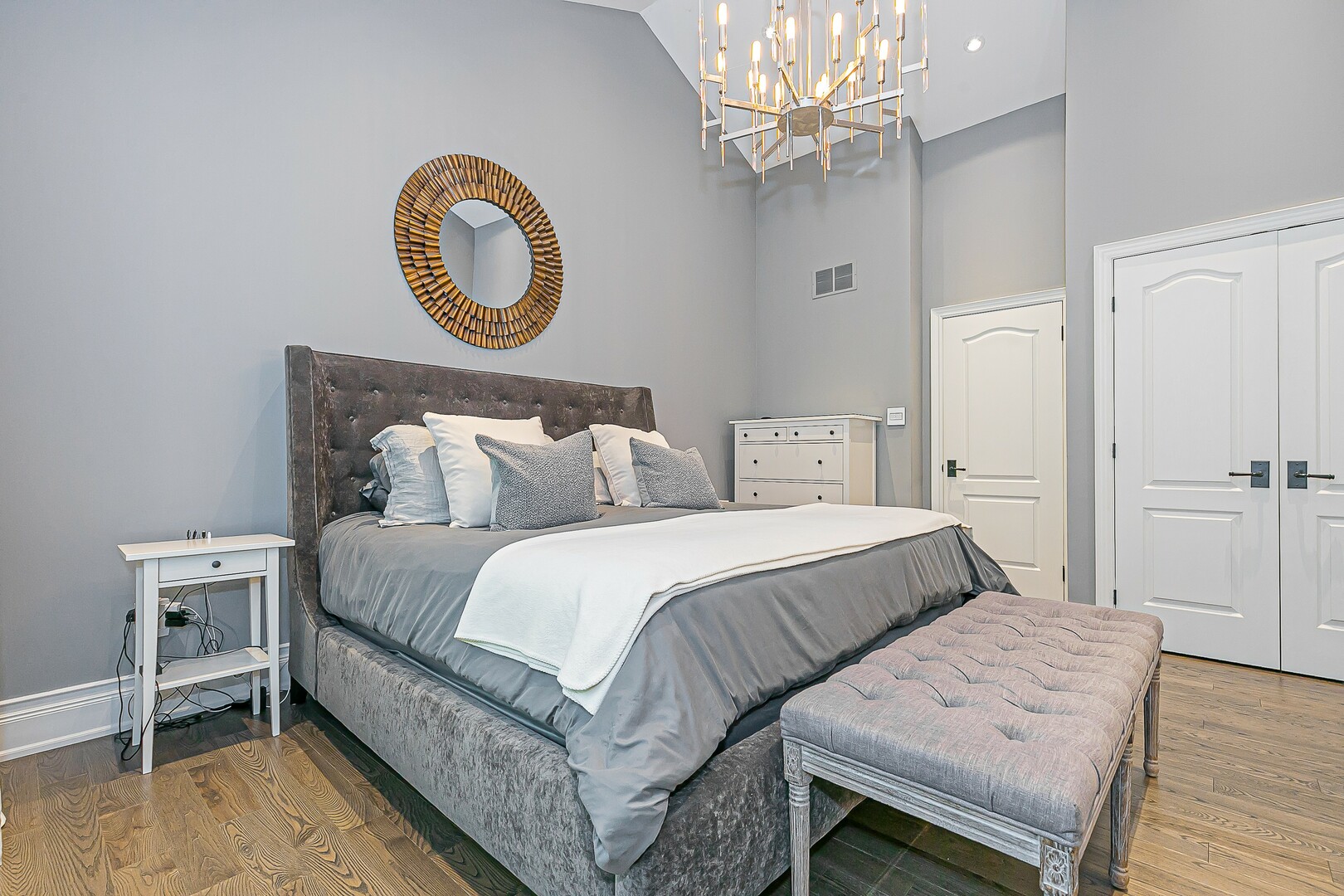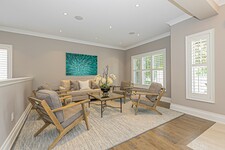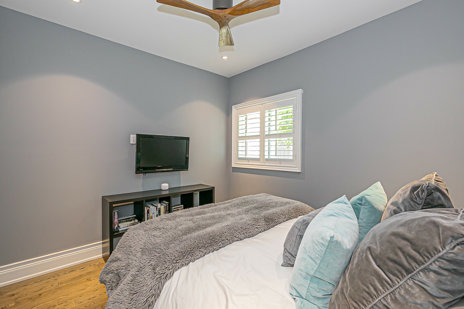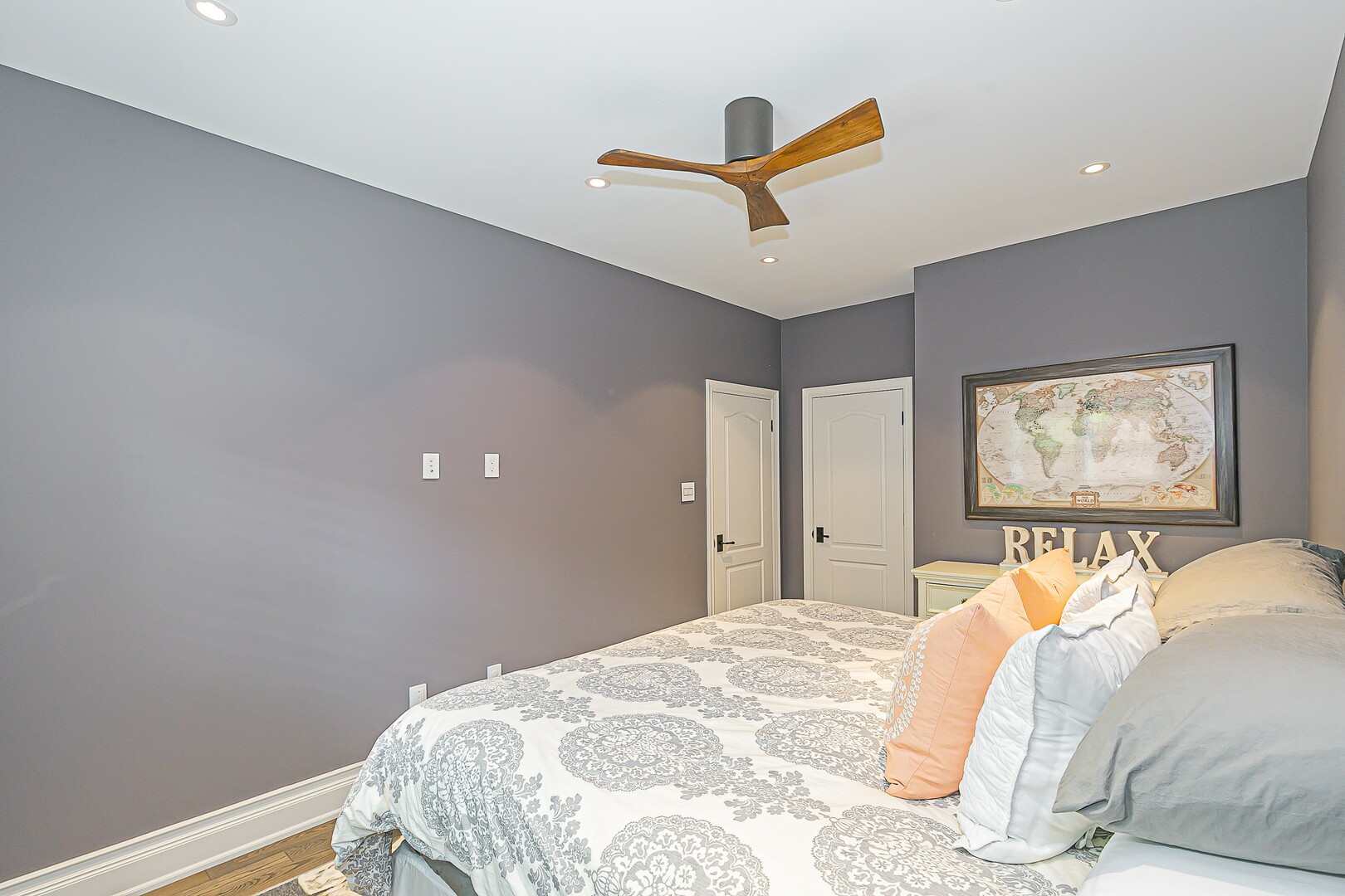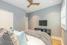 The serene primary bedroom retreat features a vaulted ceiling, his and hers closets- one of which is a walk-in and a spa-like four piece ensuite with a freestanding tub and a glass-enclosed shower with rain showerhead and a handheld. Two additional bedrooms feature pot lights, ceiling fans, closets and share a stylish four piece bathroom. The laundry/mudroom is thoughtfully designed with custom cabinetry, quartz countertops, a built-in bench with hooks and direct access to the double car garage. Beautiful hardwood floors run throughout the main level. California shutters adorn this home enhancing both style and privacy. A built-in sound system adds an extra touch of luxury.