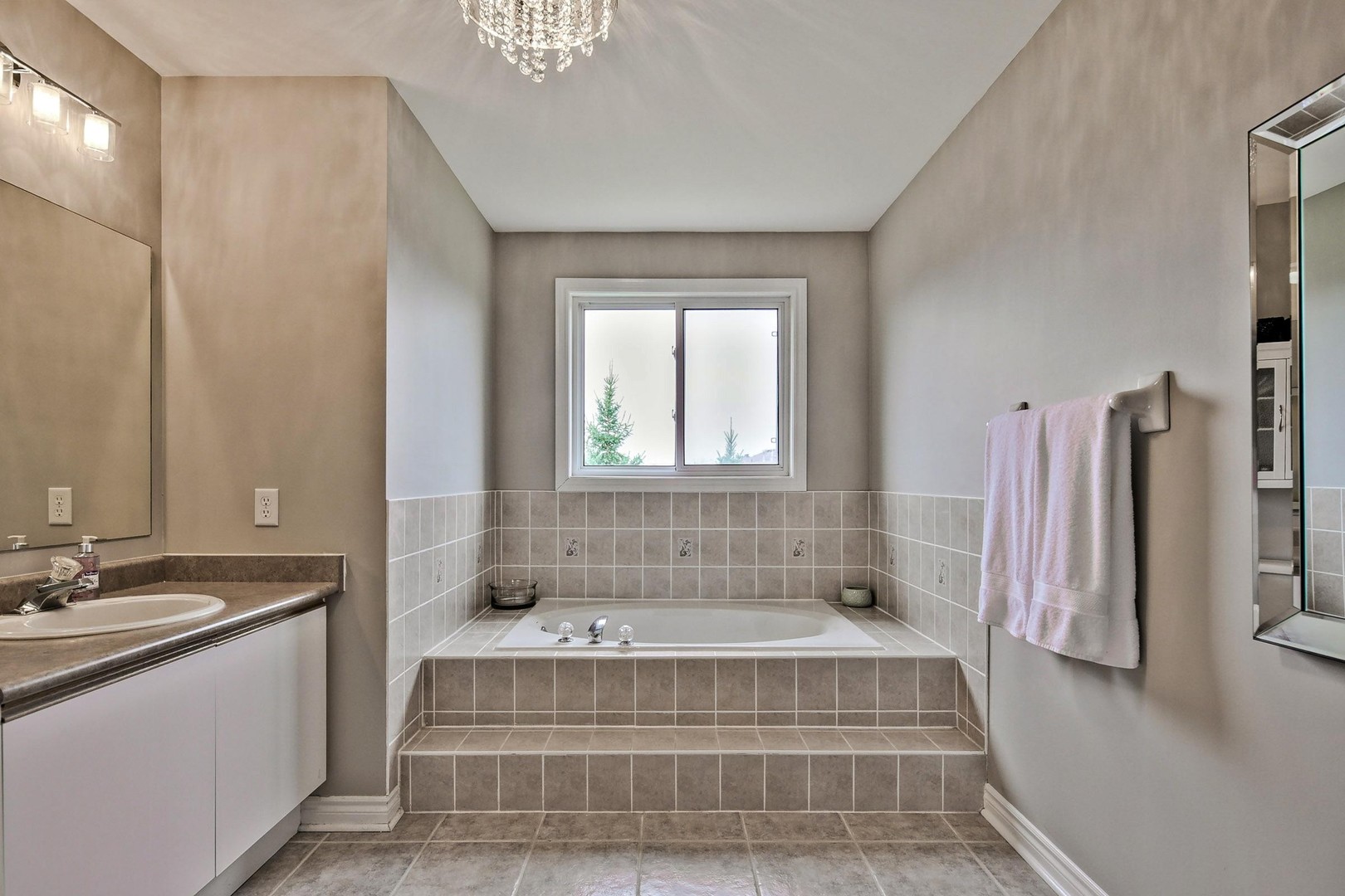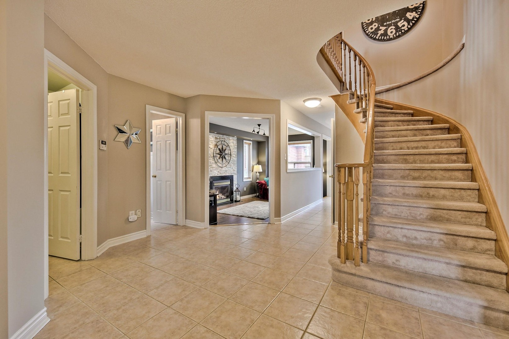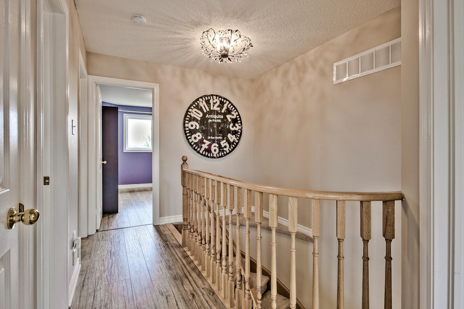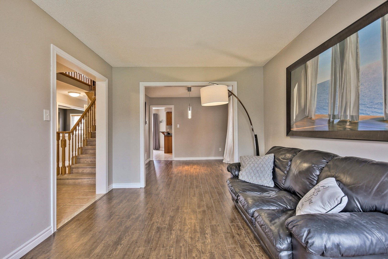 Spacious foyer, formal living room and dining room, sunken fam rm c/w gas fireplace. Kitchen with w/o to deck and private fenced yard. Hugh master suite with w/i closet and ensuite. 2 car attached garage with inside entry. Newly painted and new flooring.