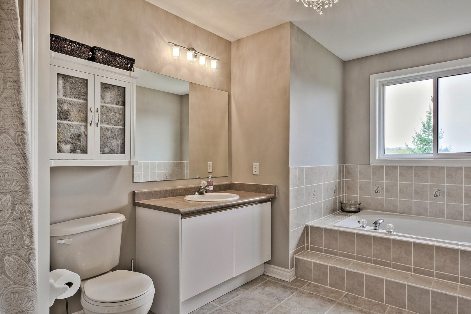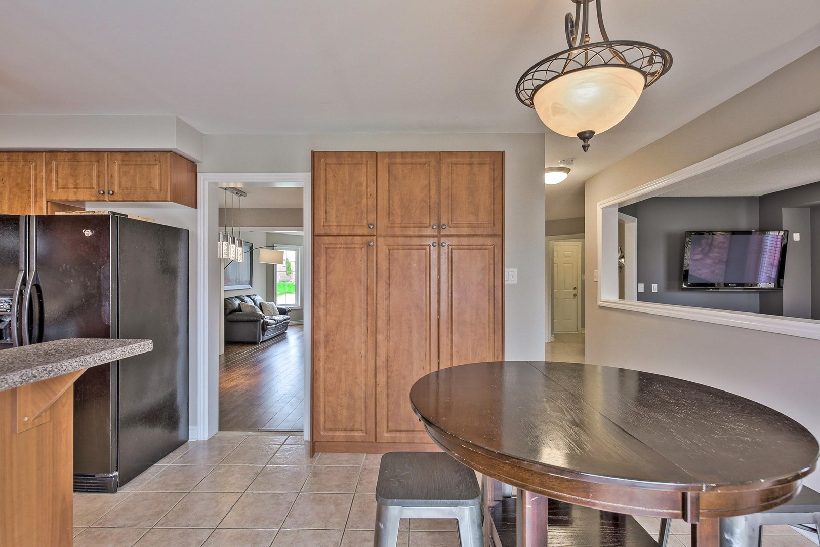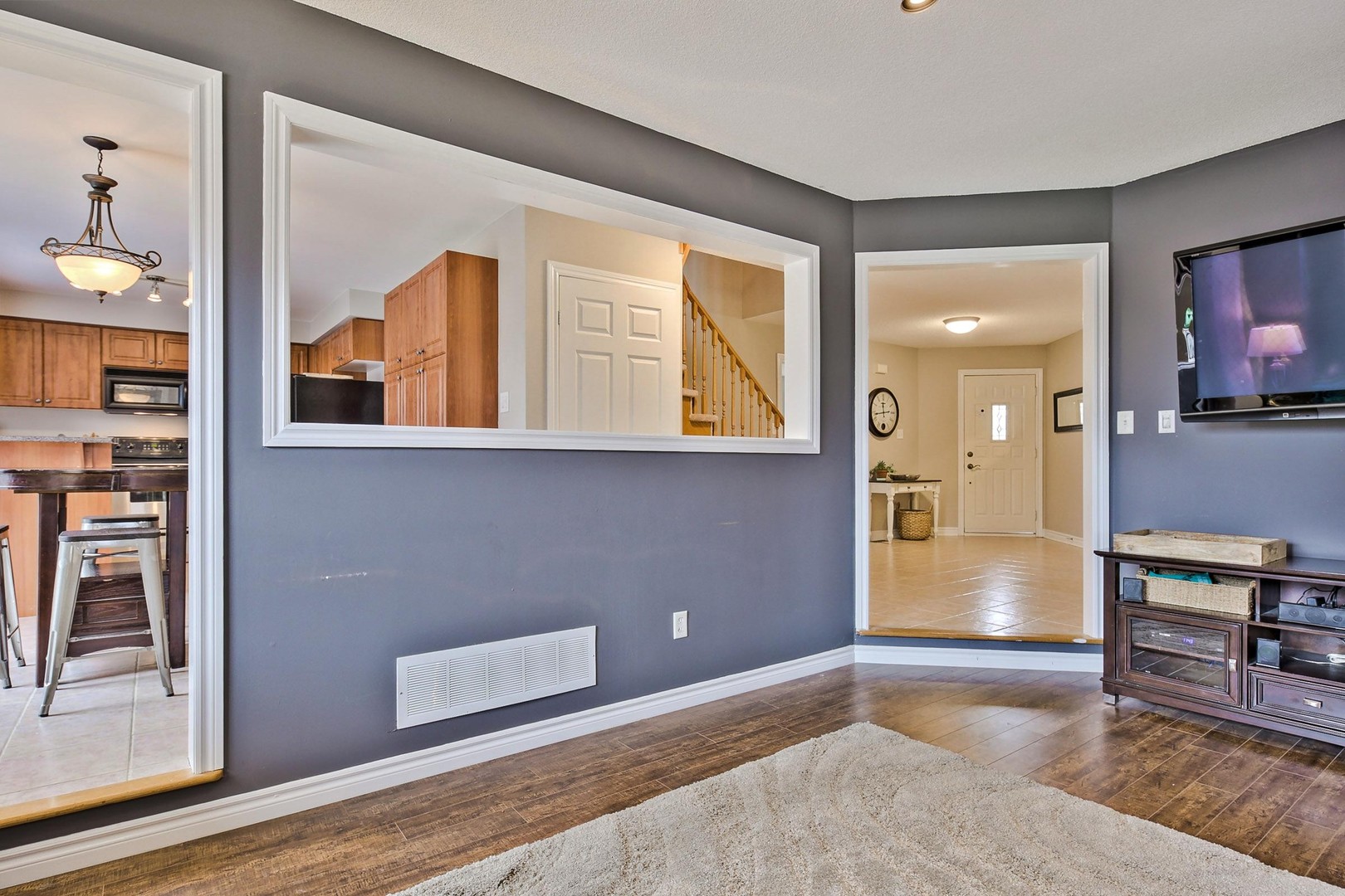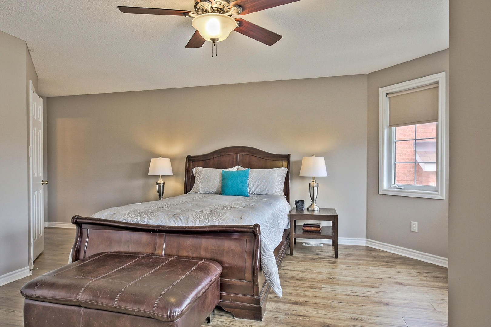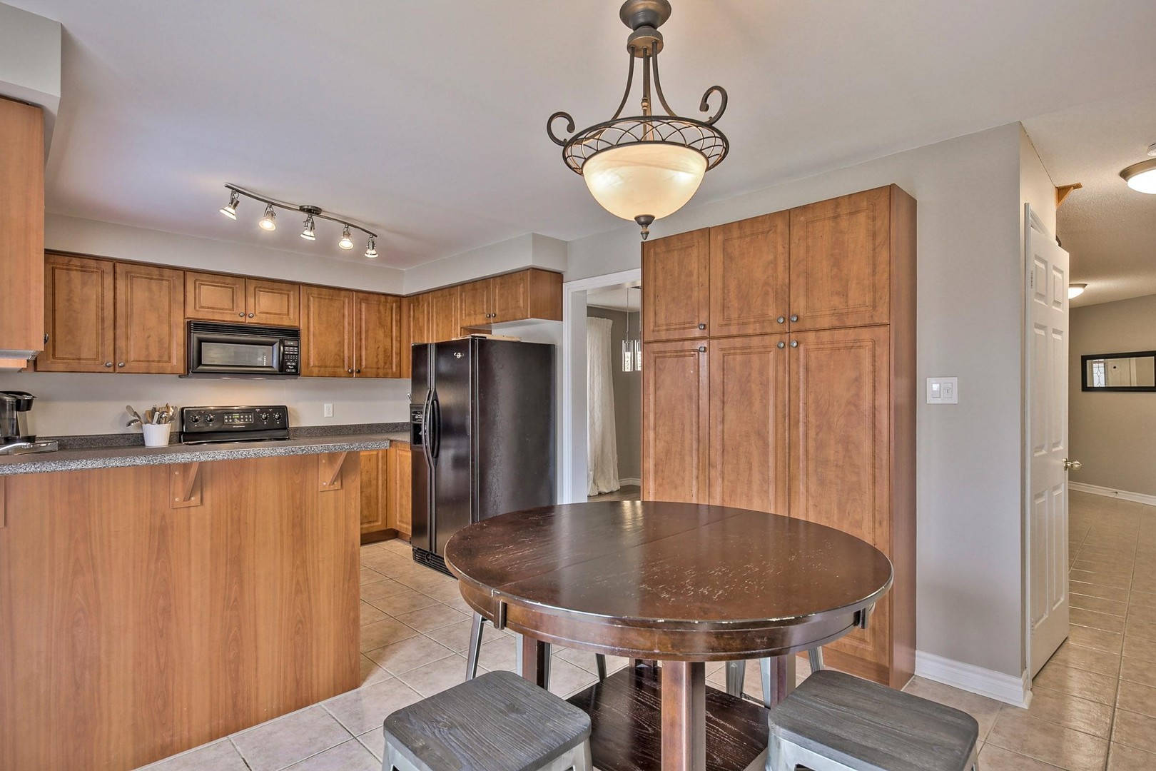 Spacious foyer, formal living room and dining room, sunken fam rm c/w gas fireplace. Kitchen with w/o to deck and private fenced yard. Hugh master suite with w/i closet and ensuite. 2 car attached garage with inside entry. Newly painted and new flooring.